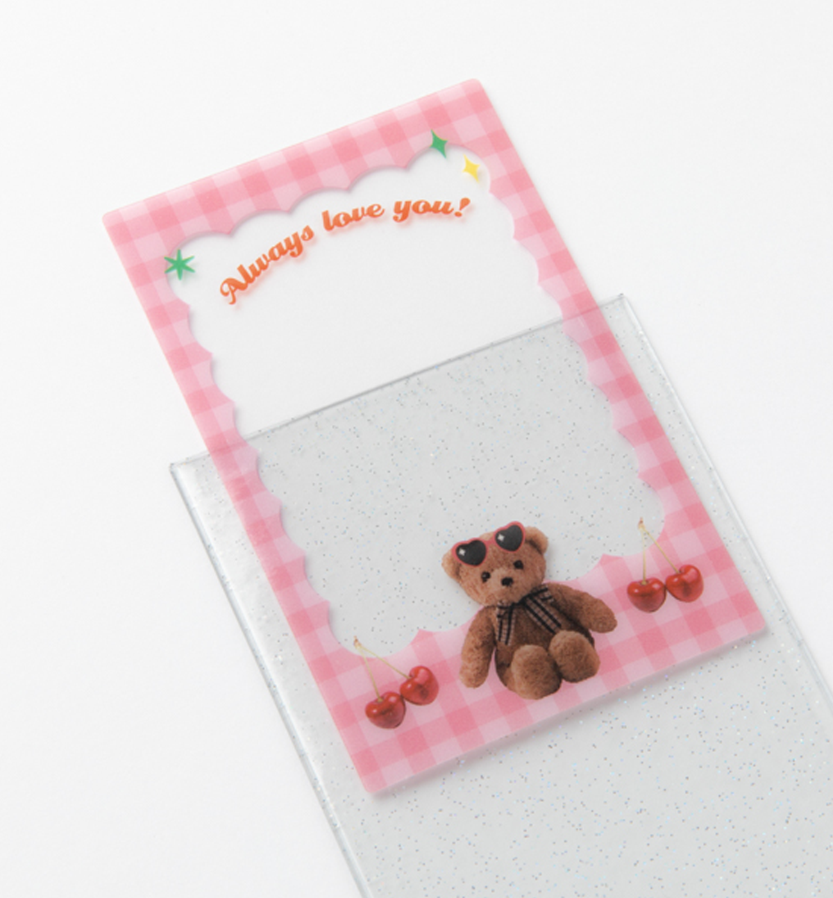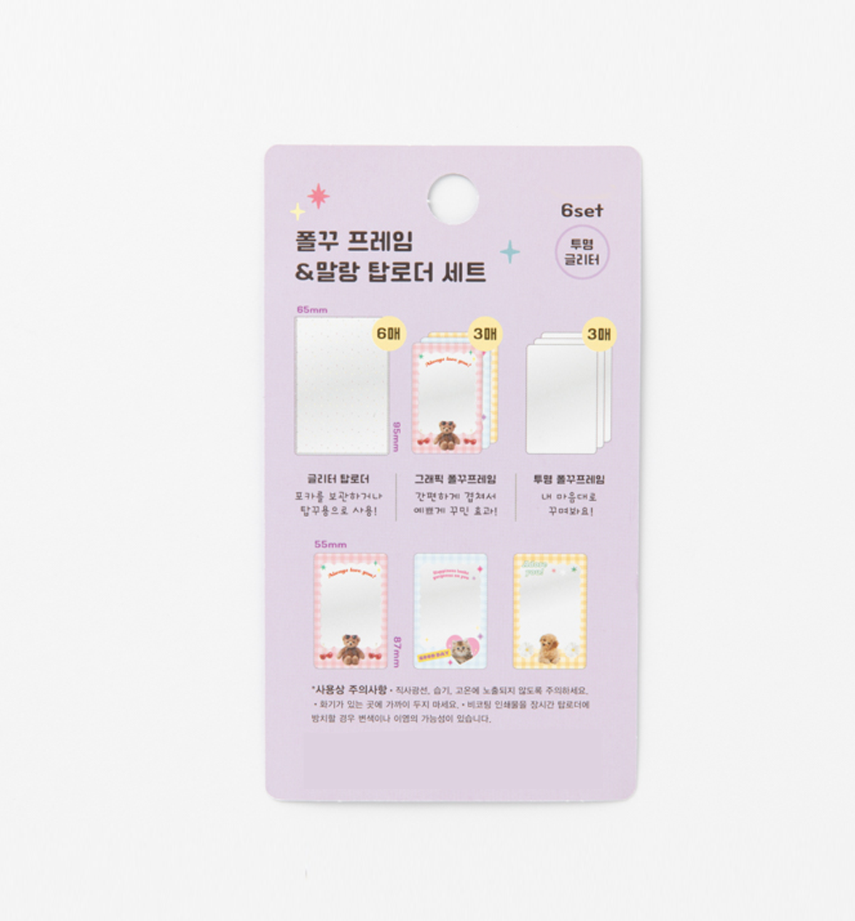 You can store photo cards in the transparent glitter toploader or use it as a top cover! The frames consists of 3 graphics frames and 3 transparent frames, which can be overlapped with a photocard and used as stickers. A wonderful photo that looks like it was decorated is completed,