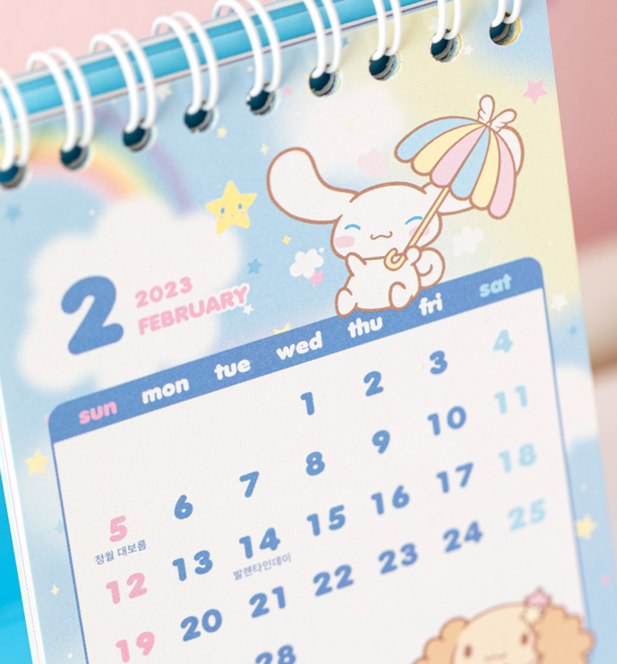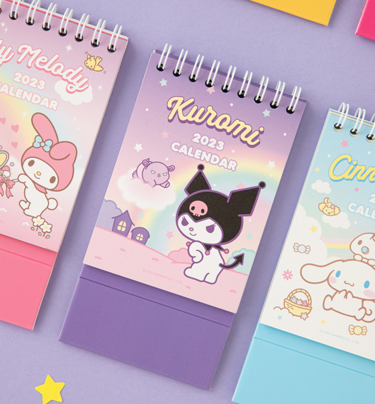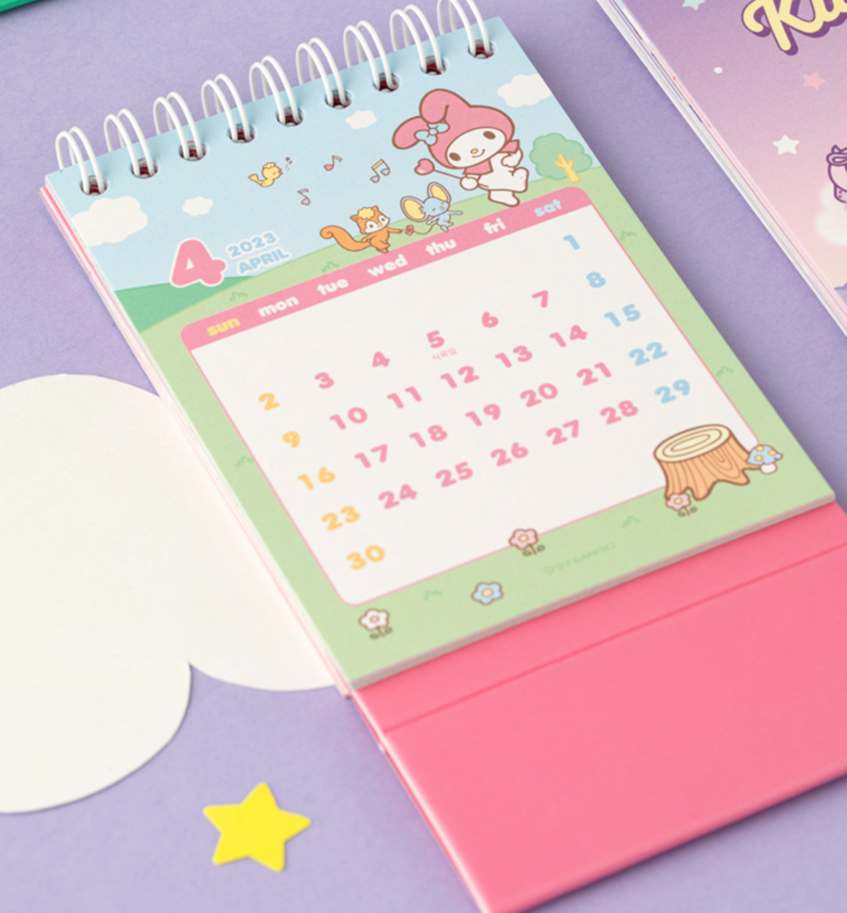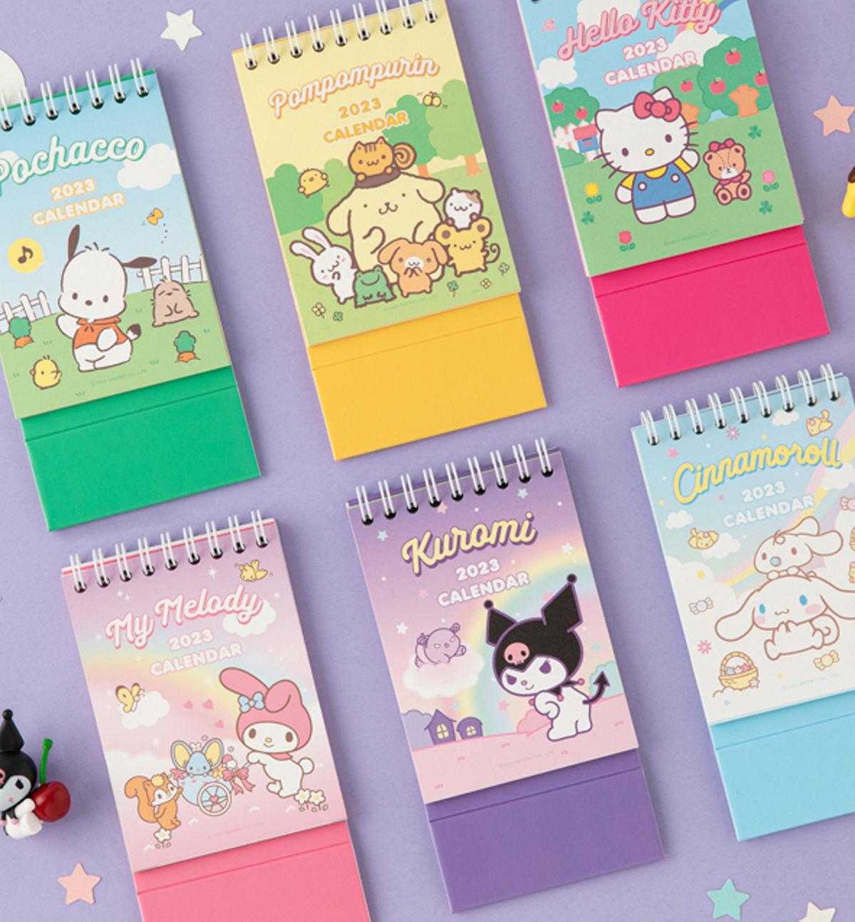 This beautiful 2023 Sanrio Mini Calendar Stand Still and Folds Flat. Ring Binding.