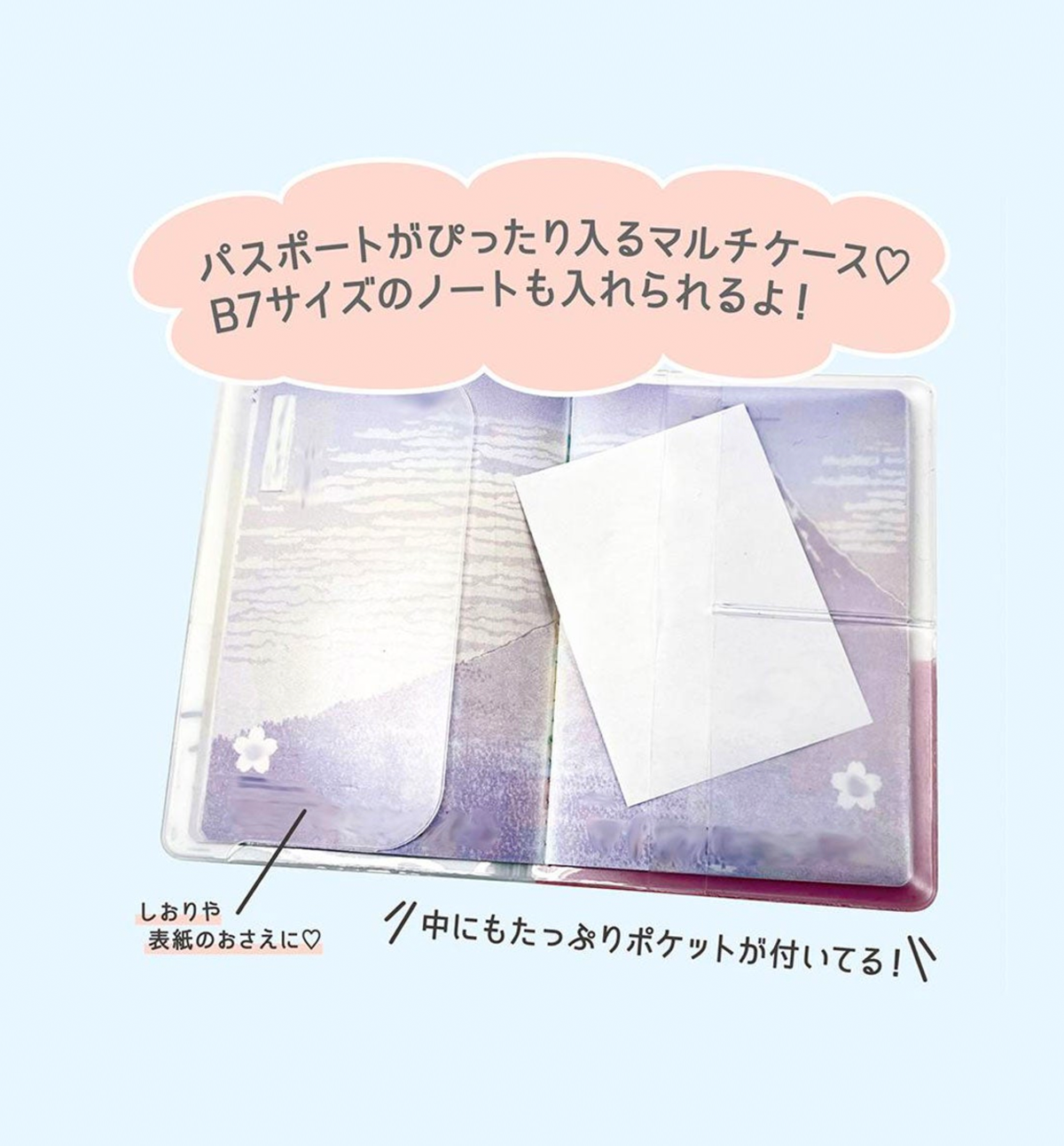 Designed to protect your important notebooks and passport from scratches and dirt, this B7 stationery multi case is both practical and cute. The character design on the front also functions as a convenient pocket, while the inside features multiple pockets for easy organization.
