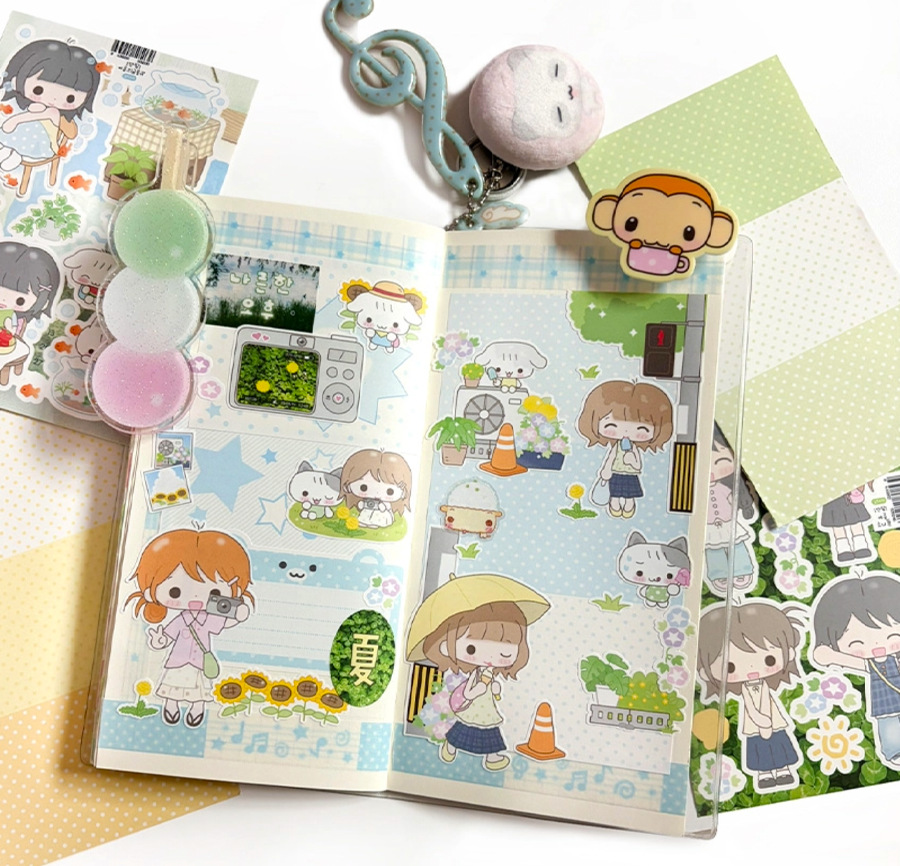A versatile sticker set featuring layout elements and patterned designs with cute graphics. Perfect for diaries, scrapbooks, and DIY projects. Easy to write on, they add depth and charm to any page.