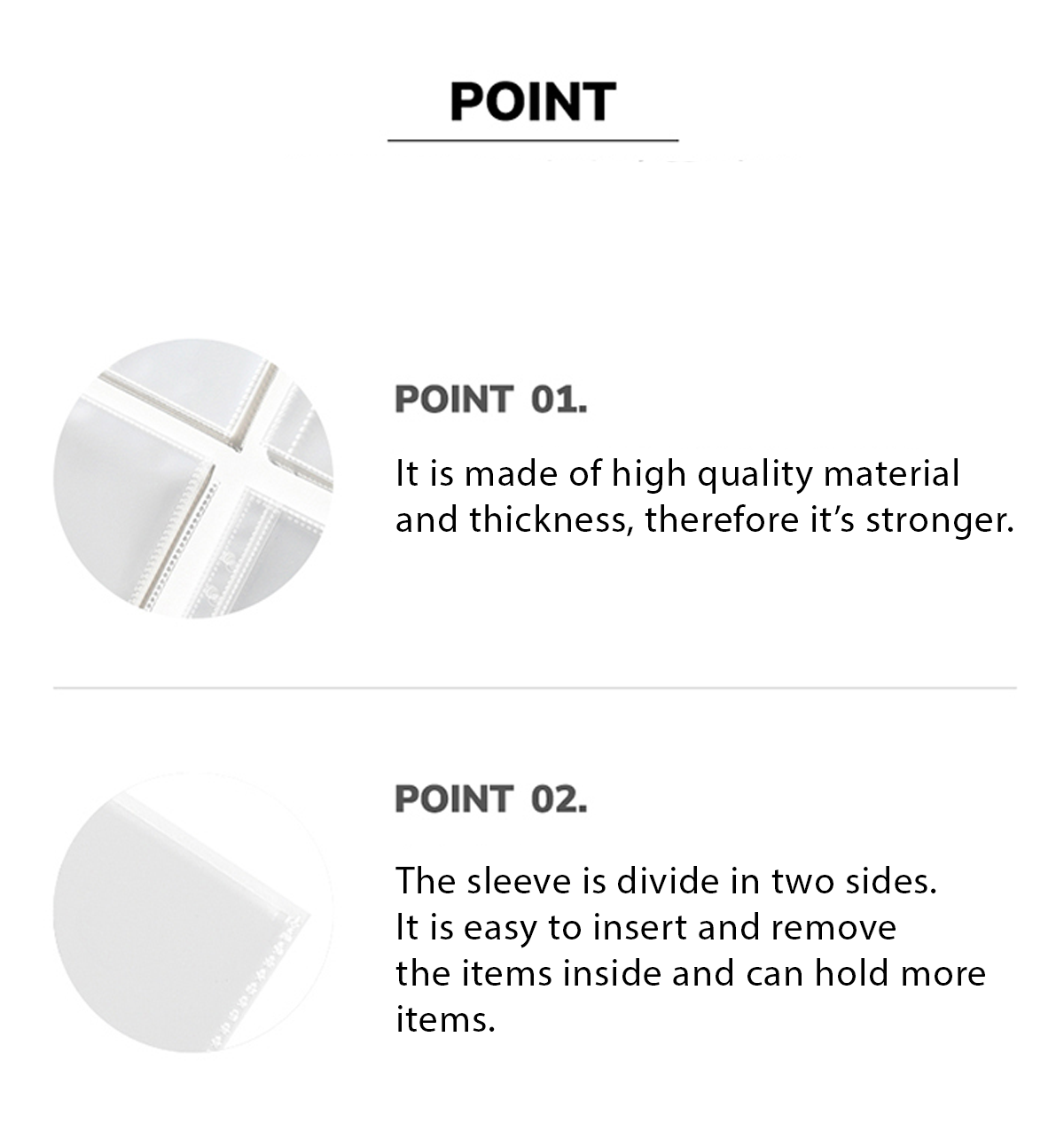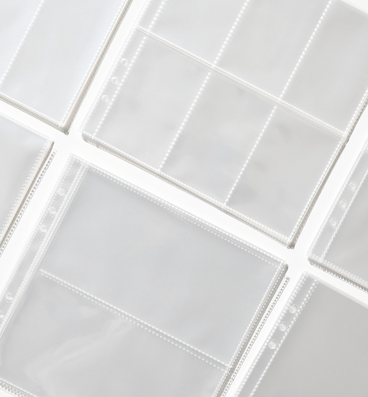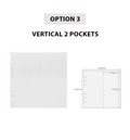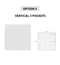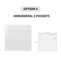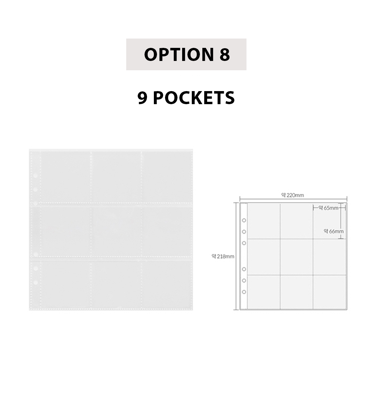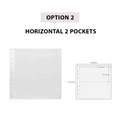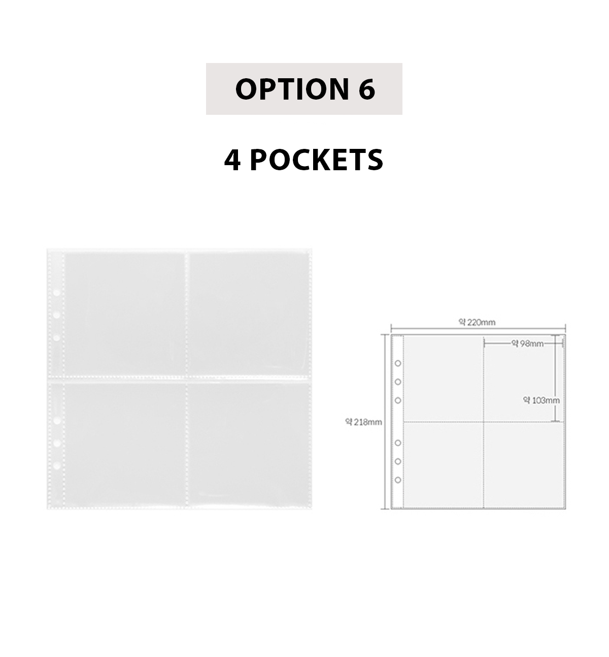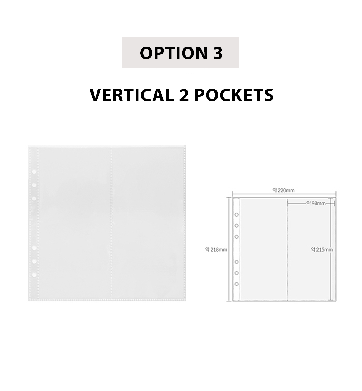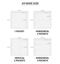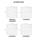 This beautiful A5 Wide Clear Pocket File comes in 8 different sleeves layout: 1 pocket, horizontal 2 pockets, vertical 2 pockets, horizontal 3 pockets, vertical 3 pockets, 4 pockets and 6 pockets. Please, see pictures for reference.