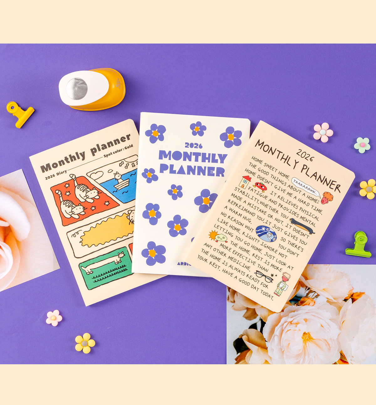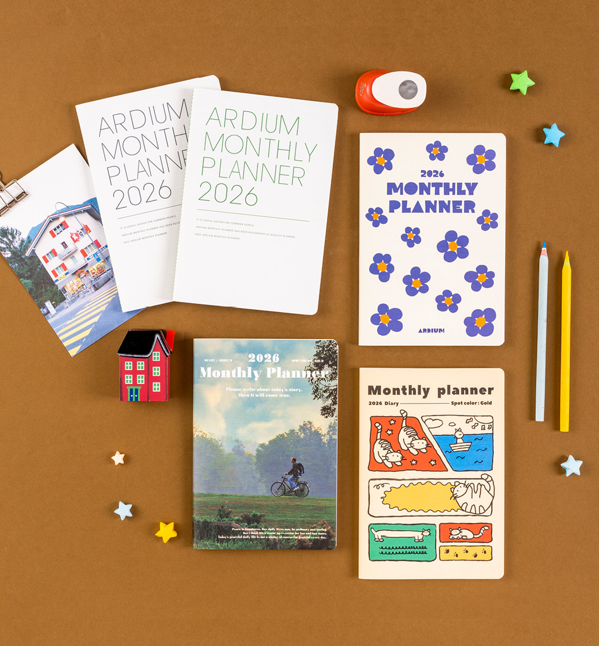 The 2026 Ardium Monthly Planner is available in 10 beautiful cover designs. It features a flat-lay design for comfortable writing, durable sewn binding, and a protective PVC cover. Stylish, practical, and perfect for planning your year ahead.