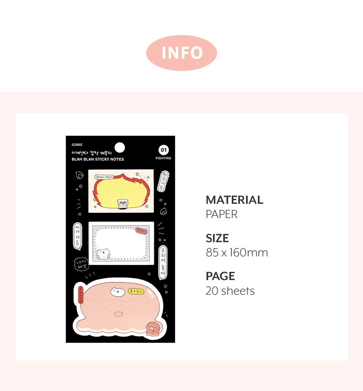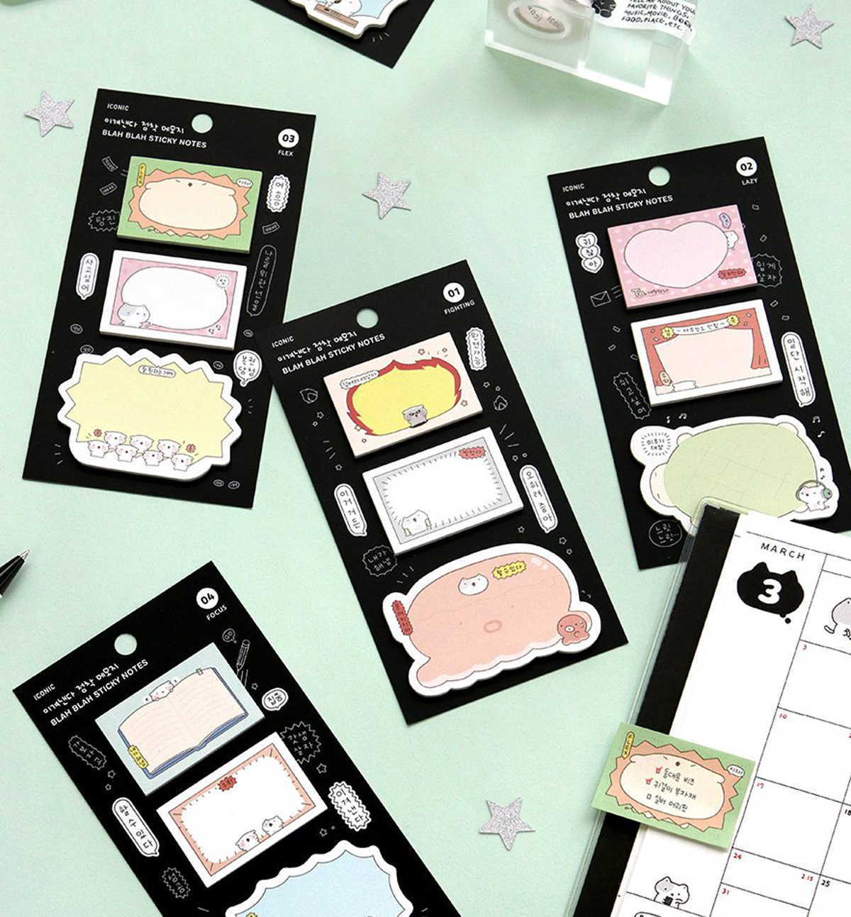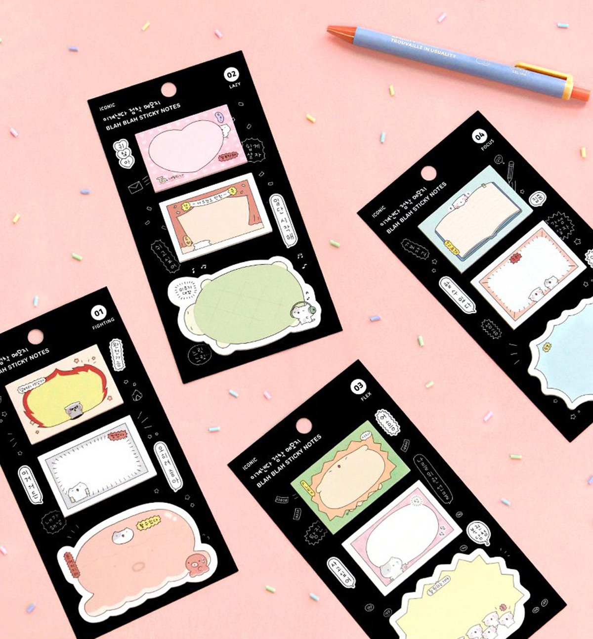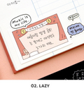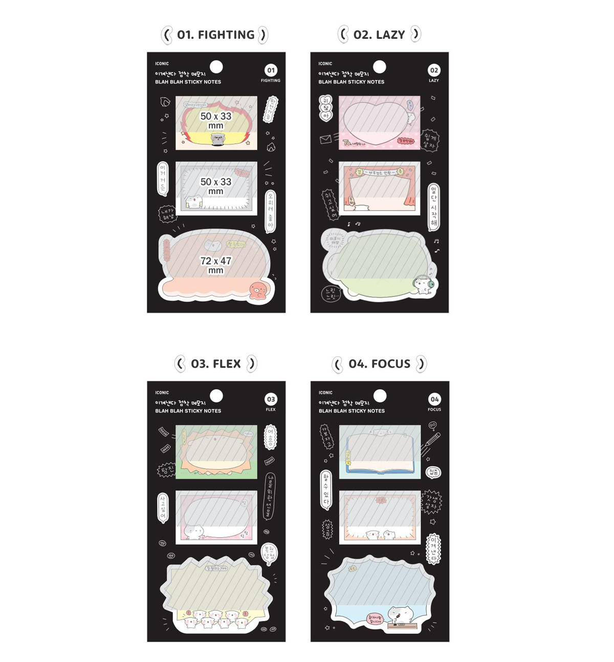 This beautiful sticky notes comes in 4 different designs: 01. Fighting, 02. Lazy, 03. Flex and 04. Focus. Please, see picture for reference.