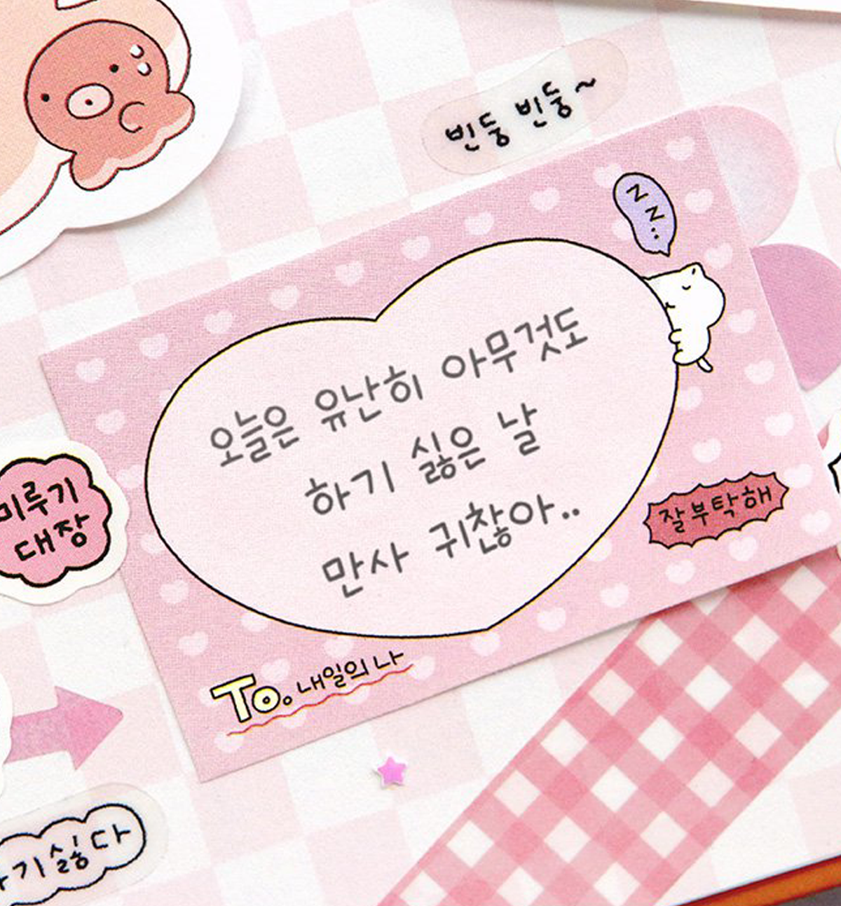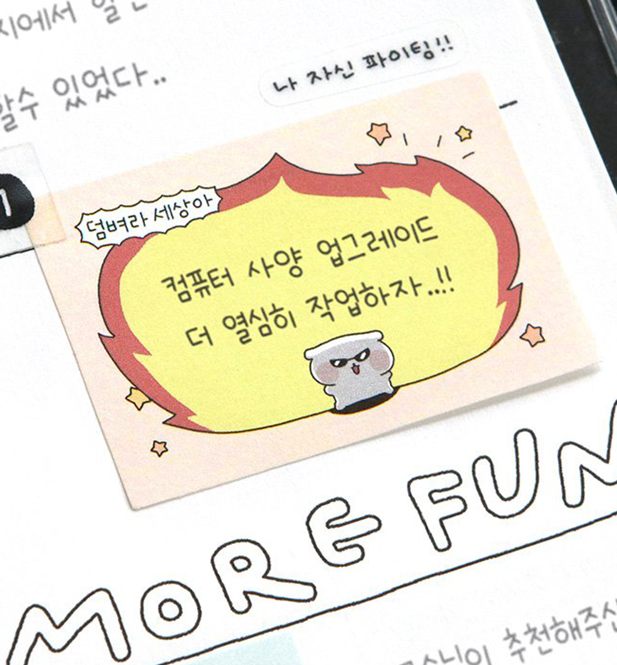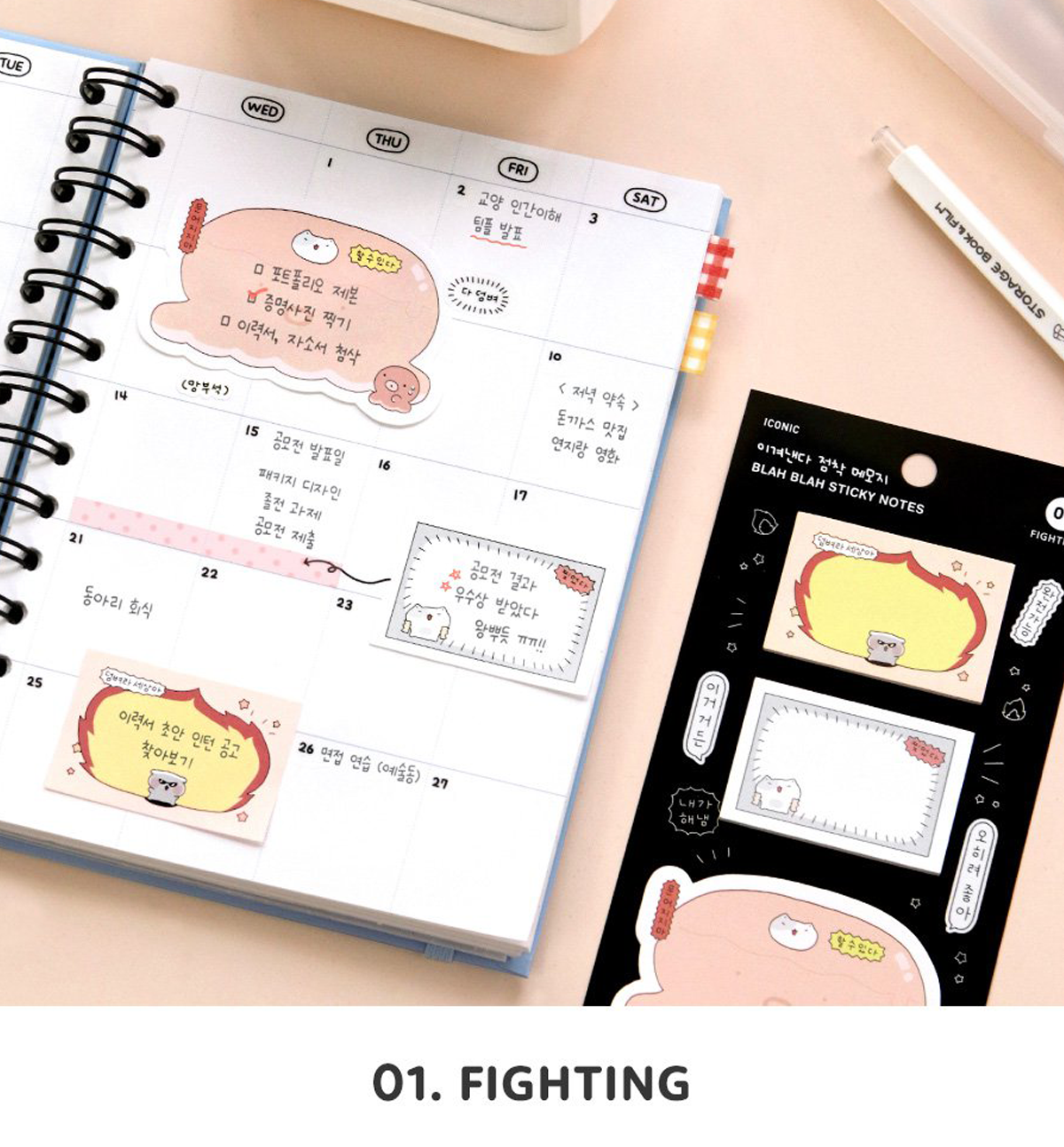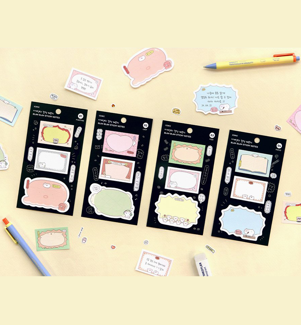 This beautiful sticky notes comes in 4 different designs: 01. Fighting, 02. Lazy, 03. Flex and 04. Focus. Please, see picture for reference.