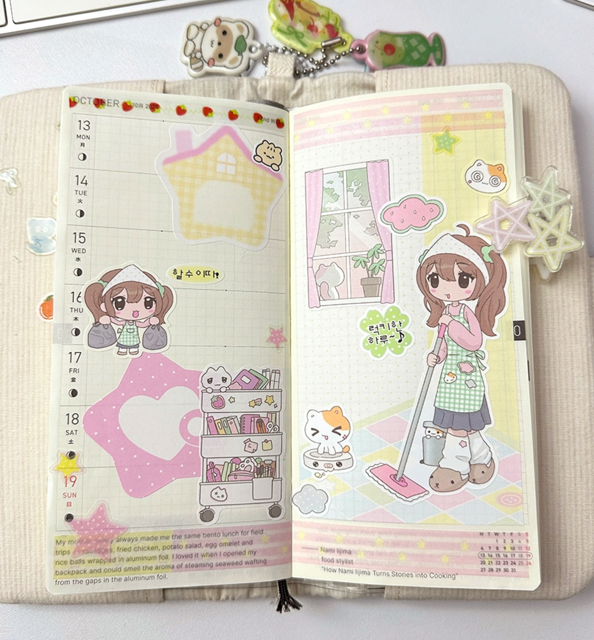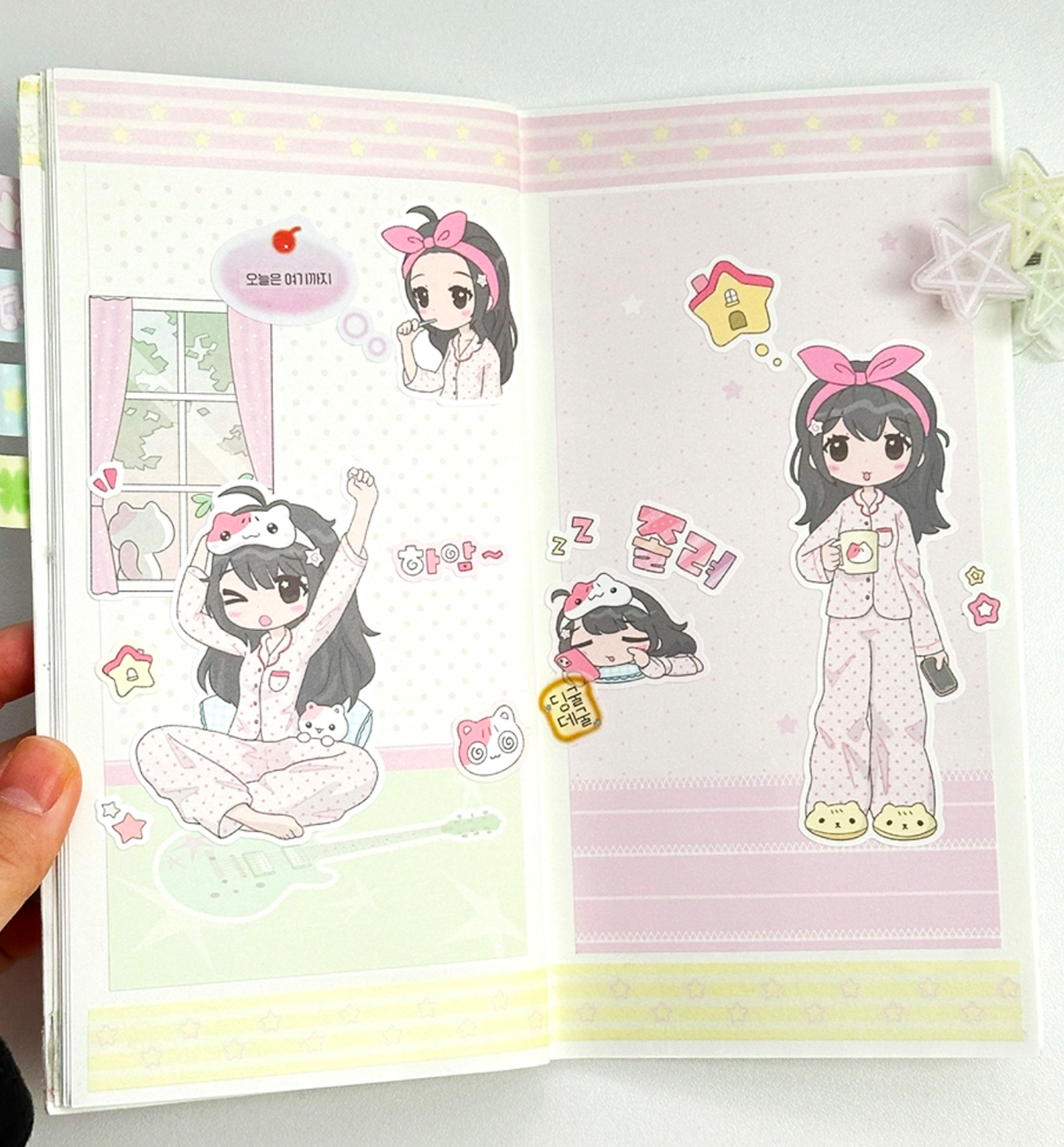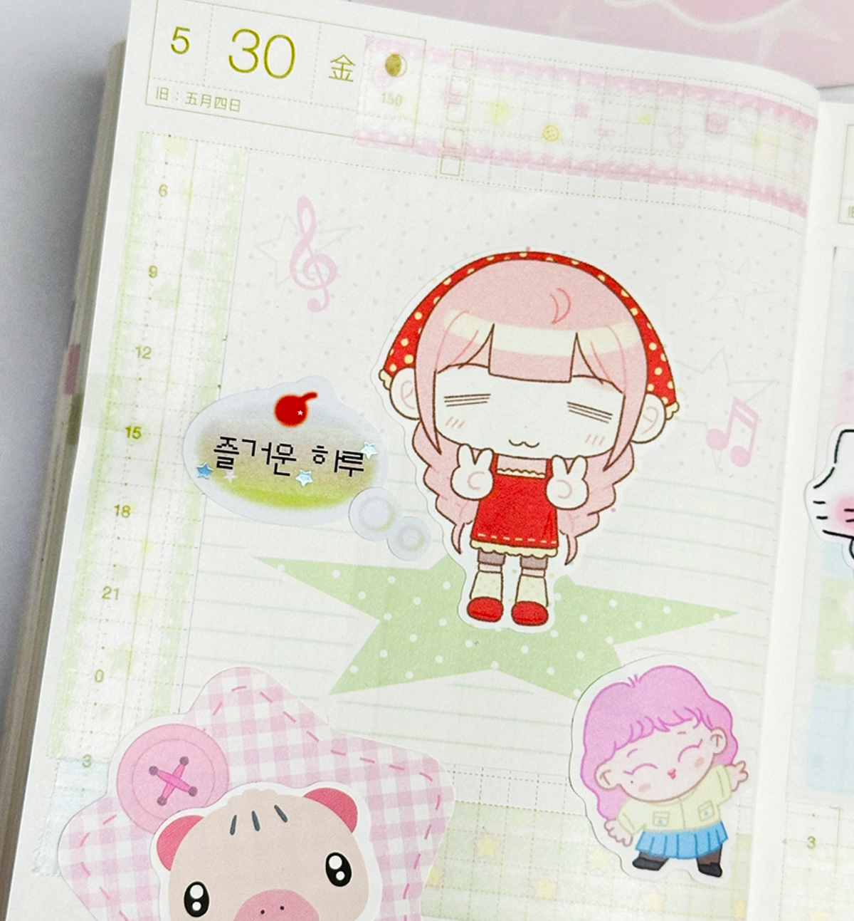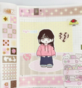 A versatile sticker set featuring layout elements and patterned designs with cute graphics. Perfect for diaries, scrapbooks, and DIY projects. Easy to write on, they add depth and charm to any page.