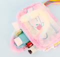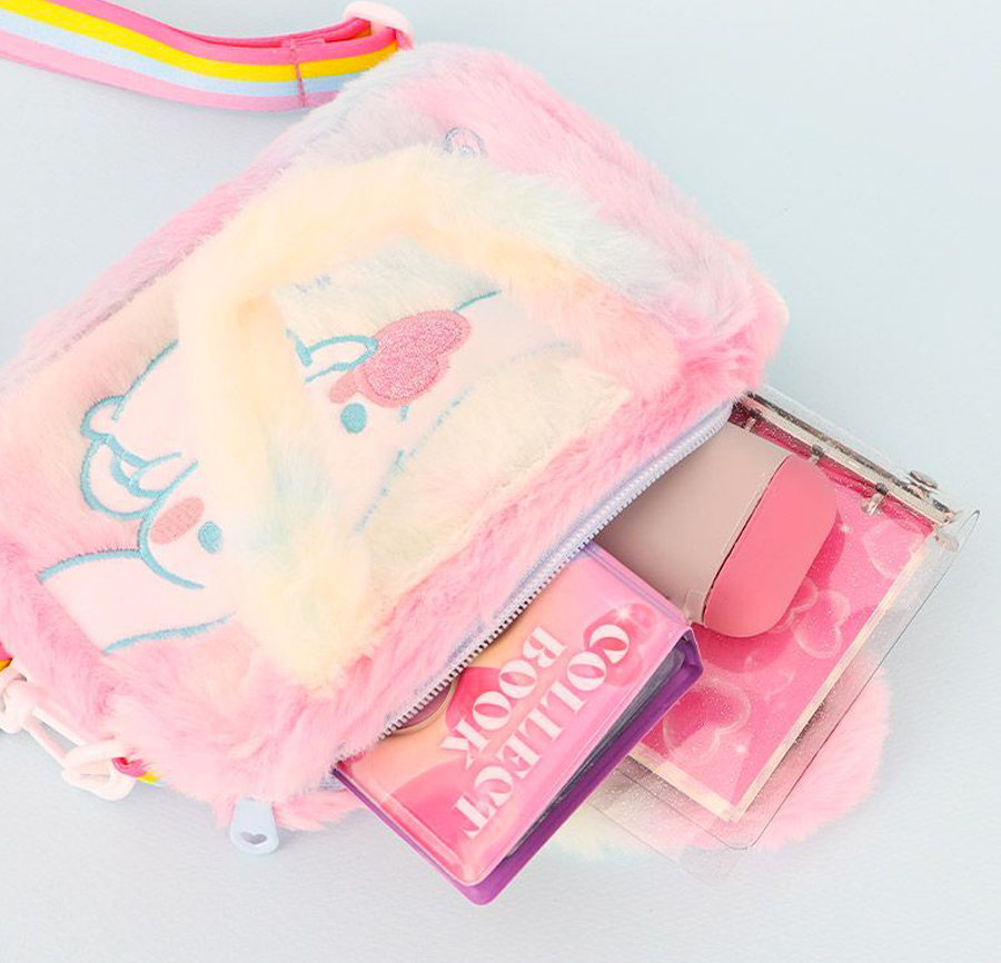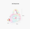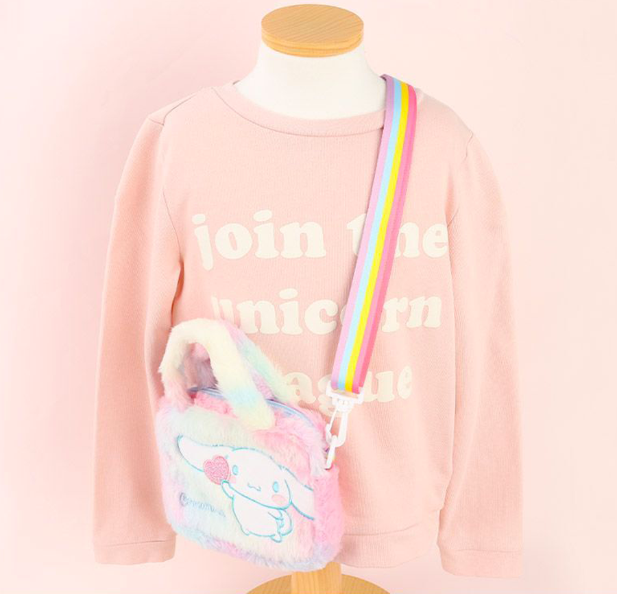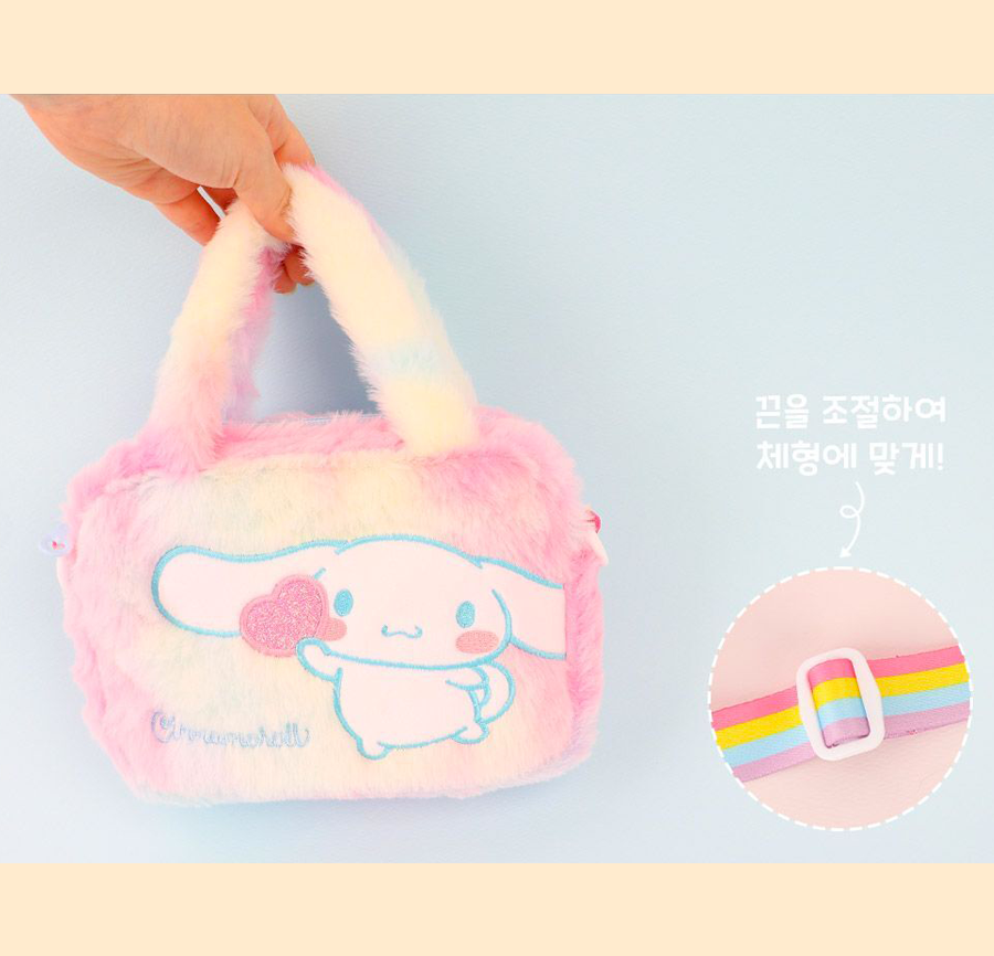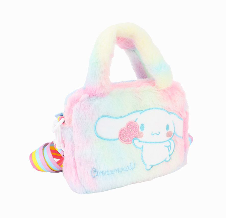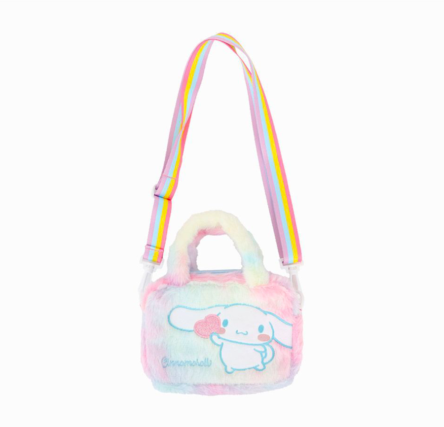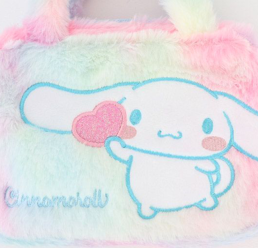 This adorable Cinnamoroll bag features soft, cozy pastel rainbow fur with delicate Cinnamoroll embroidery and a sparkly logo accented with charming heart details. Lightweight yet practical, it offers excellent storage space while maintaining a compact size—perfect for carrying your daily essentials.