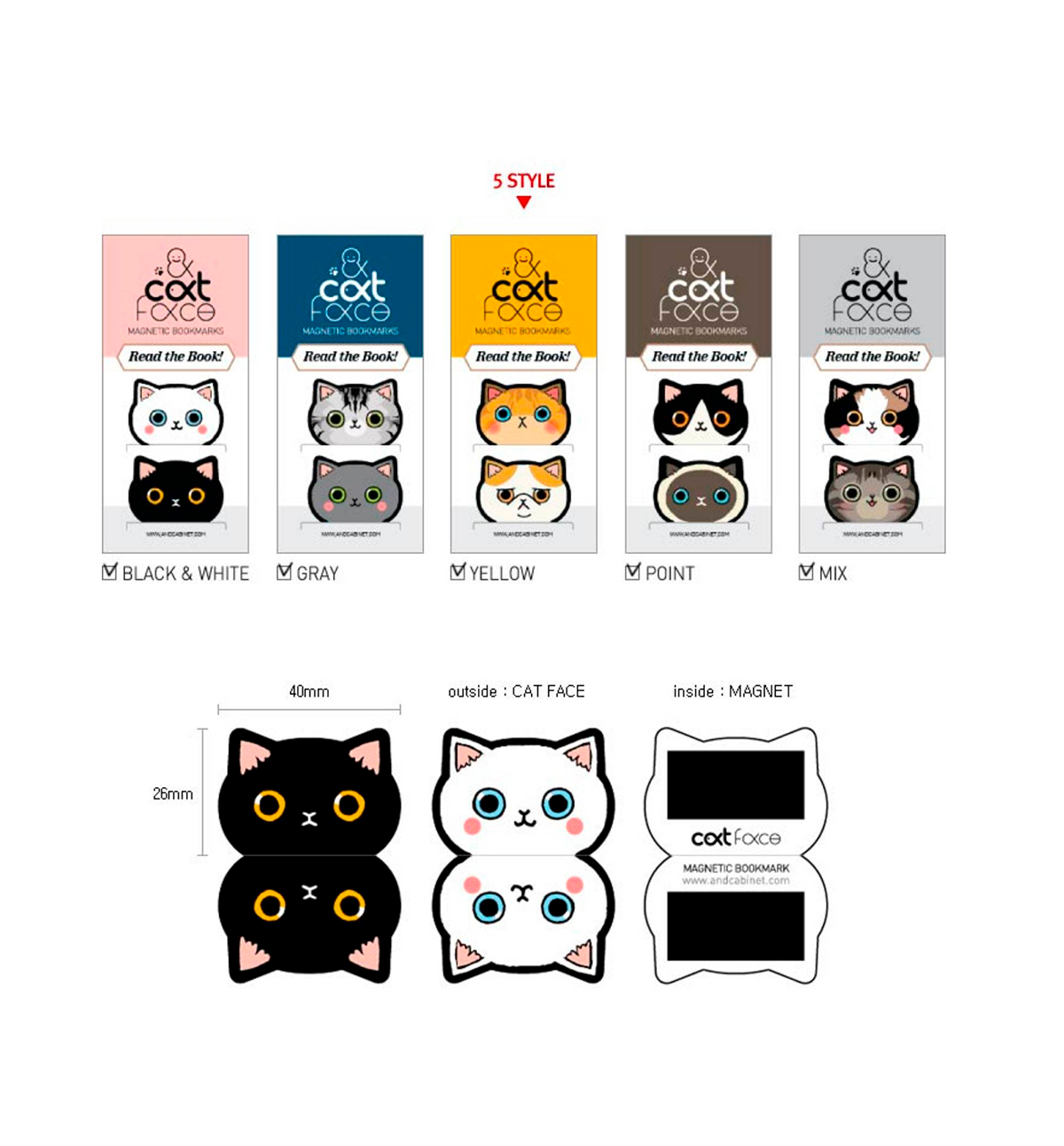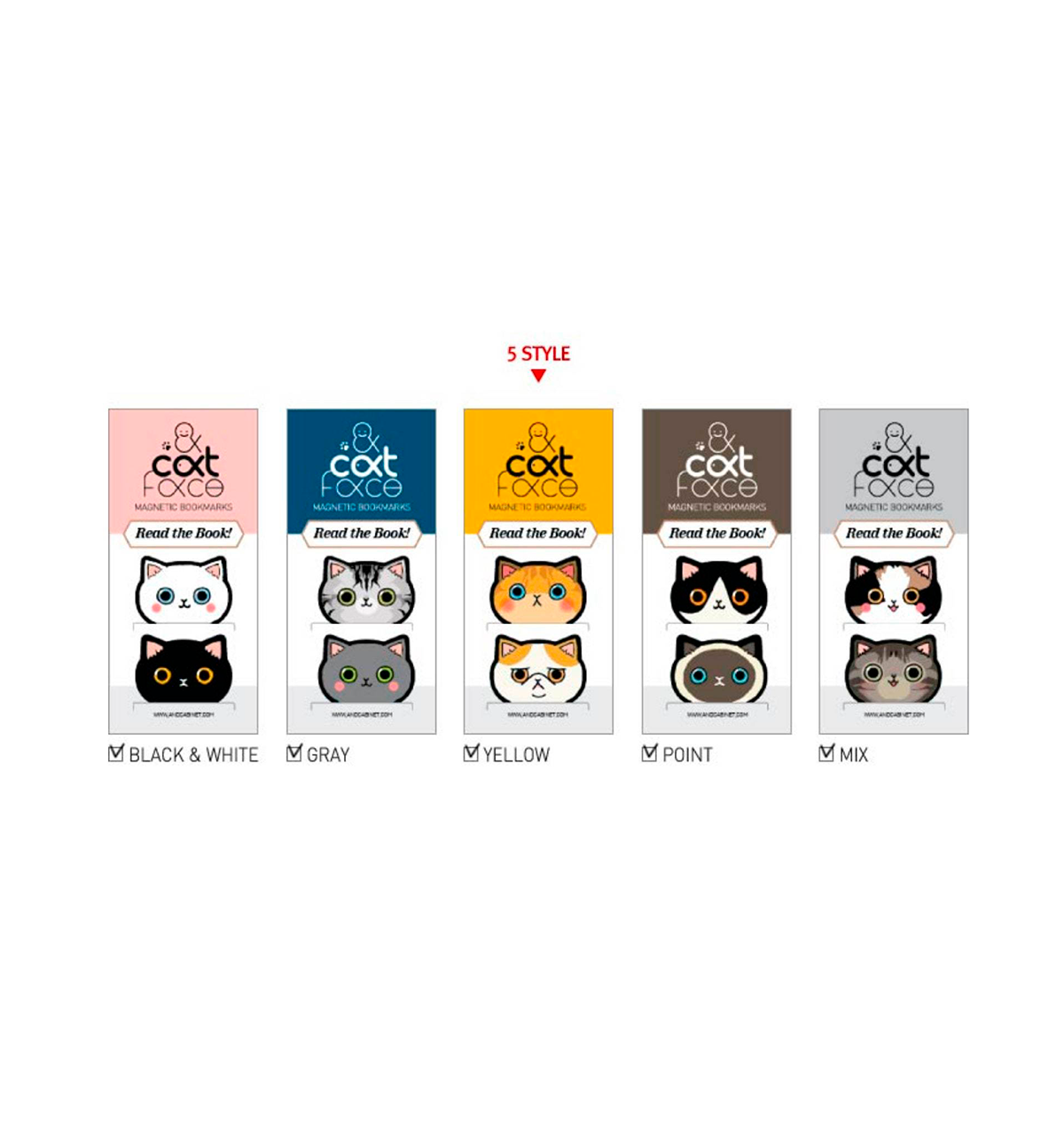 Quantity: 2 cat faces bookmarks. This comes in set of 2 and in different 5 different designs: Black & White, Gray, Yellow, Point and Mix.