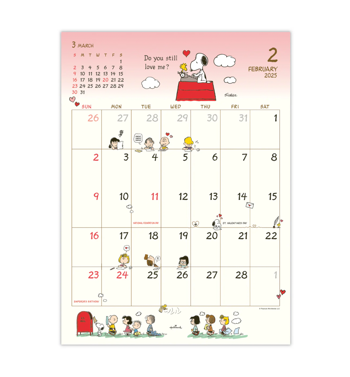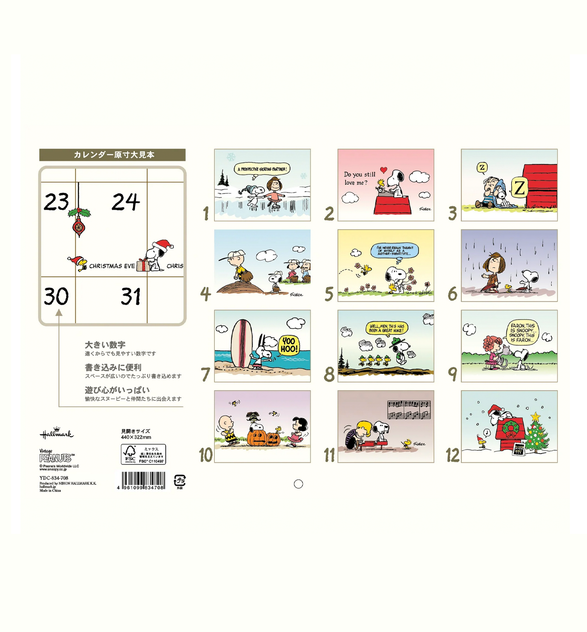 Cute design with Snoopy and red post. A bi-fold calendar that can be folded compactly. When unfolded, it can be used as a wall an easy-to-read design with a large date.