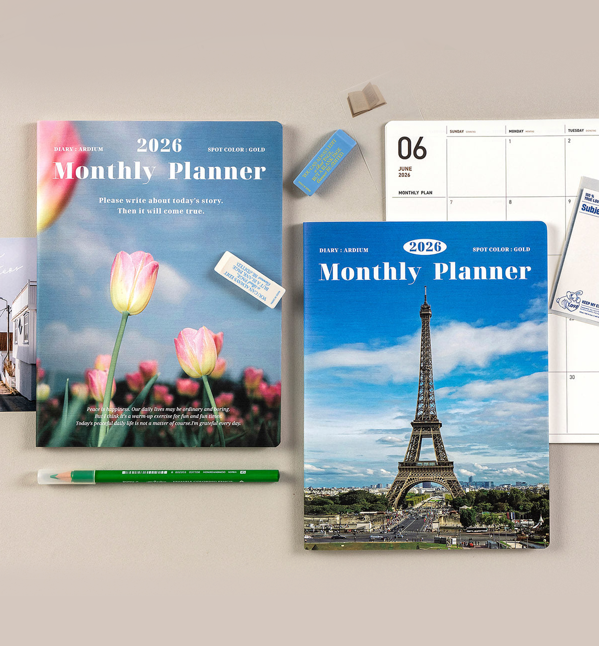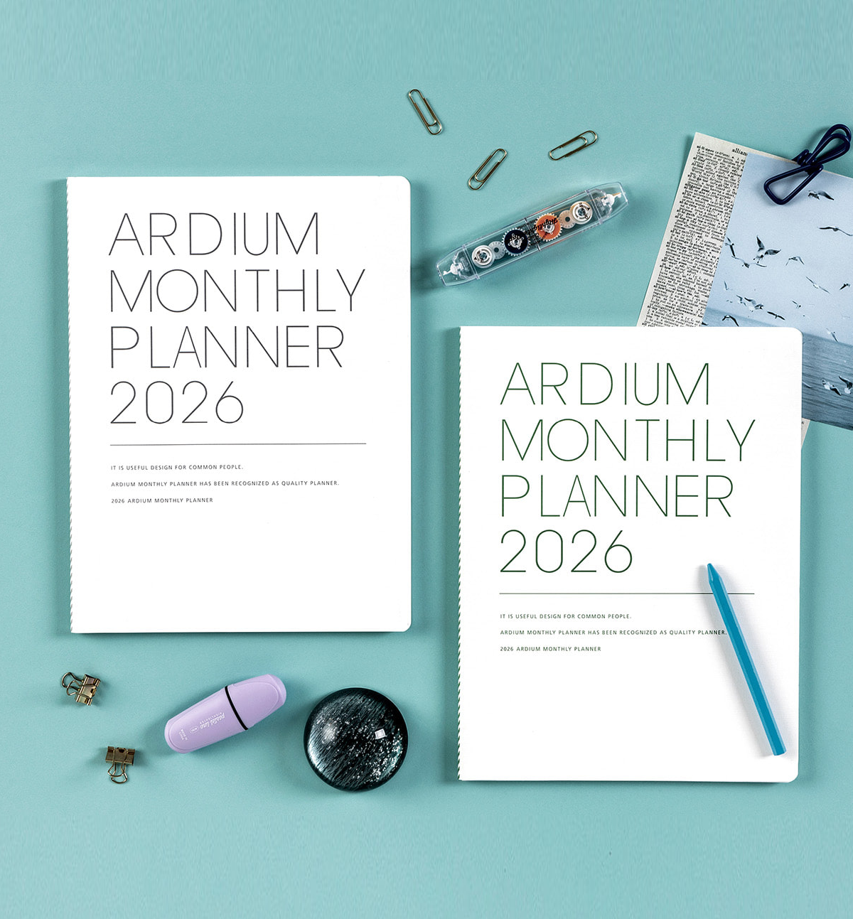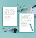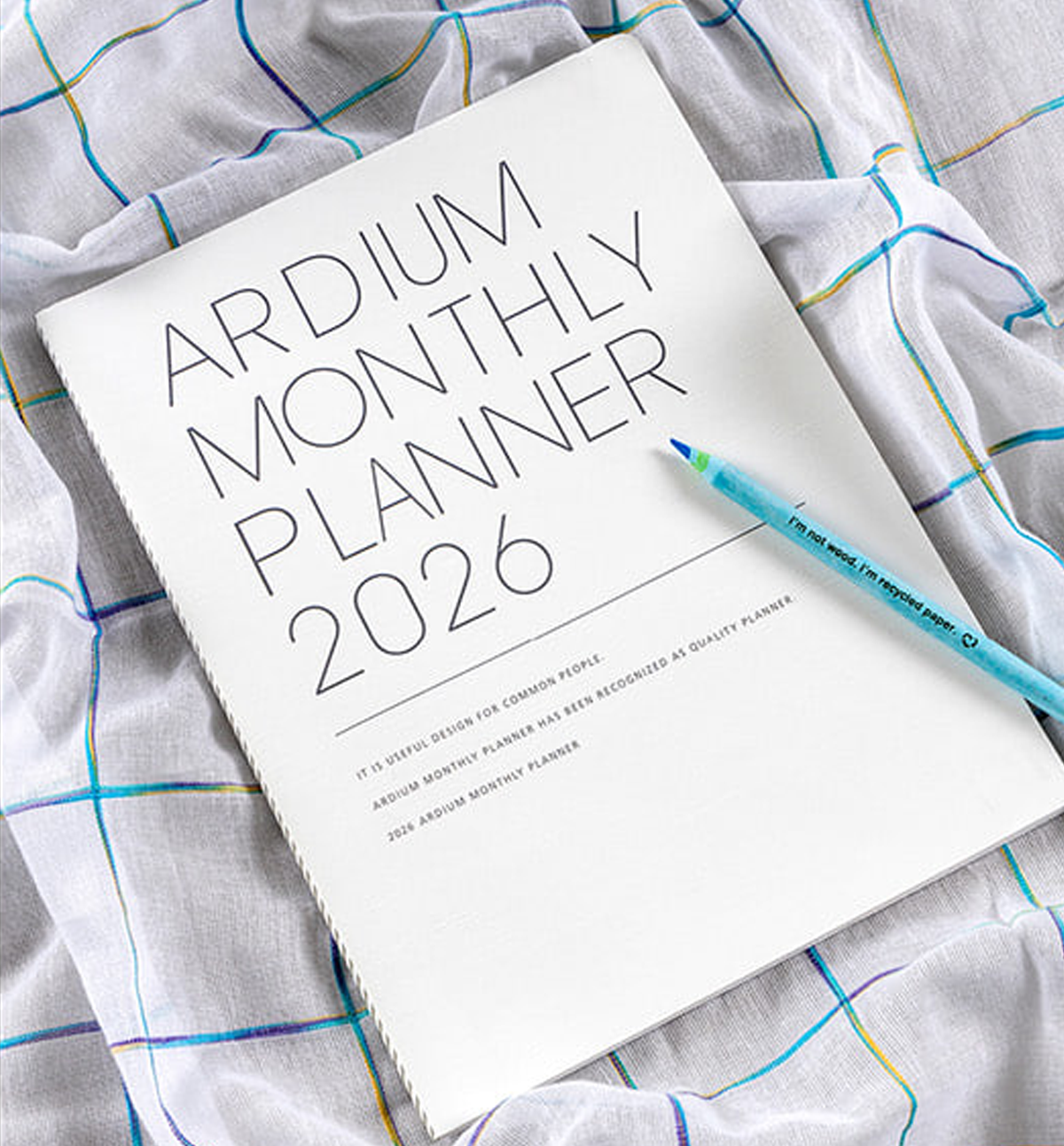The 2026 Ardium Monthly Planner [L] is available in 6 beautiful cover designs. It features a flat-lay design for comfortable writing, durable sewn binding, and a protective PVC cover. Stylish, practical, and perfect for planning your year ahead.