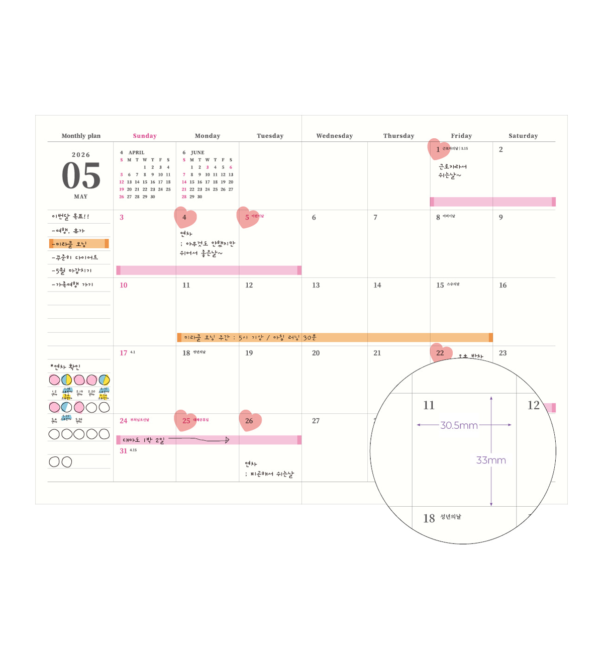 *Korean holidays are pre-marked throughout the calendar’s dated pages. But you can always add your personal holidays.