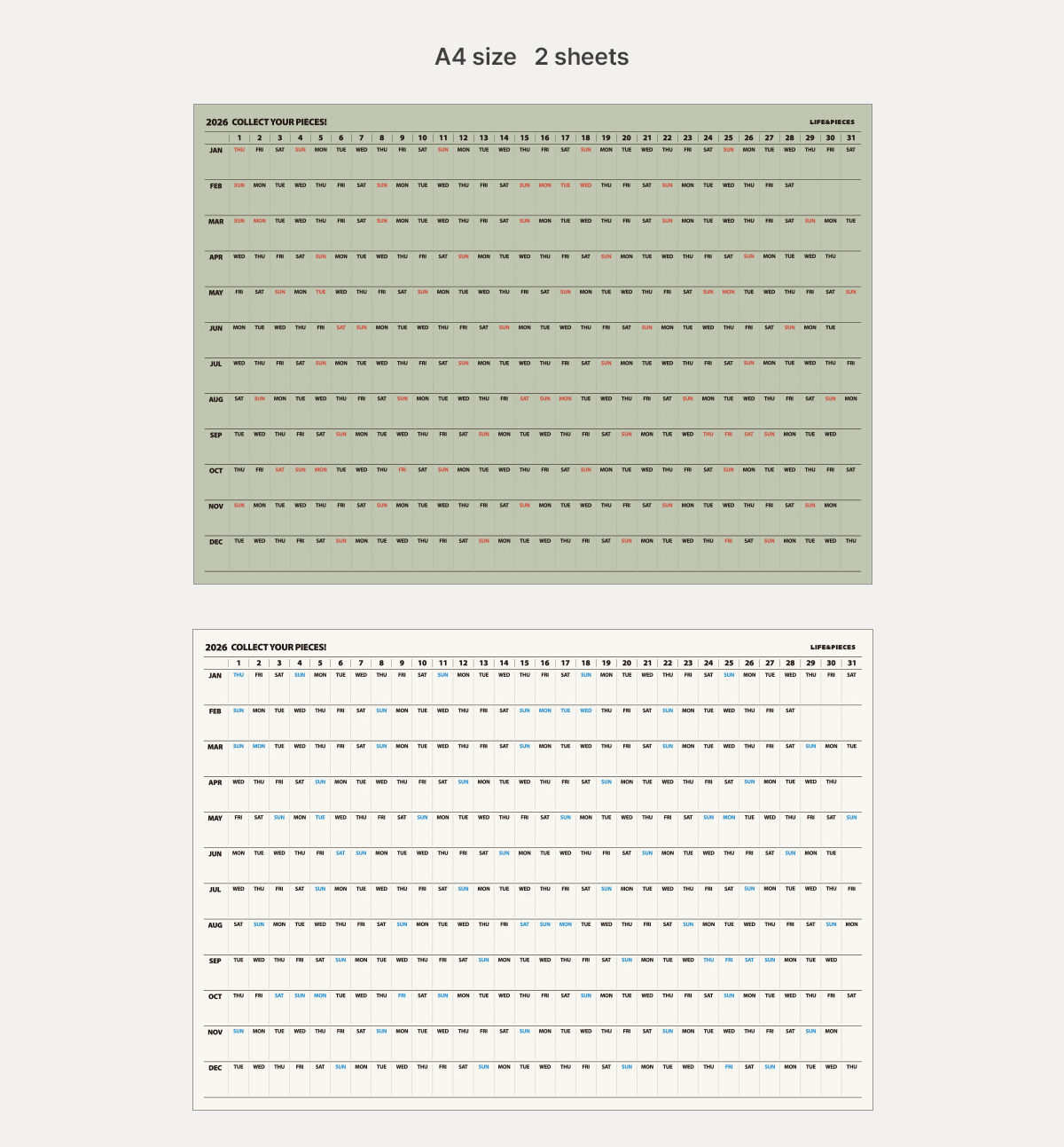 Place them wherever you need them—on your wall, in your planner, or on your desk—and keep track of your plans anytime, anywhere. The vintage-inspired color palette reflects the calm and warm sensibility of Life & Pieces, making planning both functional and enjoyable.