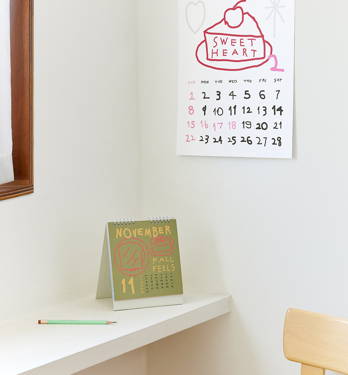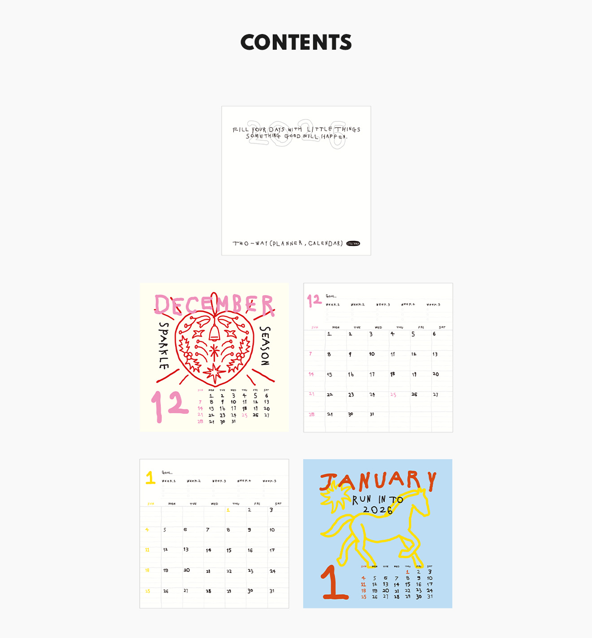 Whimsical drawings & hand-drawn typography: Each month is filled with pen-style sketches and playful lettering, adding personality and joy to your workspace.