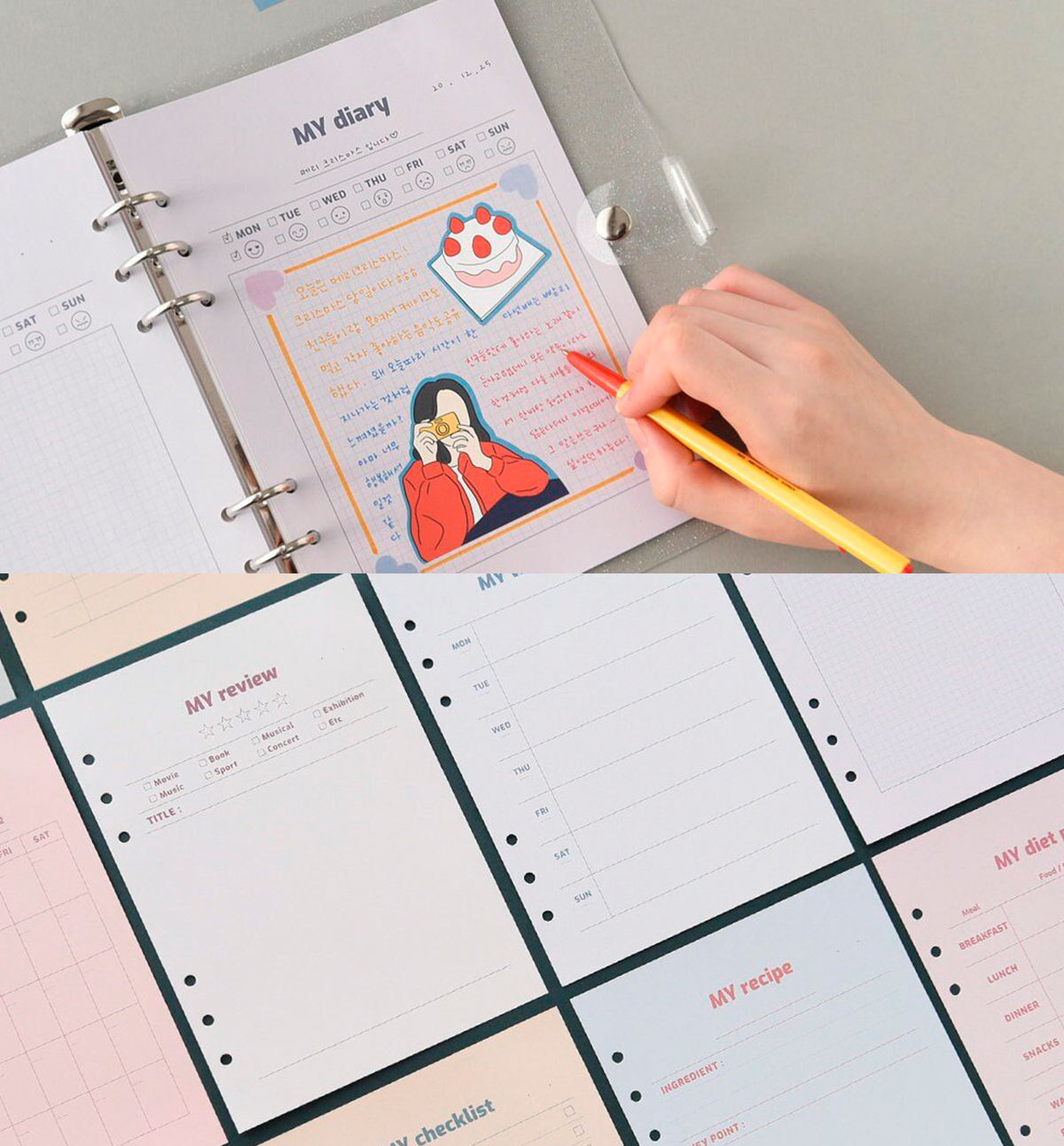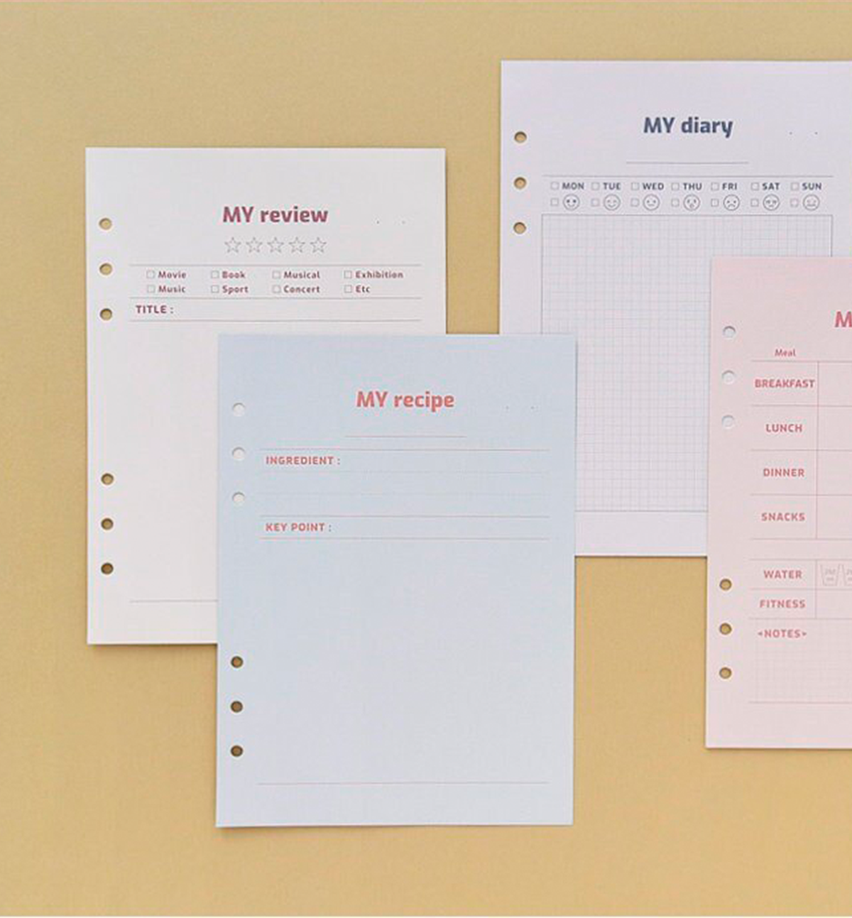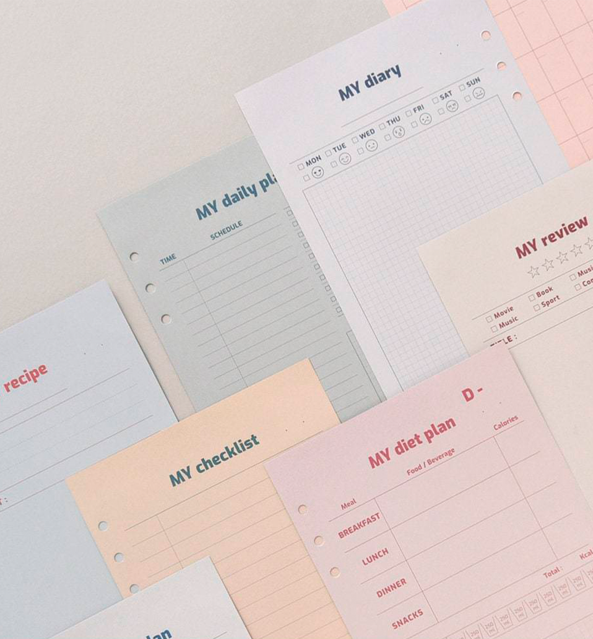 This beautiful A5 Planner Refill comes in 8 different designs: 01. My Review, 02. My Recipe, 03. My Diary, 04. My Diet Plan, 05. My Monthly Plan, 06. My Weekly Plan, 07. My Daily Plan and 08. My Checklist. Please, see pictures for reference.