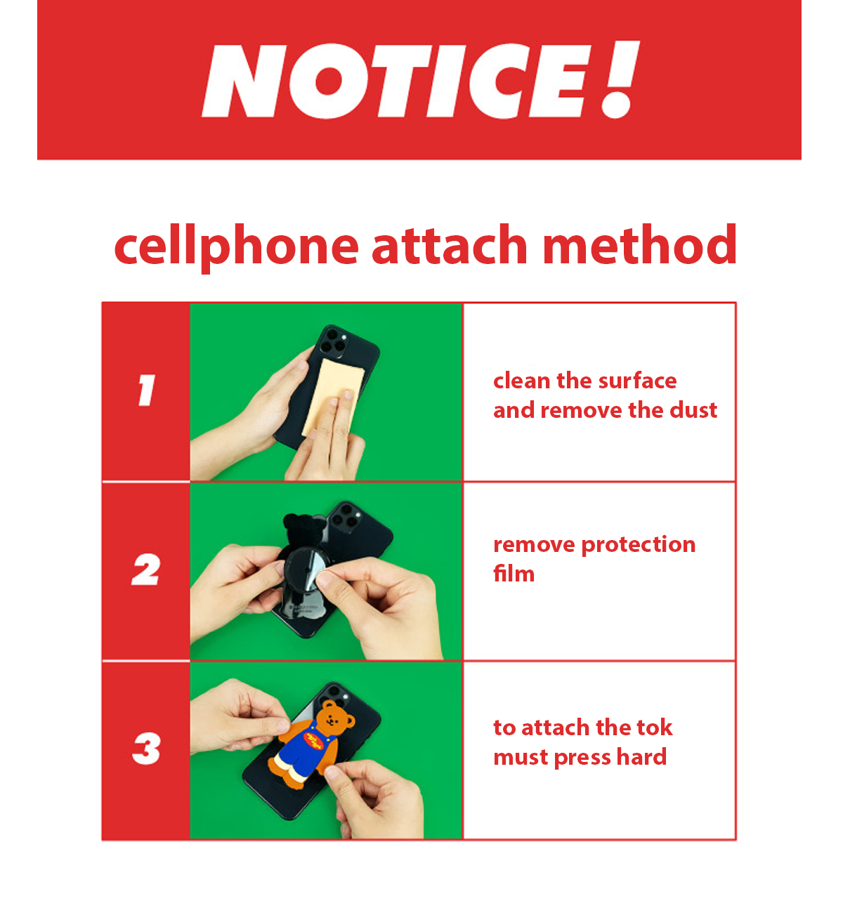 * If the mobile phone has a special coating (ex. coating like iphone 8, etc). If the attachment surface is a curved surface and not flat. If it is designed as pattern (double, intaglio, dot pattern, etc). If this is one of these cases, please use the transparent film that is enclosed with POPTOK (inside the package)