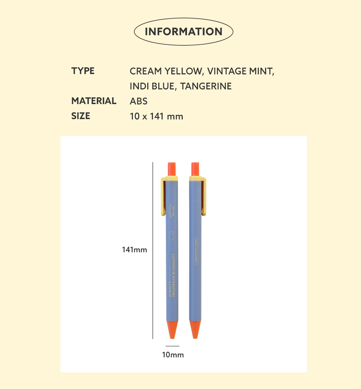 This Bubbly Gel Pen 0.38 comes in 4 different colors: Cream Yellow, Vintage Mint, Indi Blue and Tangerine. Ink colors are the same for all the pens: Black.