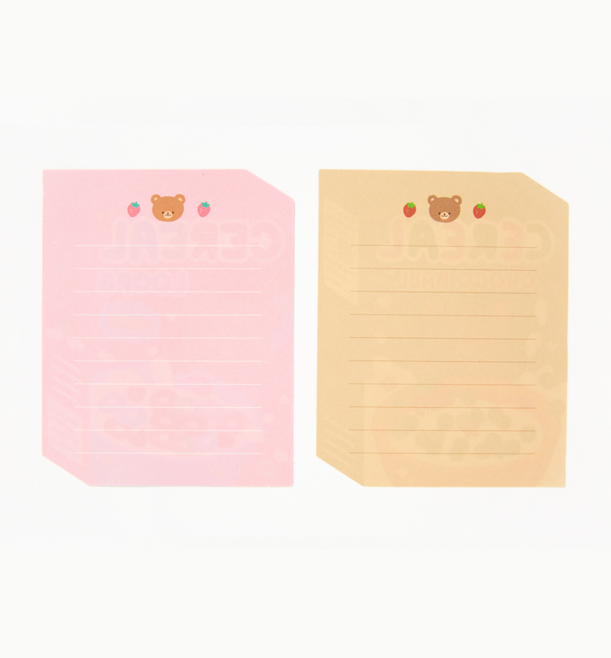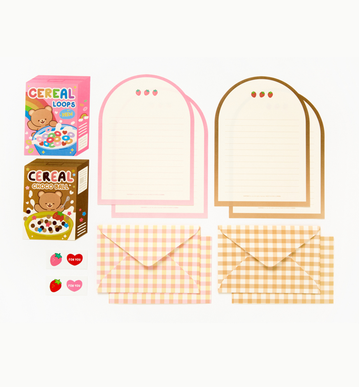 This is a cute stationery set with a colorful cereal concept. It consists of 4 sheets of regular letter paper, 2 sheets of cereal-shaped mini letter paper and 4 envelopes.