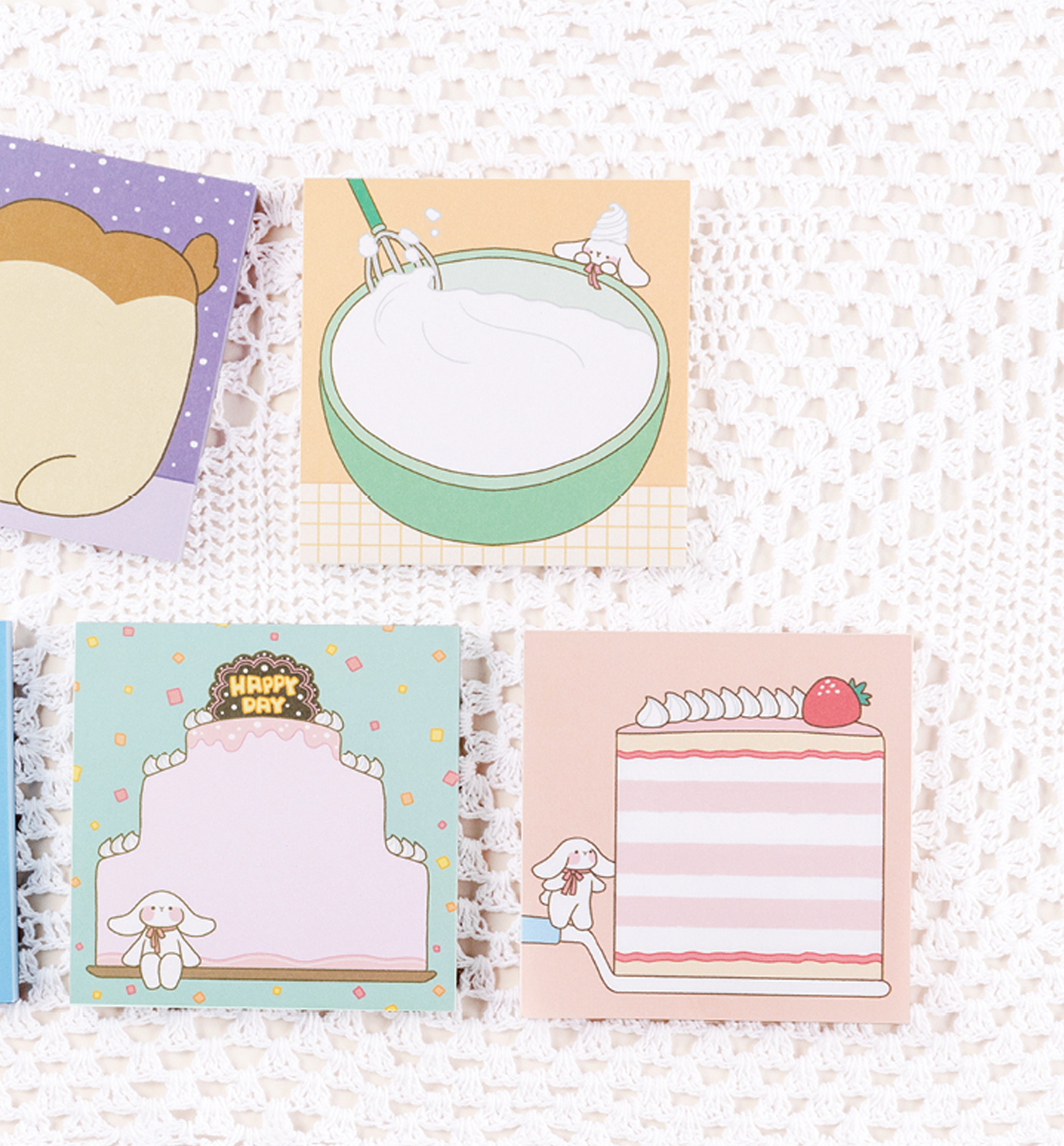This beautiful Cooking Dessert Memopad comes in 5 different designs: Bunny Bread, Whipping Cream, Caramel Pudding, Happy Day Cake and Strawberry Cake.