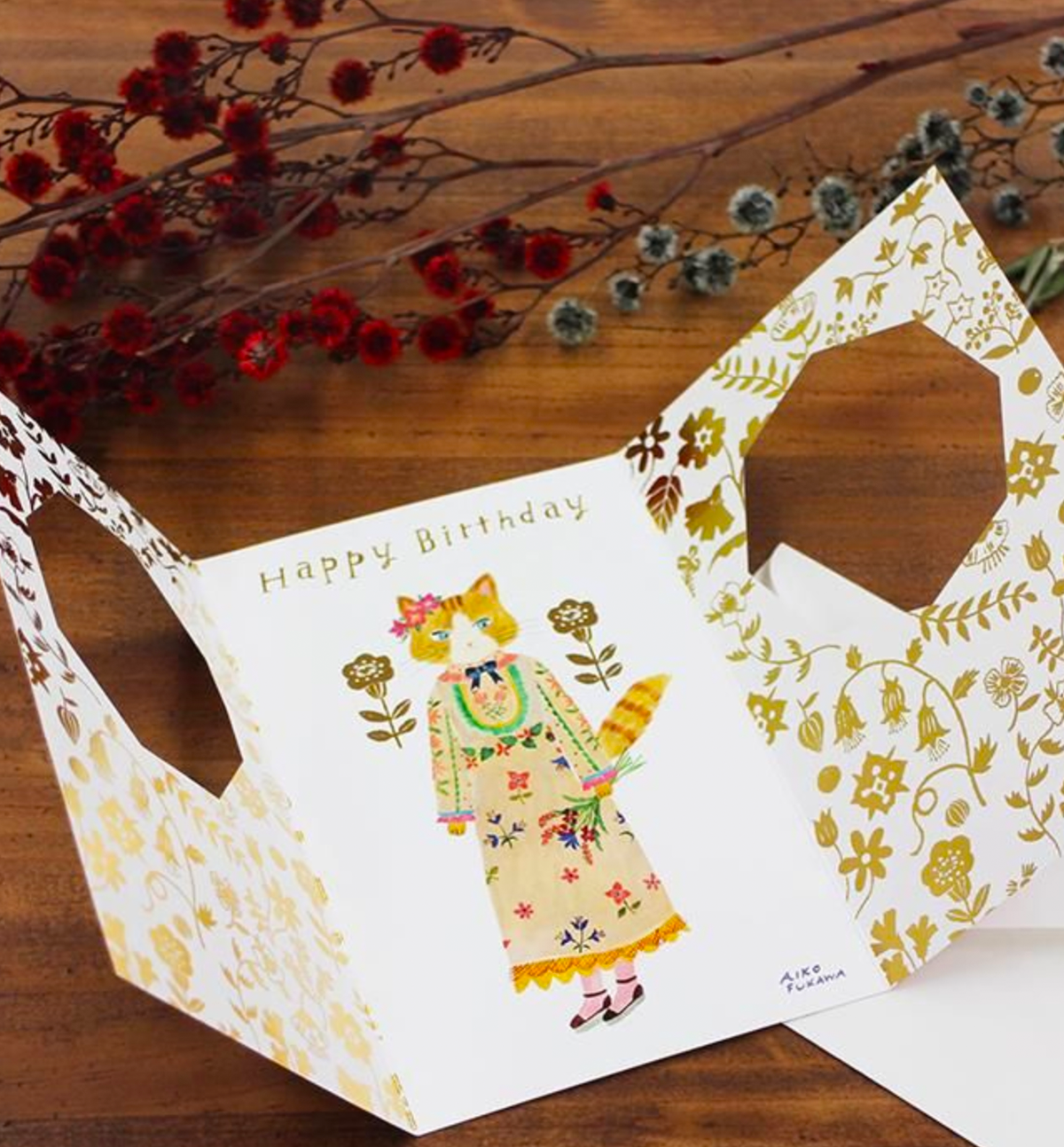Celebrate someone special with this adorable birthday card designed by illustrator Aiko Fukukawa. The front features a die-cut window where a cute cat peeks out, creating a charming and playful first impression.
