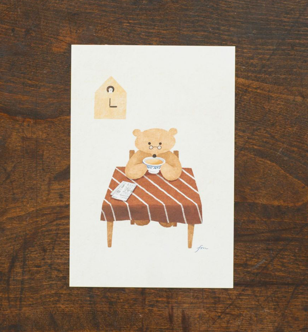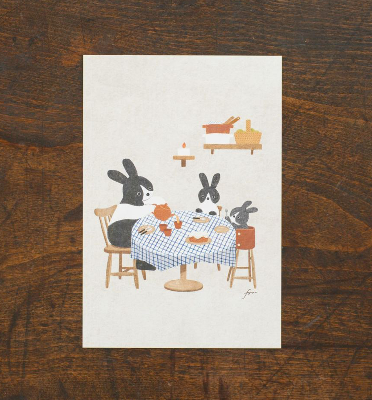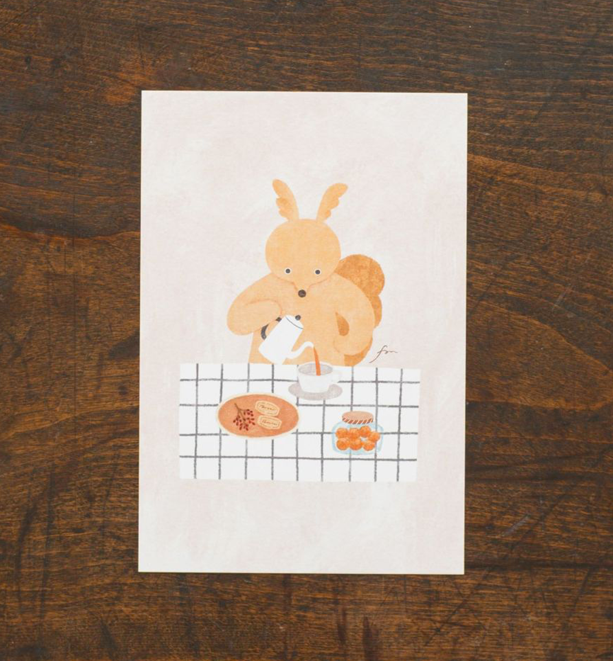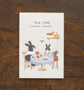 Cute postcard stationery by Mariko Fukuoka, featuring animals enjoying a delightful tea-time.