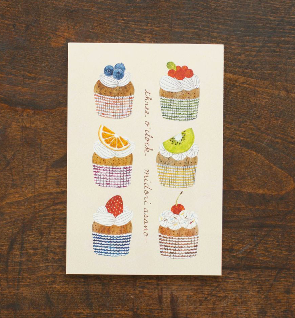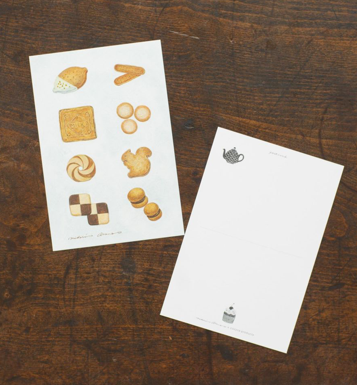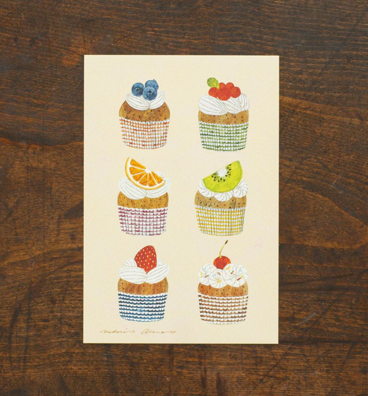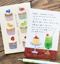 Cute postcard stationery by Midori Asano, featuring delicious-looking sweets and stylish tableware.