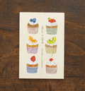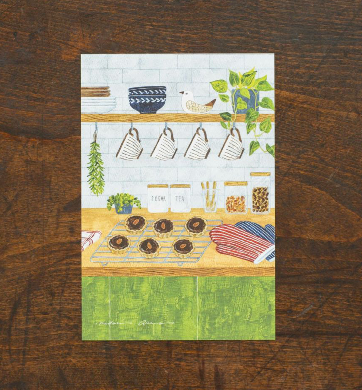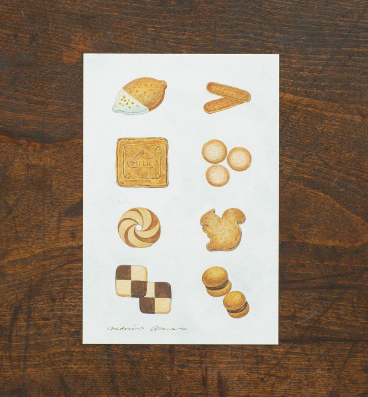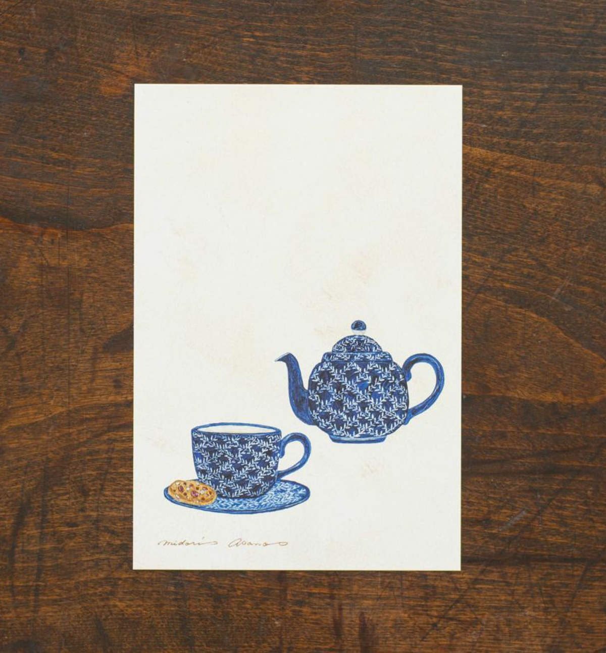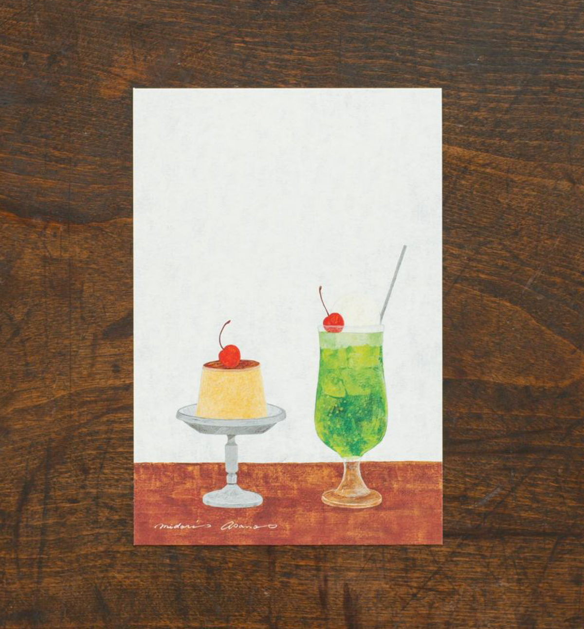 Cute postcard stationery by Midori Asano, featuring delicious-looking sweets and stylish tableware.
