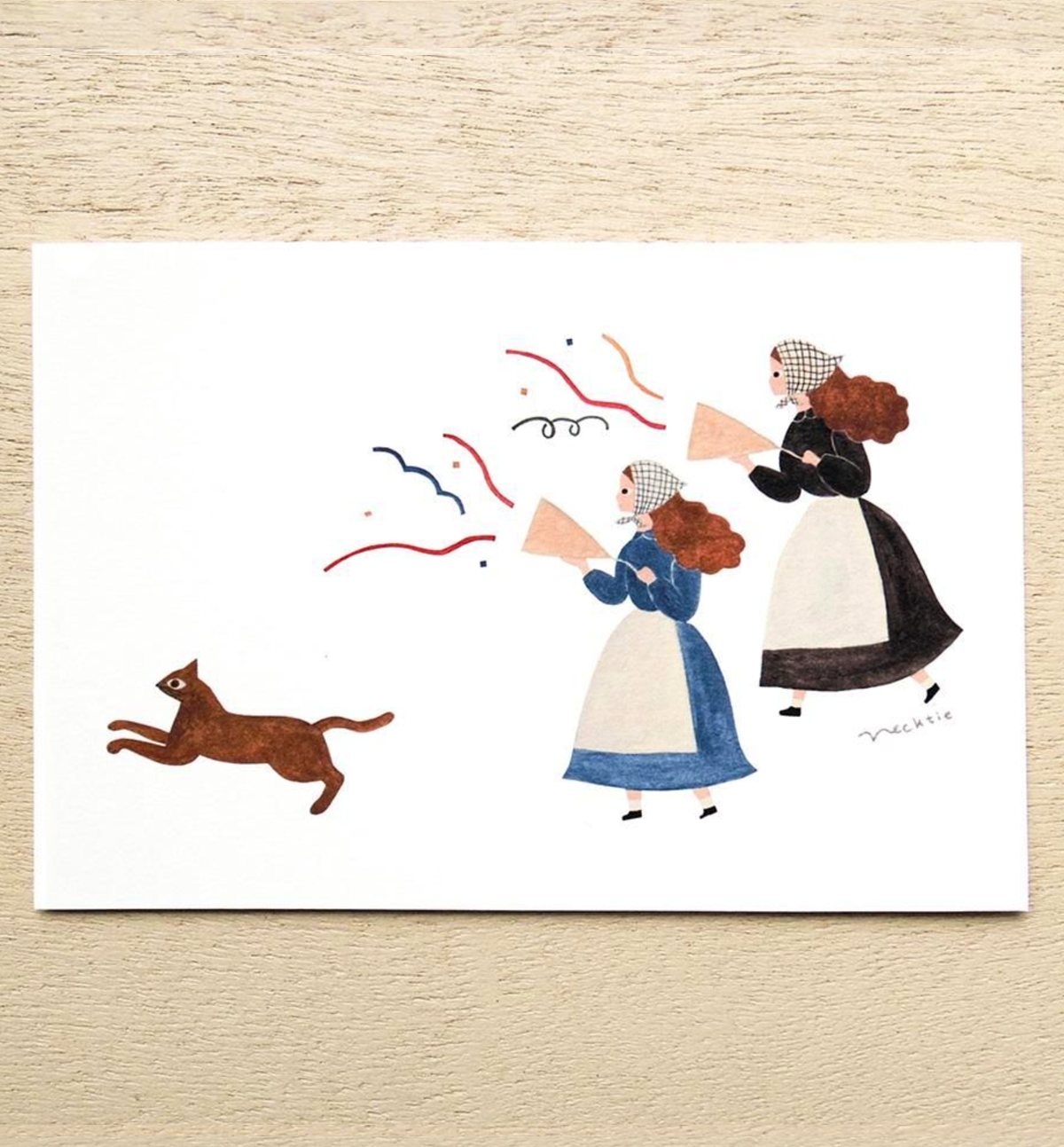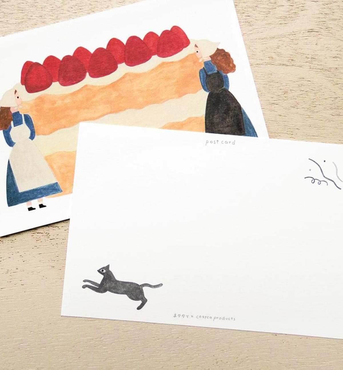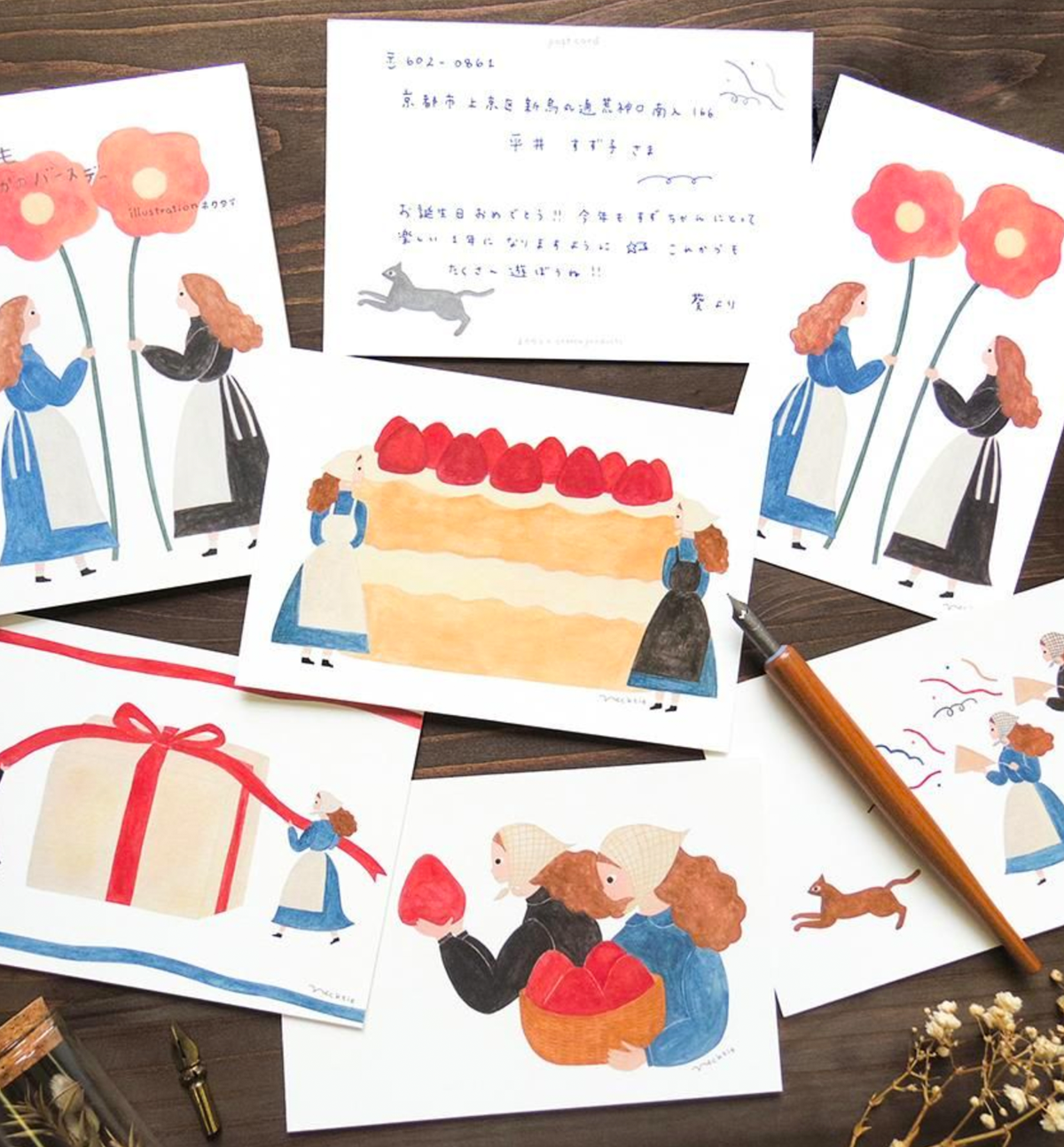 This adorable postcard letter set by the illustrator duo Necktie features two cute characters preparing for a cheerful birthday party.