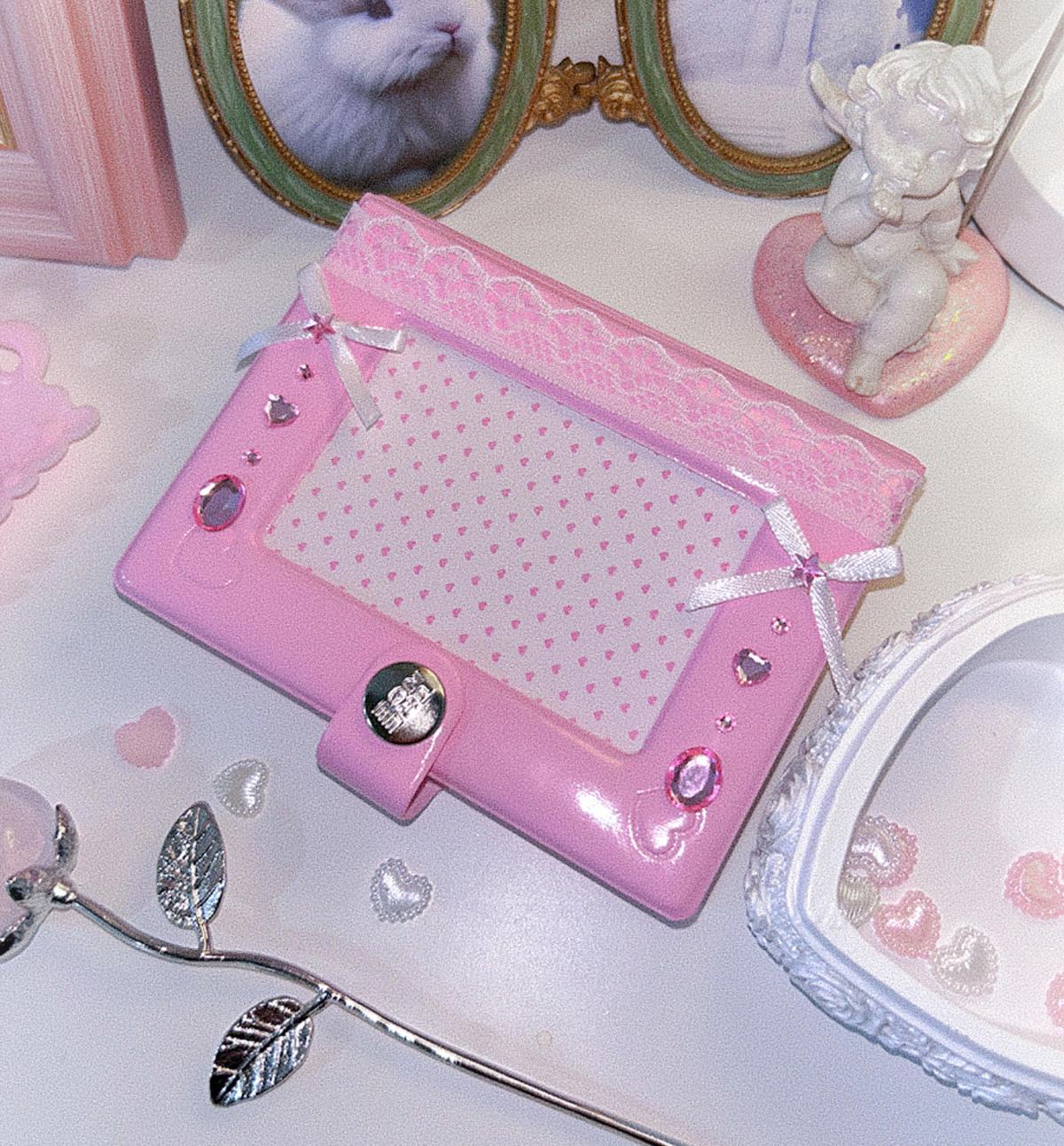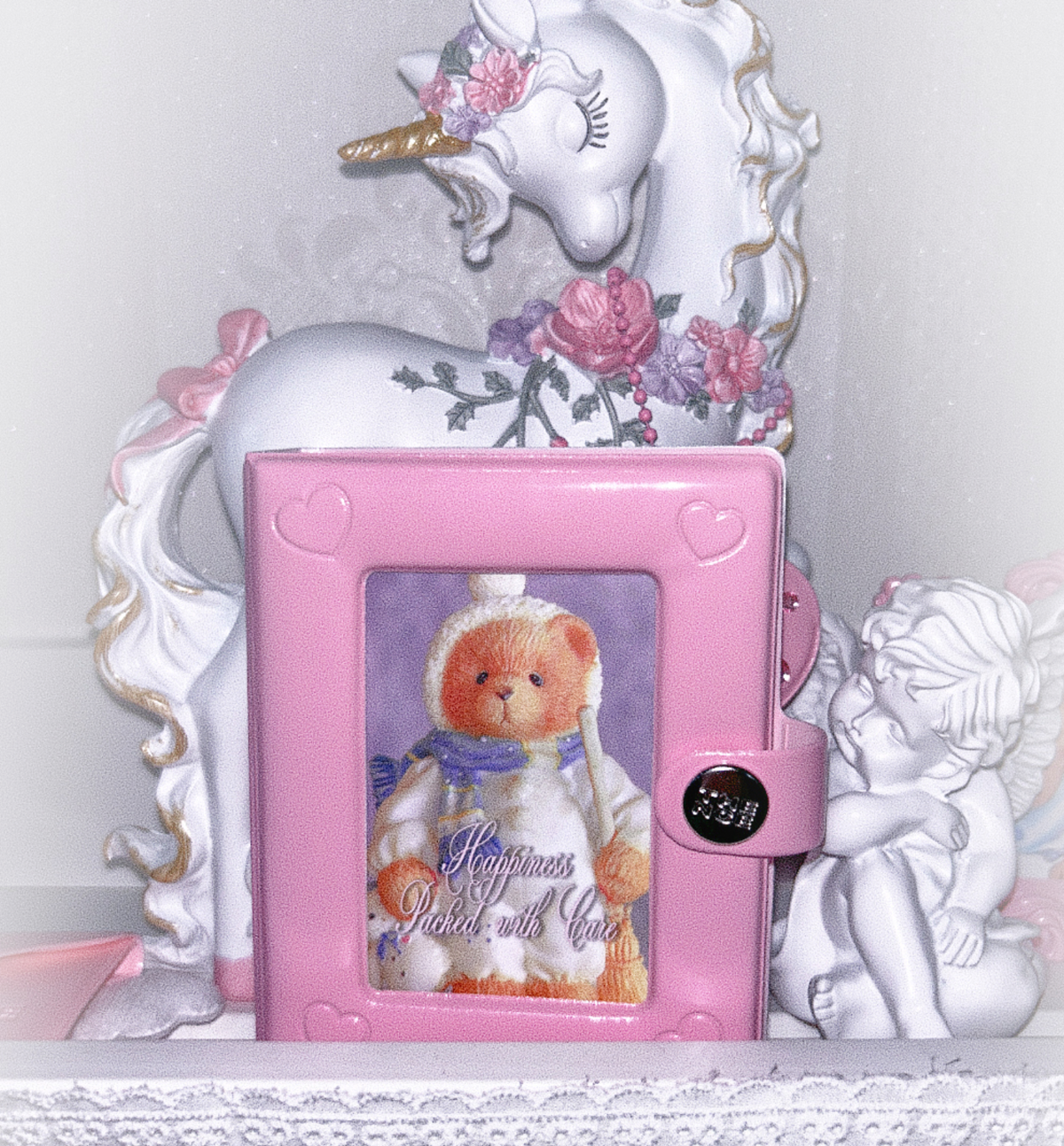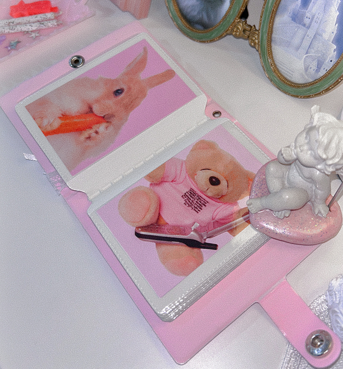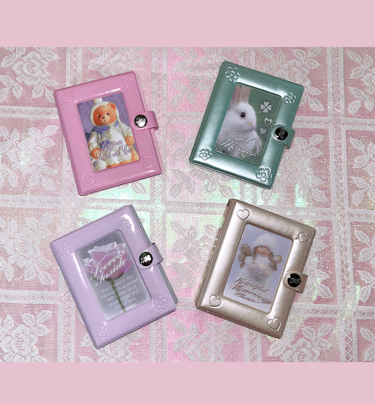 This is a collectible book where you can collect whatever you want, such as photo, postcards and recipes in the size of 5.5 x 8.5cm. Unlike conventional PVC material, it is a made of enamel material with small pearl particles. The front and back have a star-shaped pattern embossed on them.