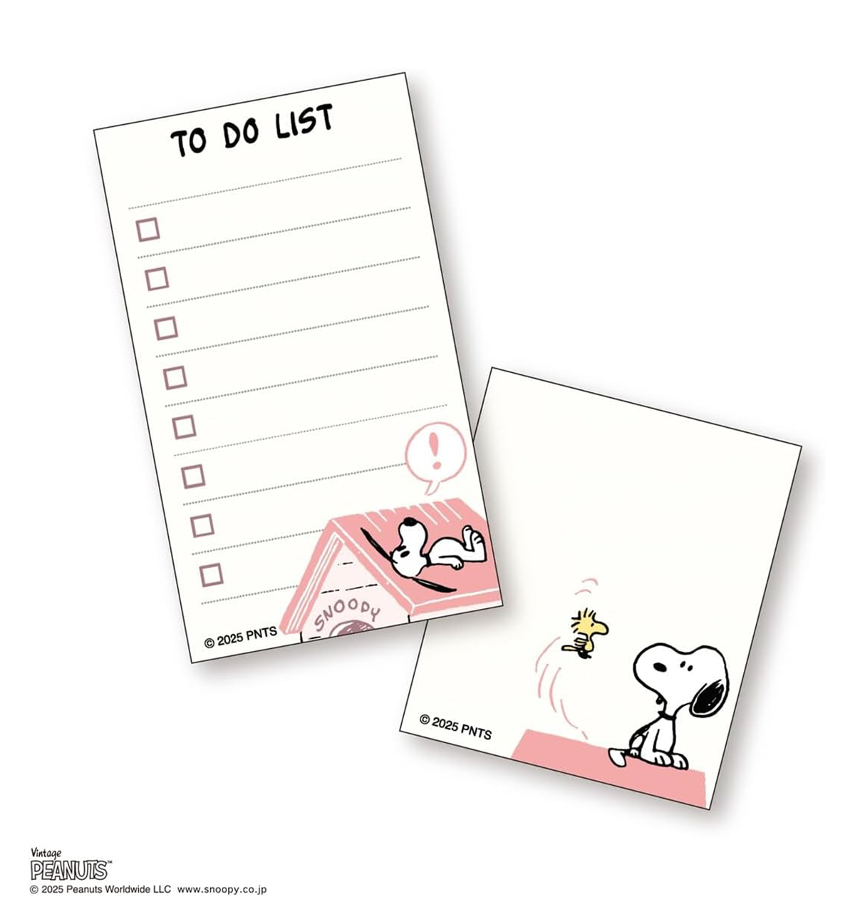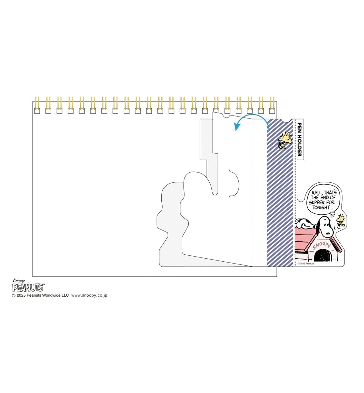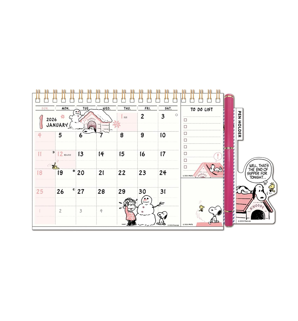 Each month features cute Peanuts character designs, and the included sticky notes and memo sheets (30 sheets × 2 designs) let you jot down tasks, reminders, or quick notes. The ring-bound, desk-style calendar allows for easy flipping and writing, while the pen holder can be folded away when not in use for compact storage.