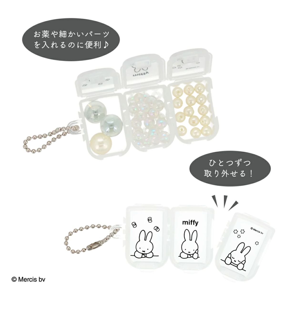 A pill case with Miffy design. Perfect for storing supplements and medicines, but can also store accessories and earrings. The semi-transparent interior helps prevent you from forgetting to take your medicine.