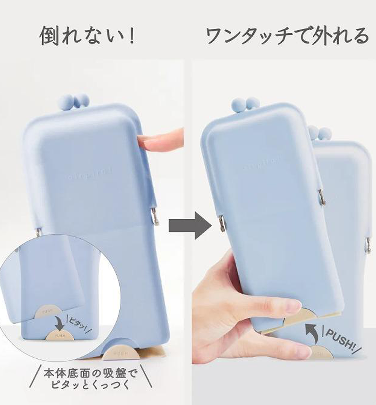 Just put it upside down and it won't fall down because it has a suction cup that sticks with power of air. Smartphone can be place both vertically and horizontally. Large capacity wide-open pouch type.