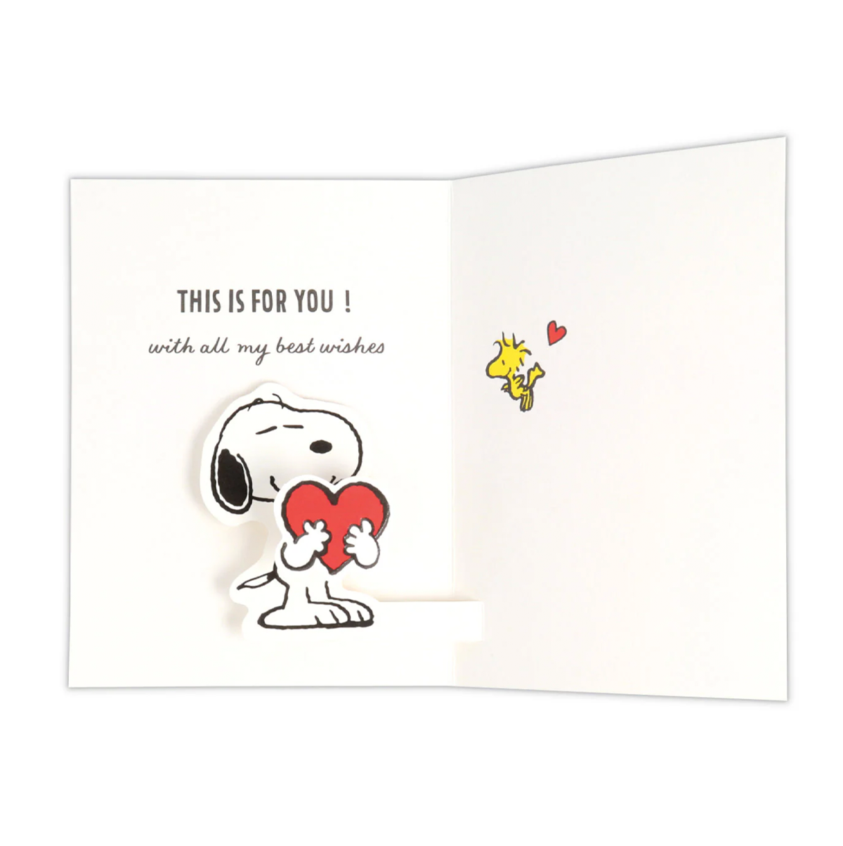 Show someone special how much you care with this adorable 3D multipurpose card featuring Snoopy hugging a heart. The clean, charming design lets the illustration and sentiment stand out beautifully, while the spring mechanism makes the heart pop up when the card is opened — adding a playful, interactive touch.