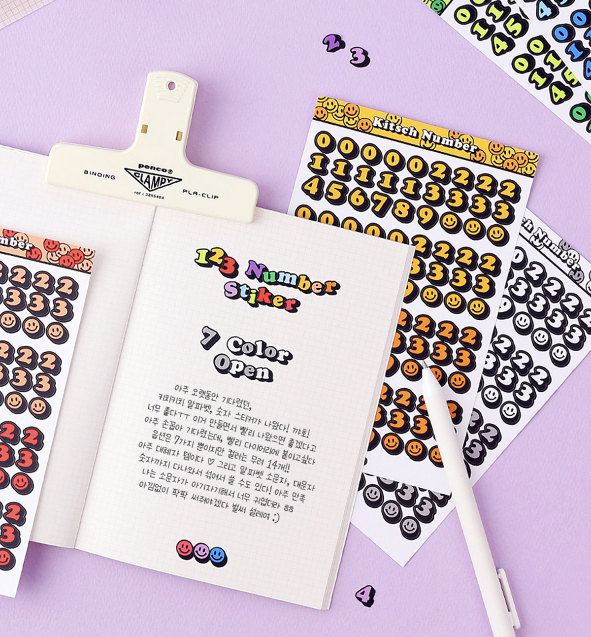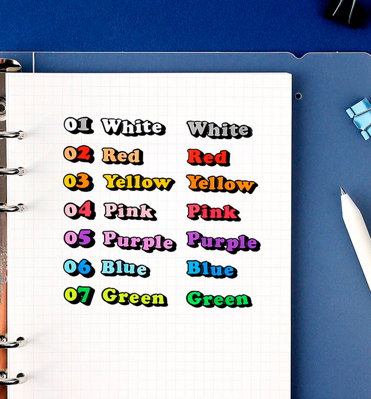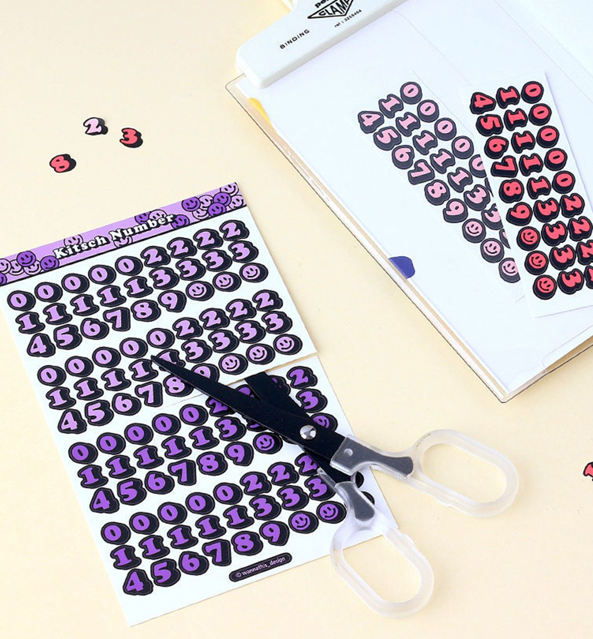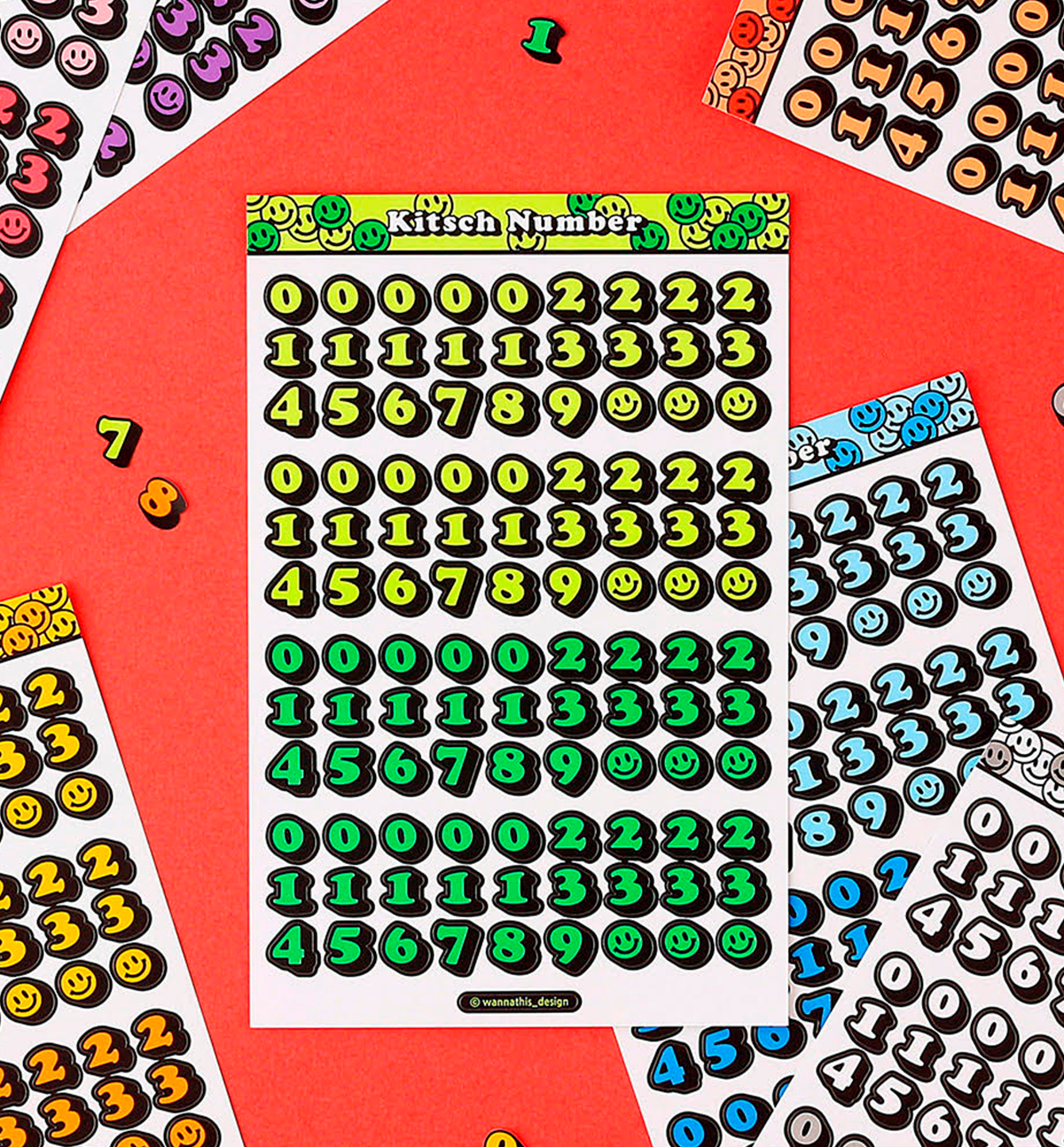 This beautiful Number Stickers comes in 7 different colors: 01. White, 02. Red, 03. Yellow, 04. Pink, 05. Purple, 06. Blue and 07. Green.