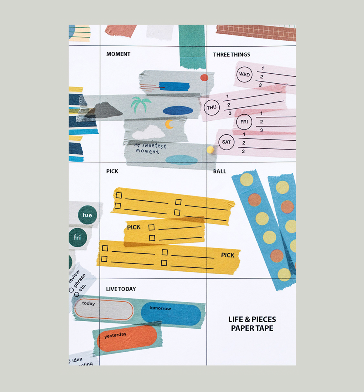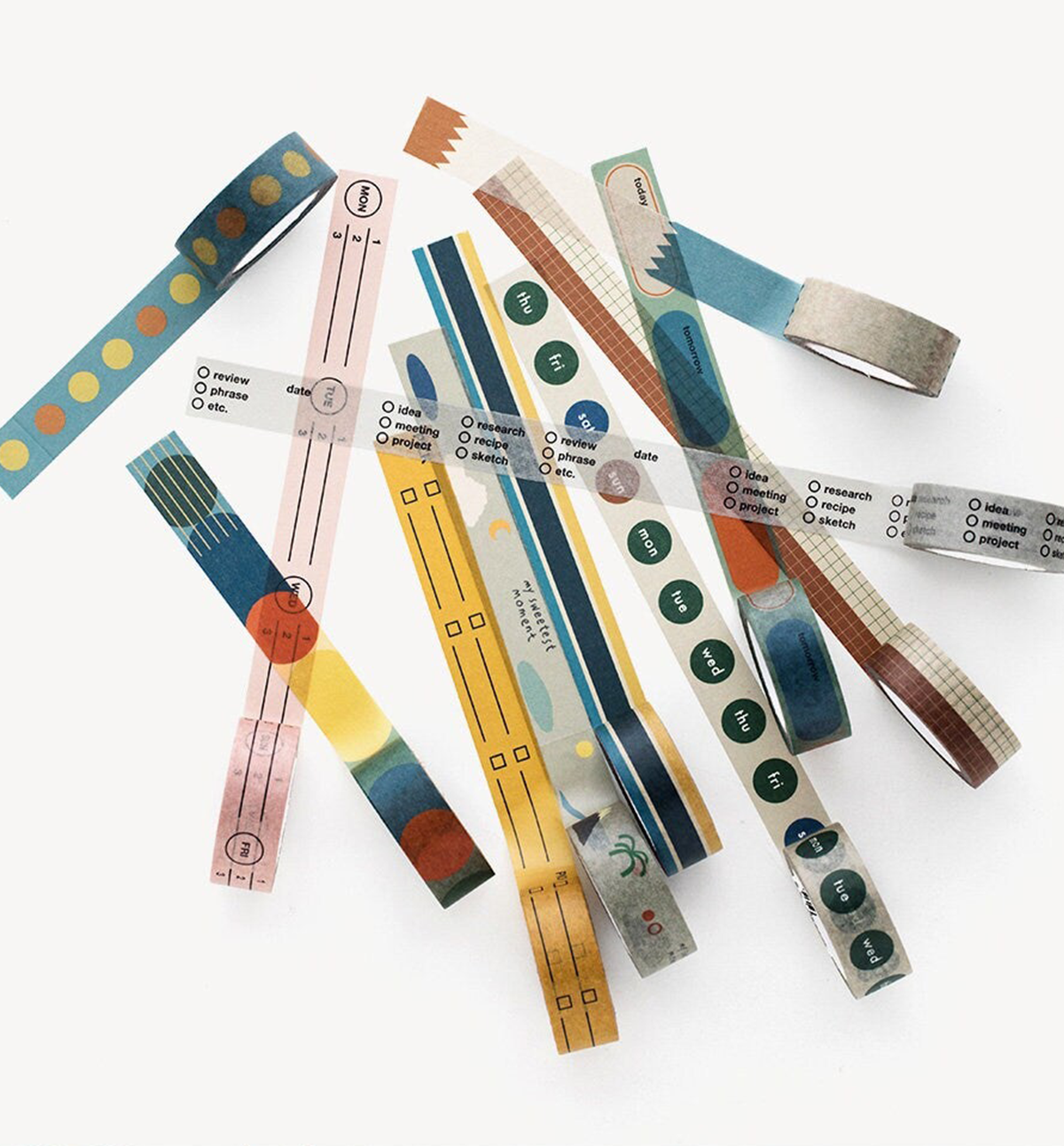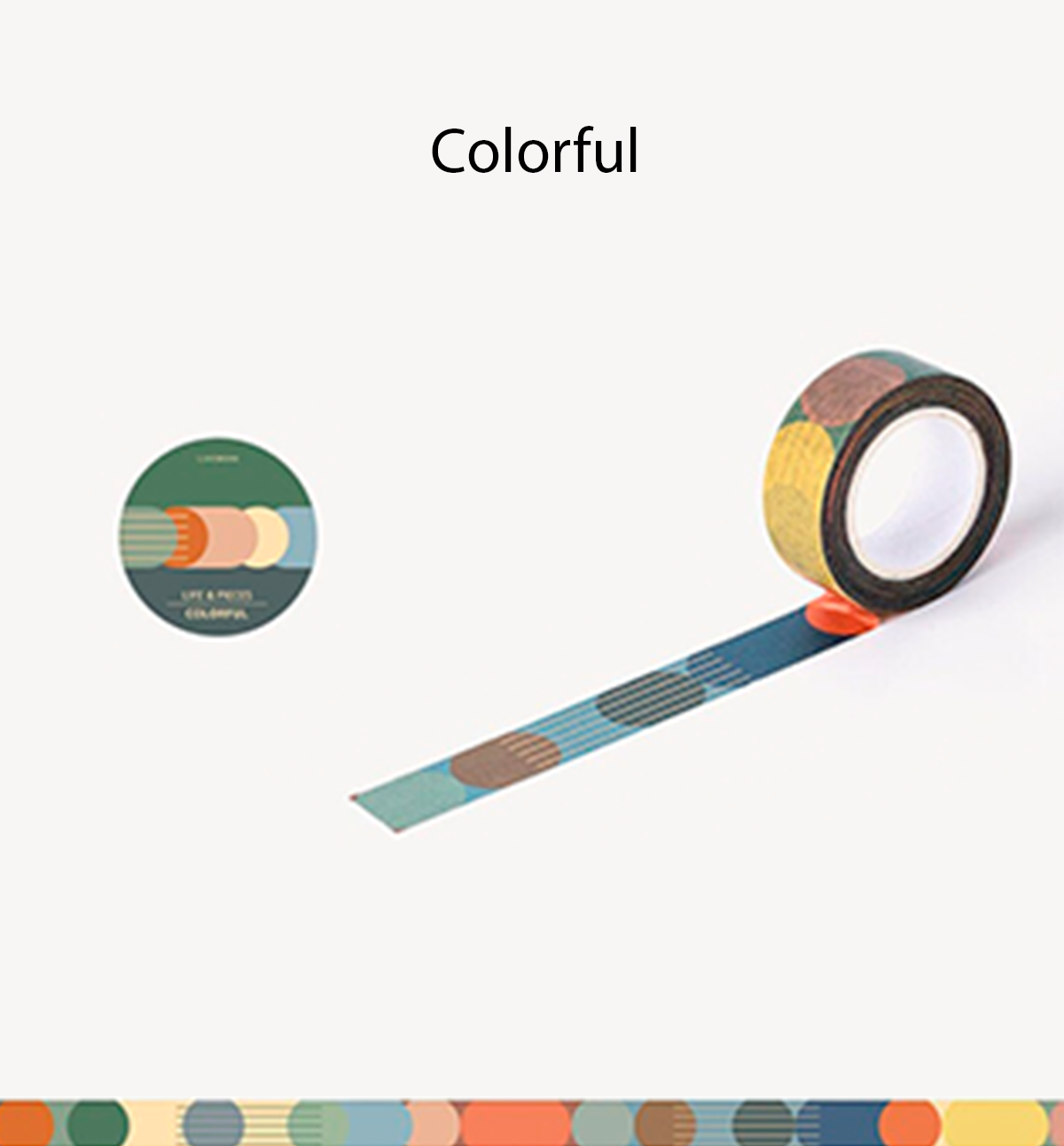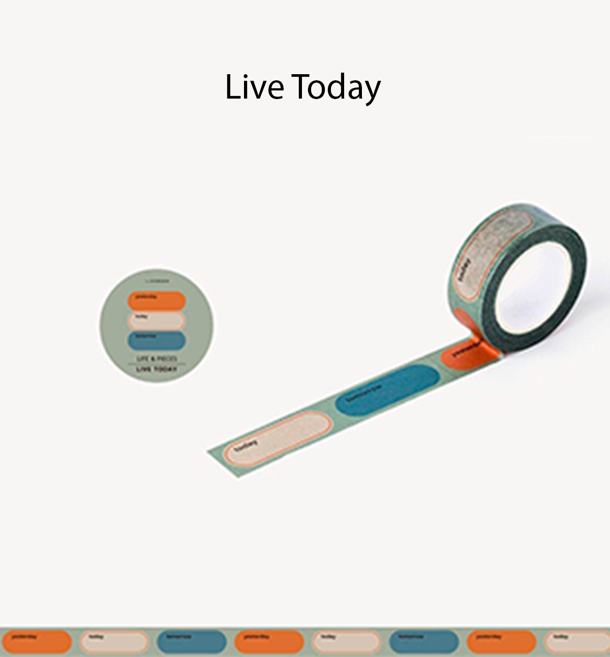 This beautiful washi tape comes in 11 different designs: Colorful, Moment, Brick, Marine, Pinking Shears, Ball, Three Things, Pick, Pick, Idea, Weekly and Live Today.