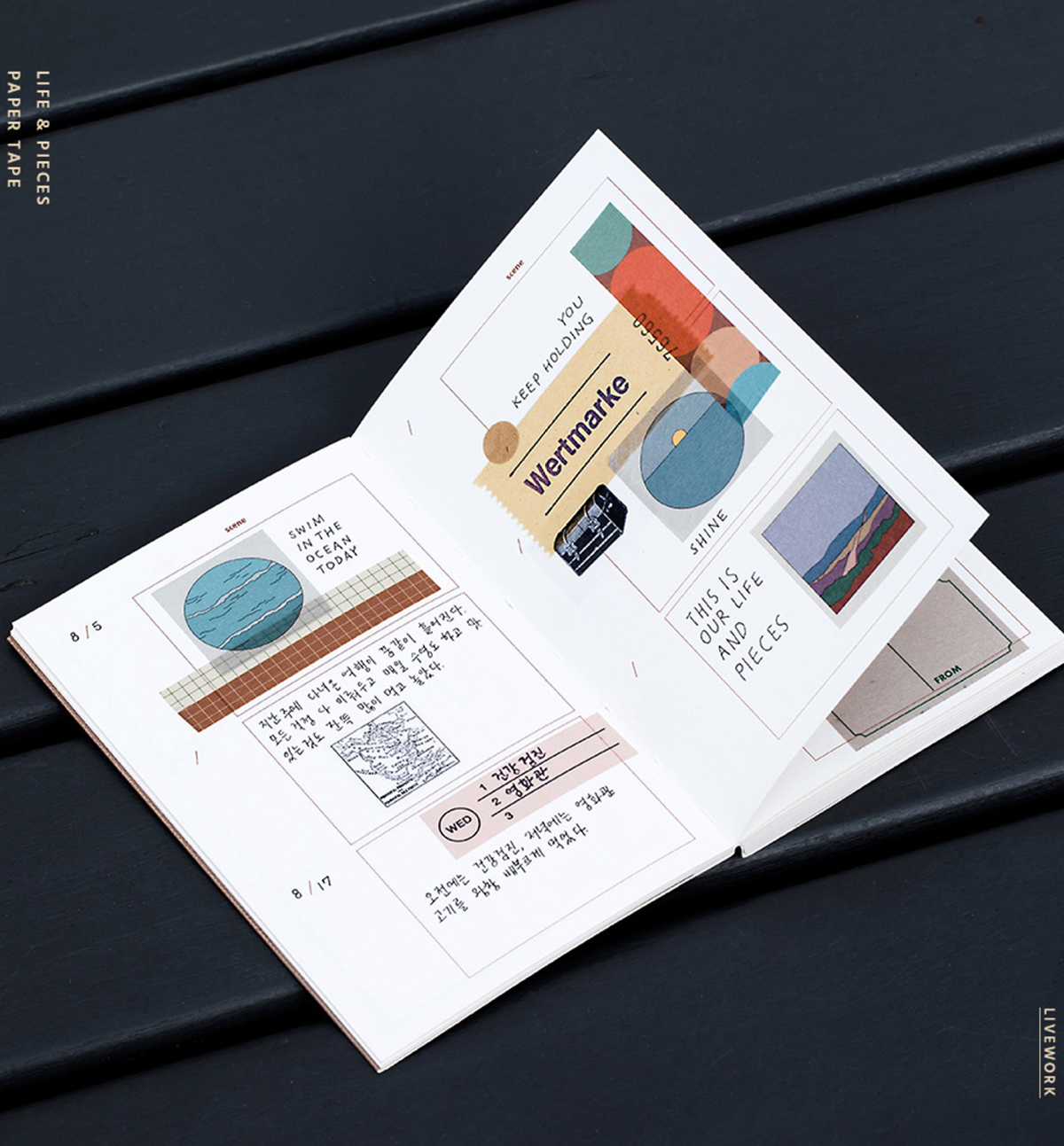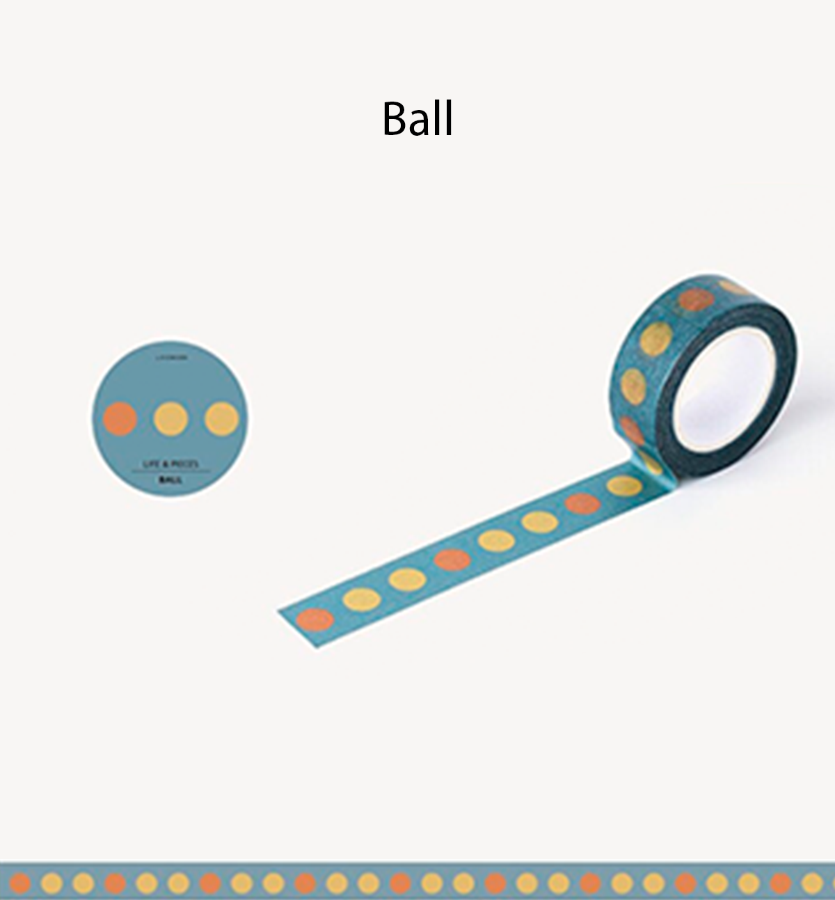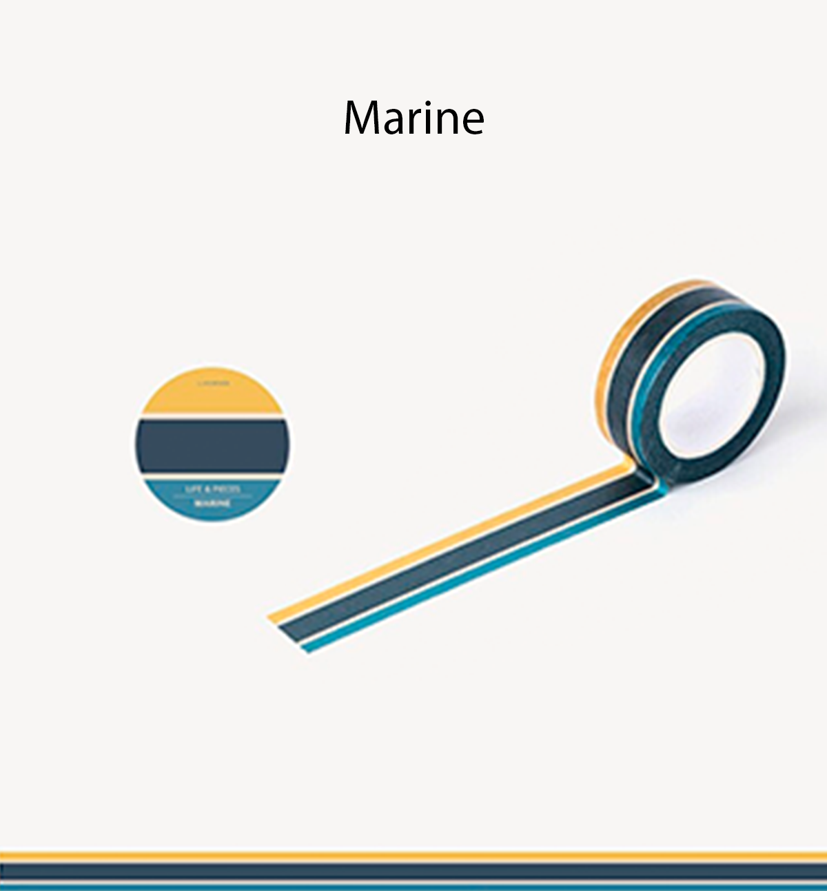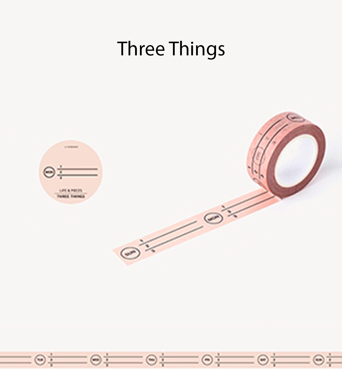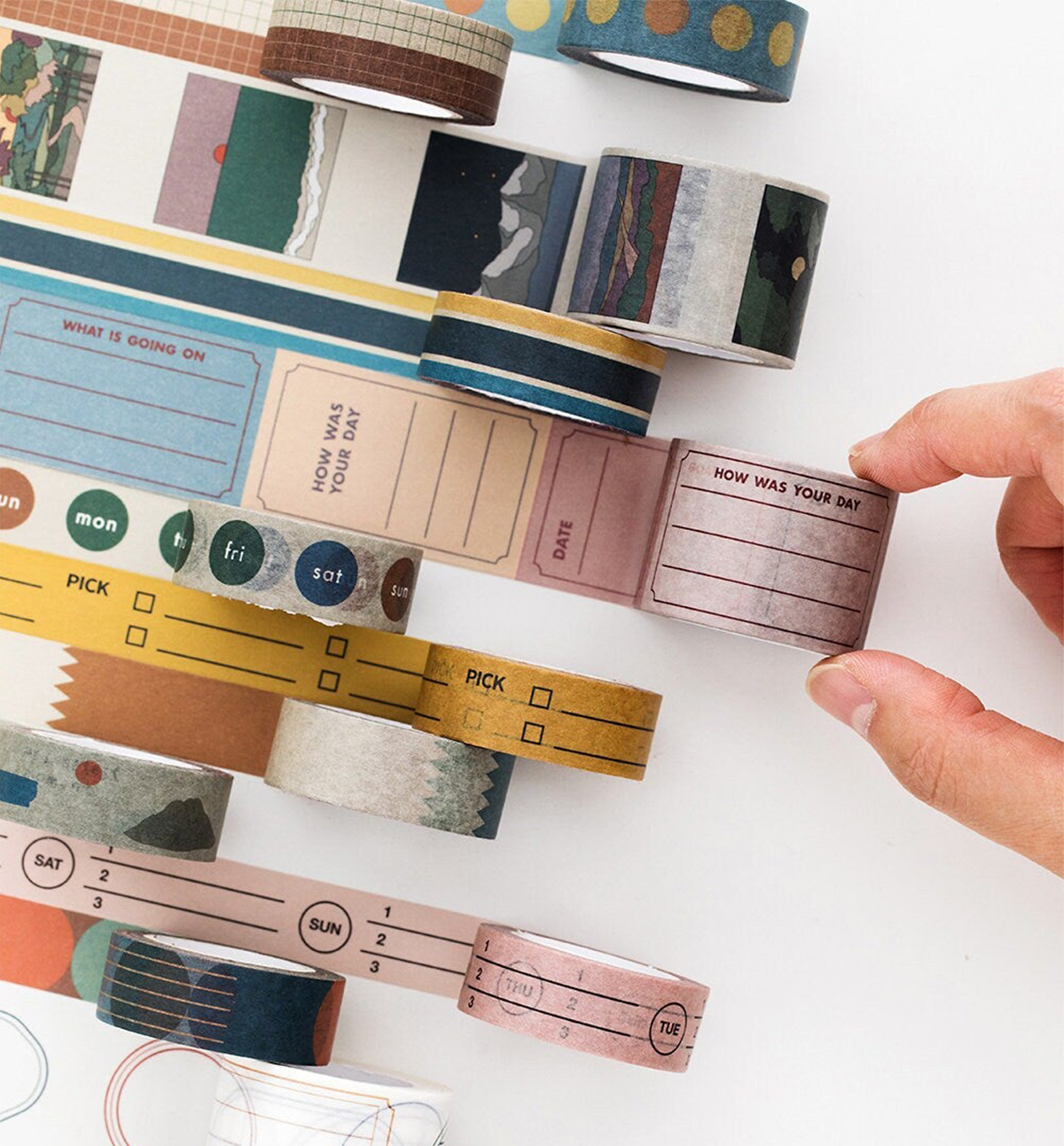 This beautiful washi tape comes in 11 different designs: Colorful, Moment, Brick, Marine, Pinking Shears, Ball, Three Things, Pick, Pick, Idea, Weekly and Live Today.