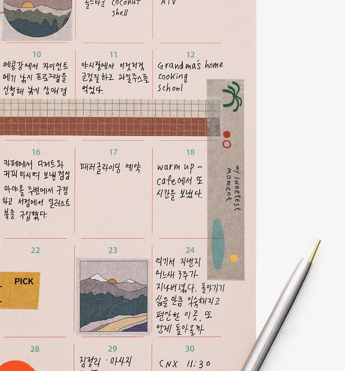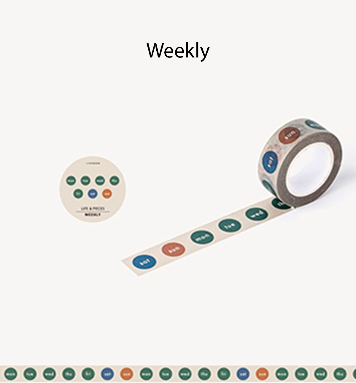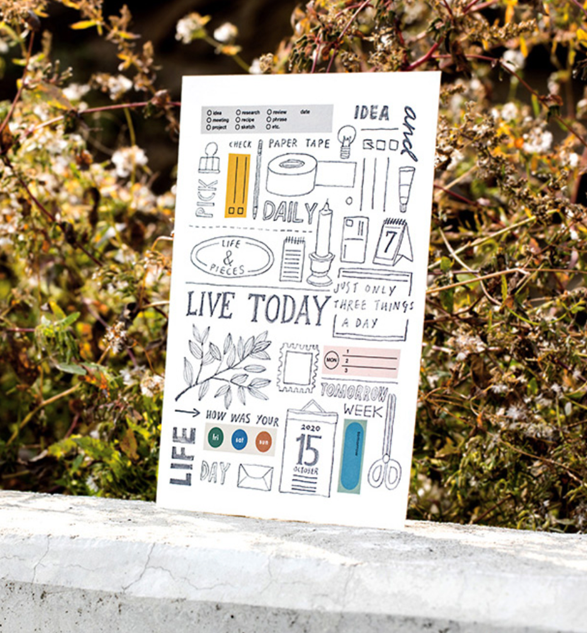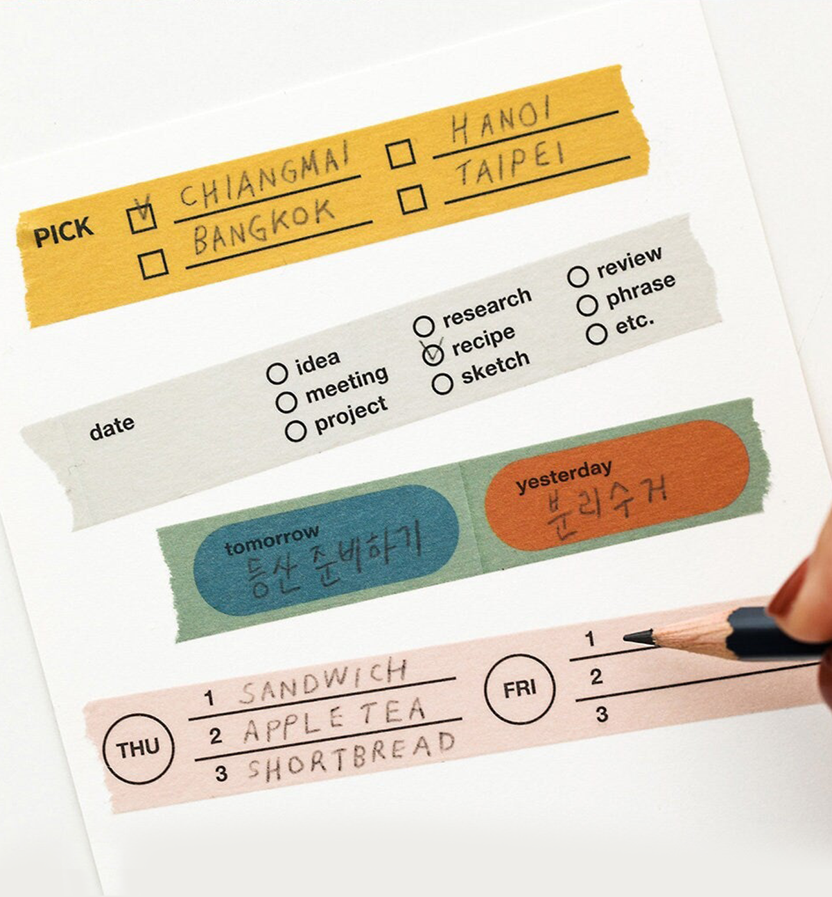 This beautiful washi tape comes in 11 different designs: Colorful, Moment, Brick, Marine, Pinking Shears, Ball, Three Things, Pick, Pick, Idea, Weekly and Live Today.