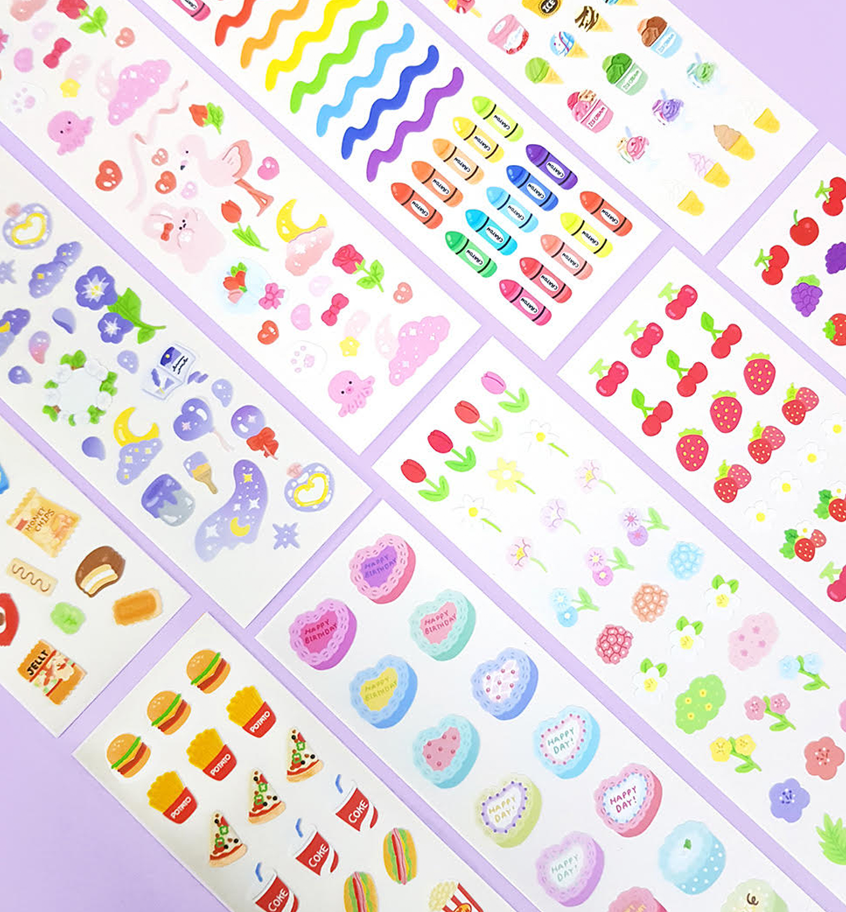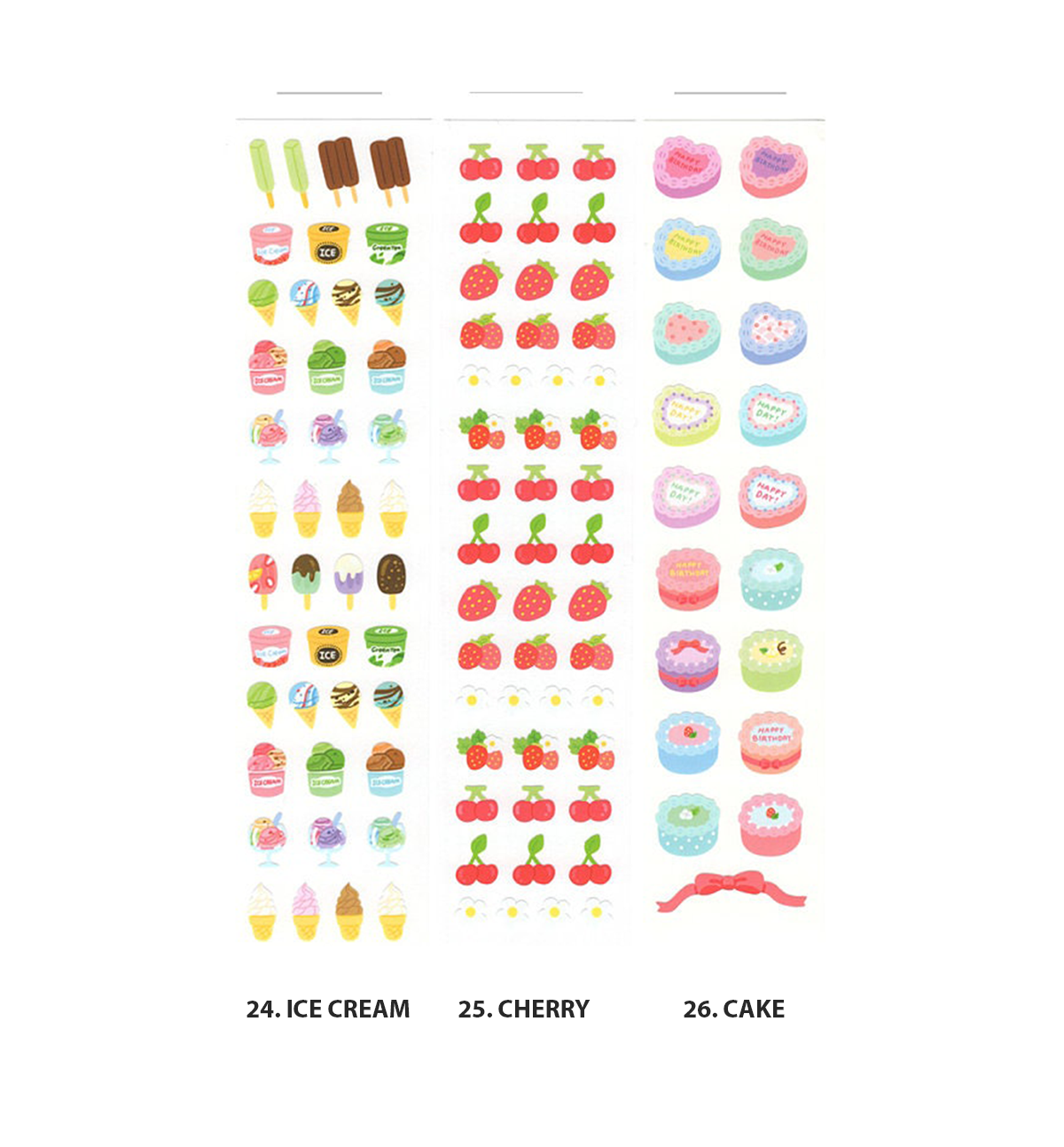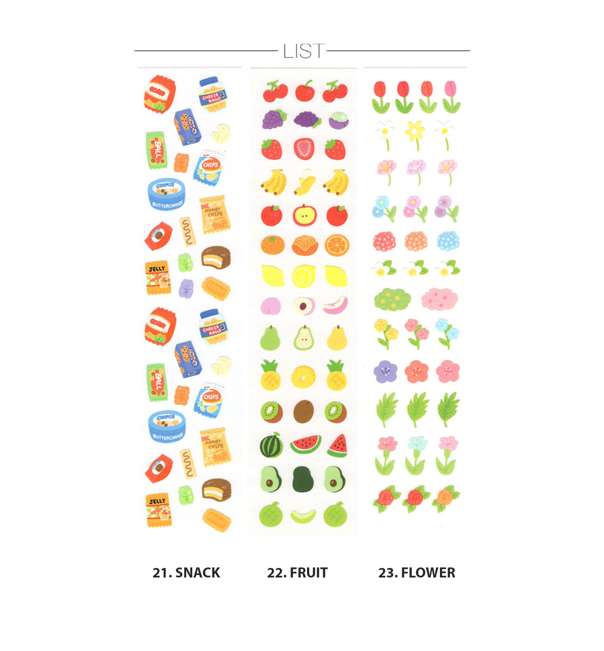 This beautiful Seal Stickers Deco comes in 9 different designs: 21. Snack, 22. Fruit, 23. Flower, 24. Ice Cream, 25. Cherry, 26. Cake, 27. Fast Food, 28. Pink Object, 29. Violet Object and 30. Crayon.