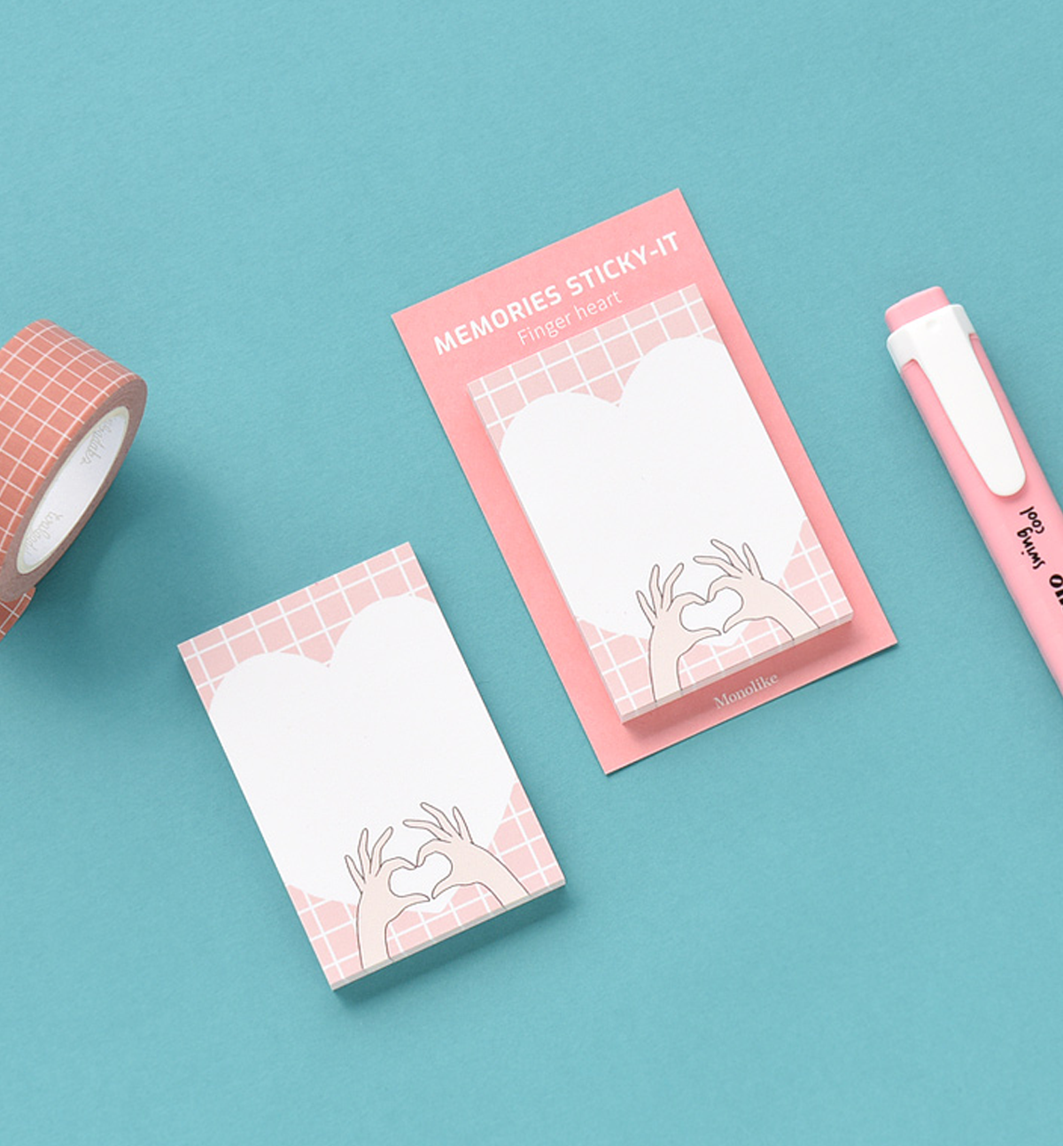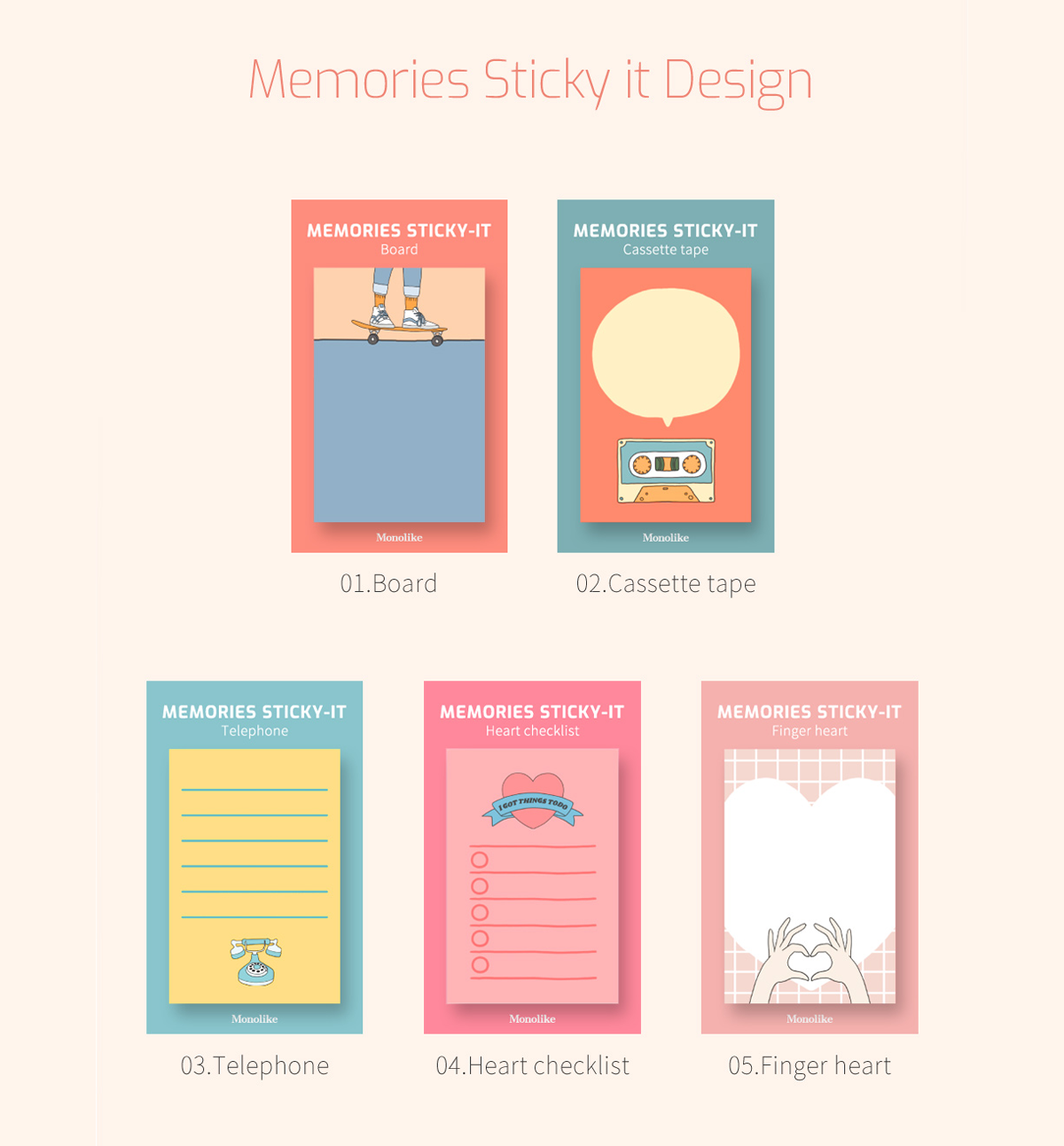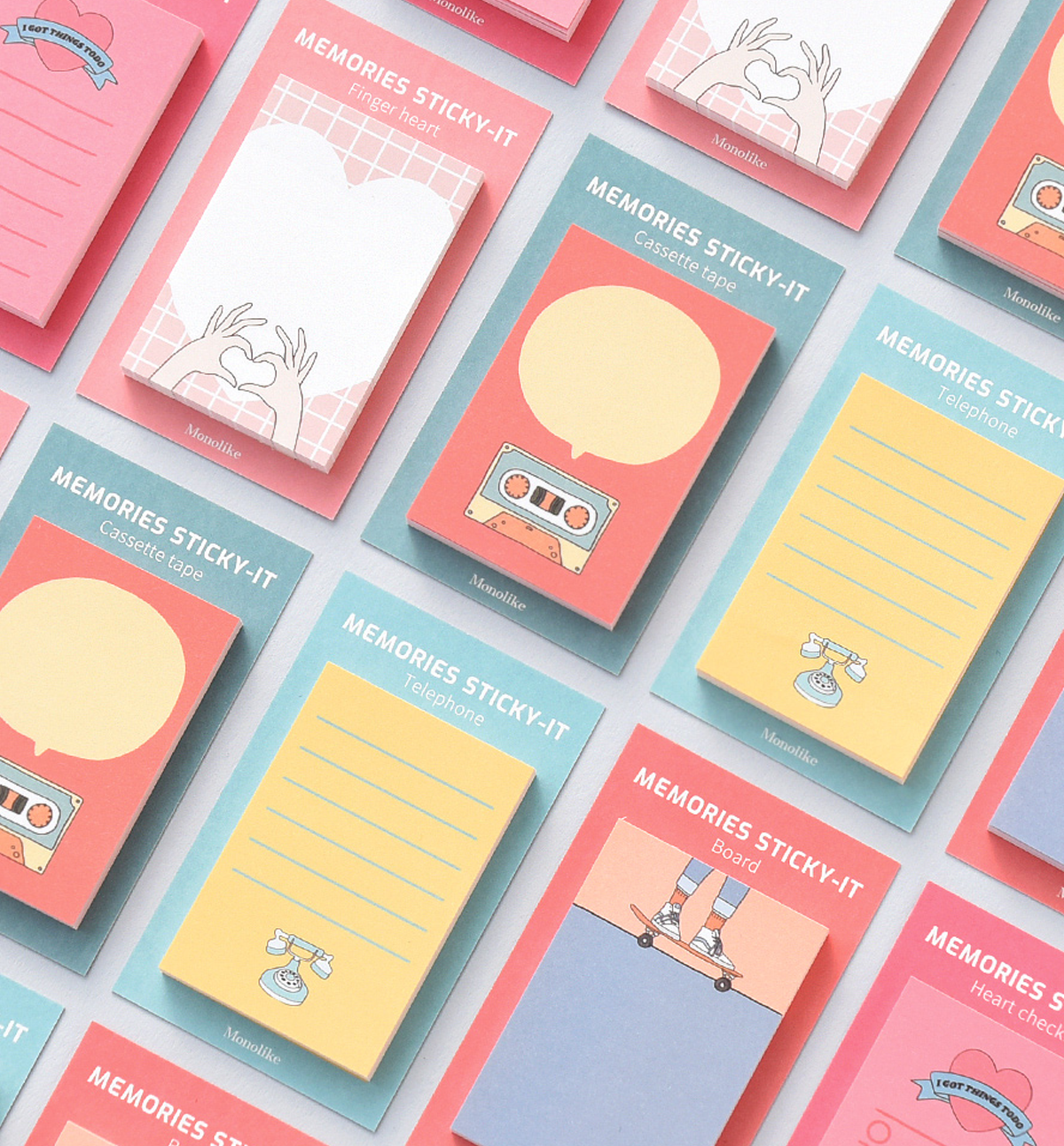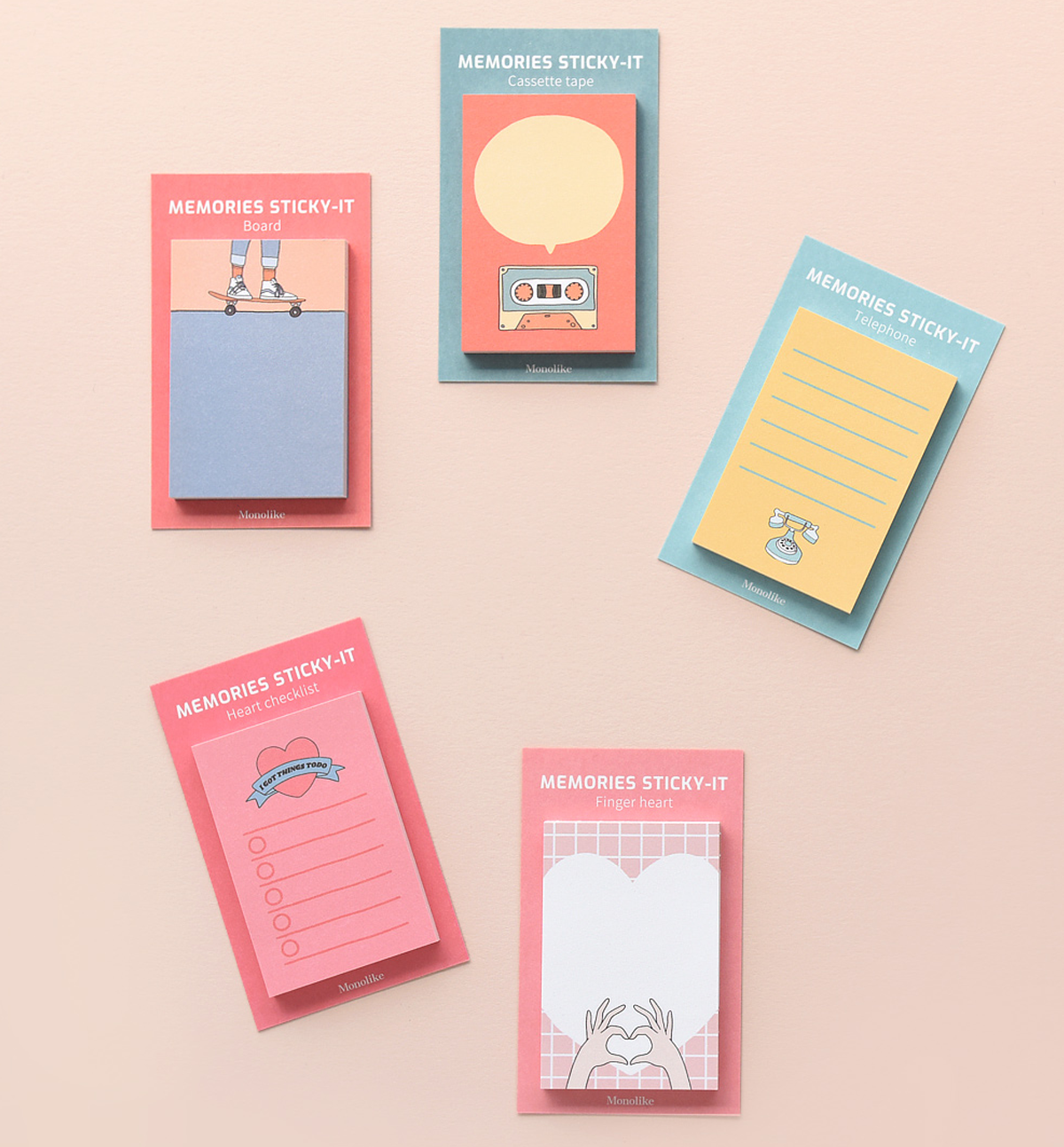 This beautiful sticky notes comes in 6 different colors: 01. Board, 02. Cassette Tape, 03. Telephone, 04. Heart Checklist and 05. Finger Heart. Please, see pictures for reference.