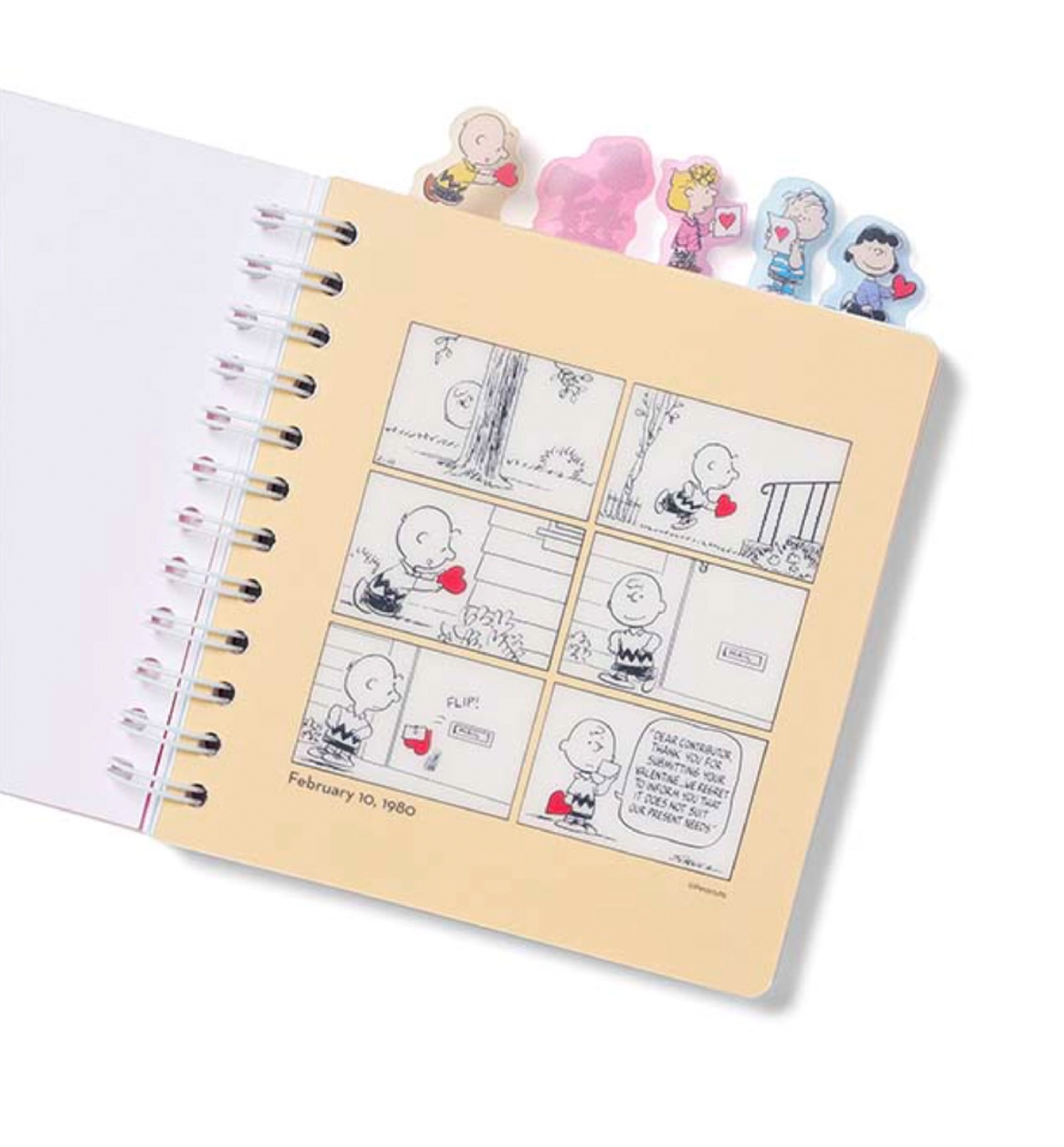 This beautiful Peanuts Snoopy Index Ring Notebook [Peanuts Color] comes with 5 index pages. Inside of the pages it is written "Love makes you do strange things".