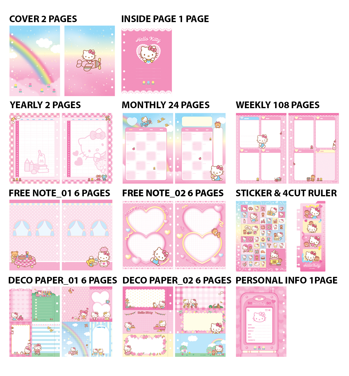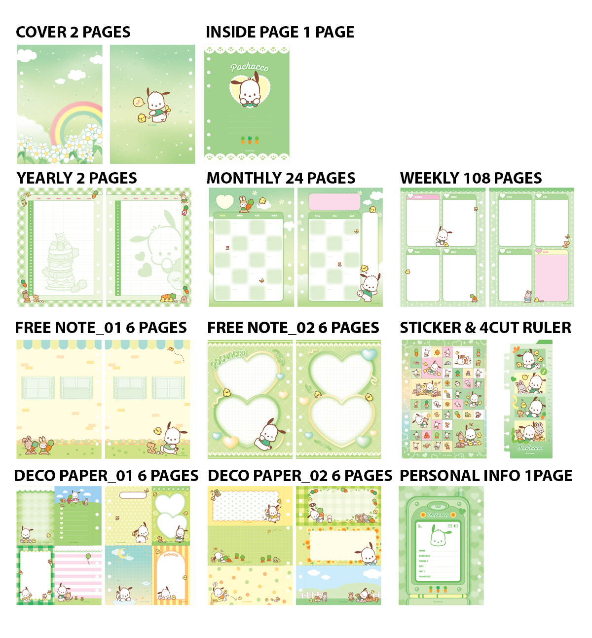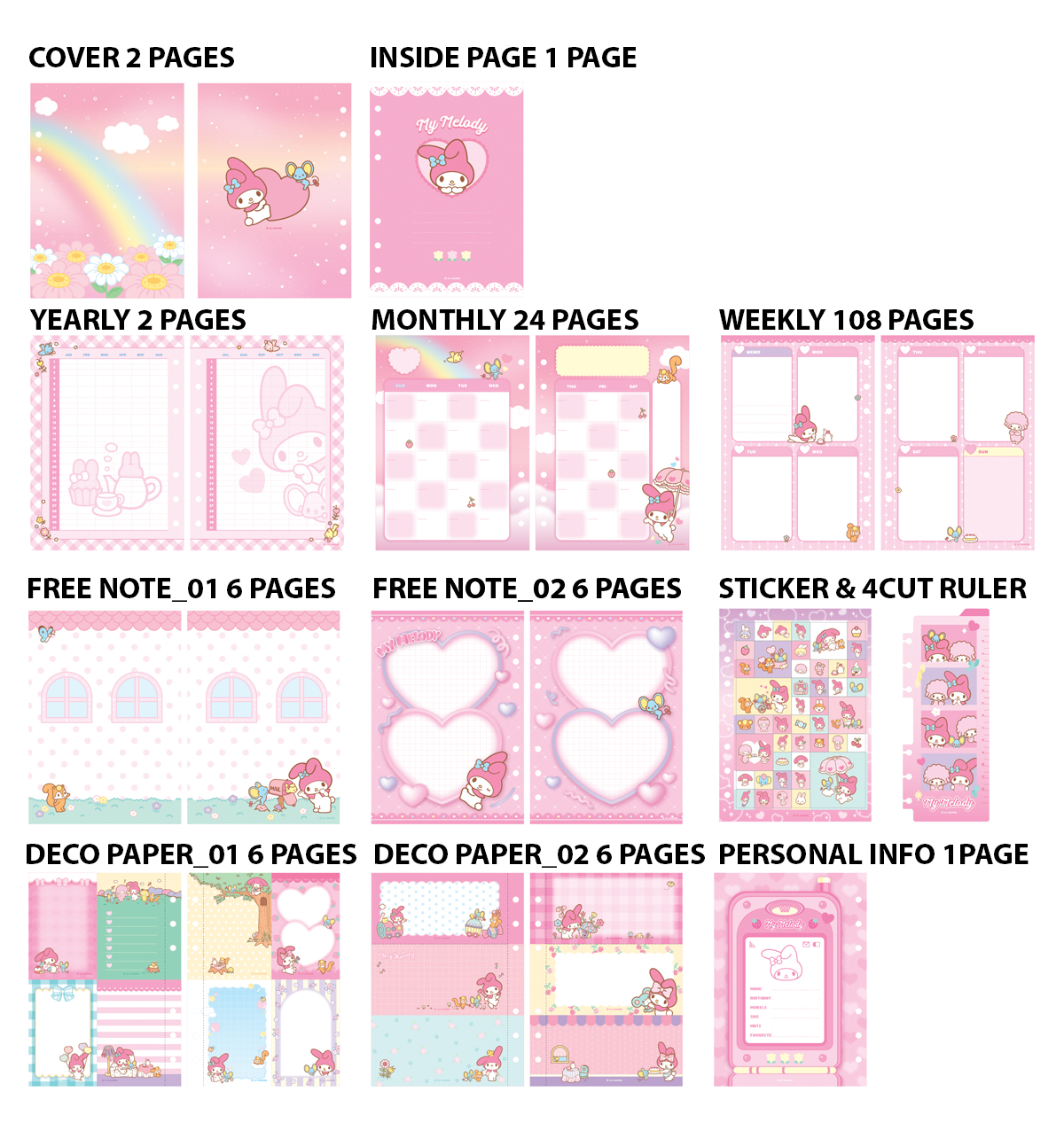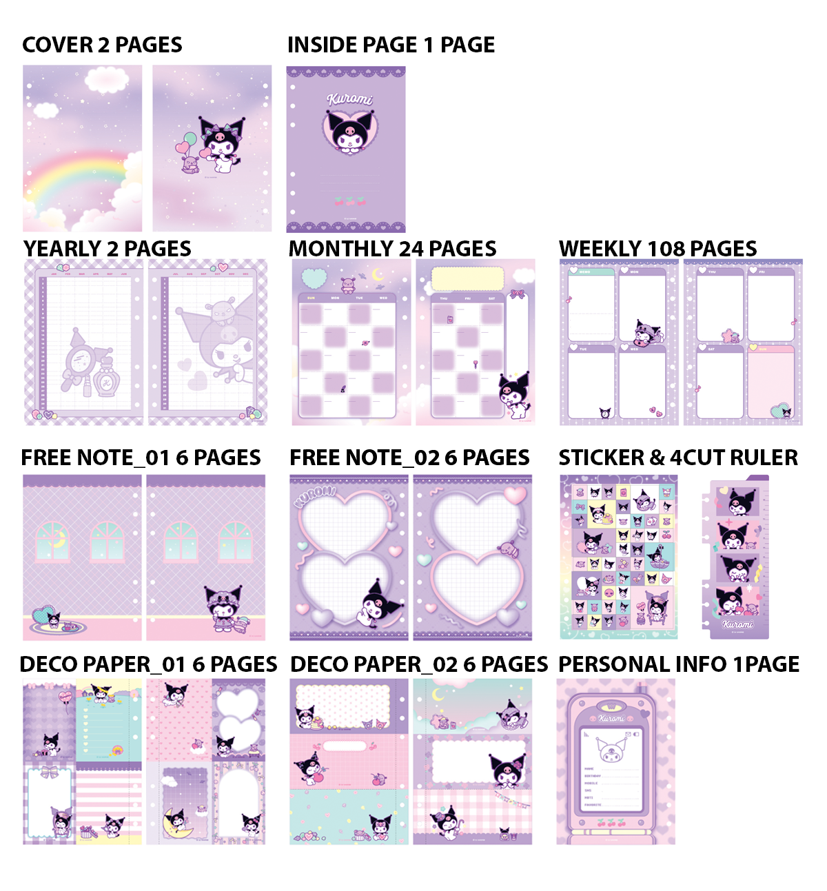 Inside pages designs is according to each cover design. For example: Kuromi cover page, inside pages will be all kuromi illustrated pages designs. Comes with a sheet of sticker and 4cut ruler. No other accessories included!