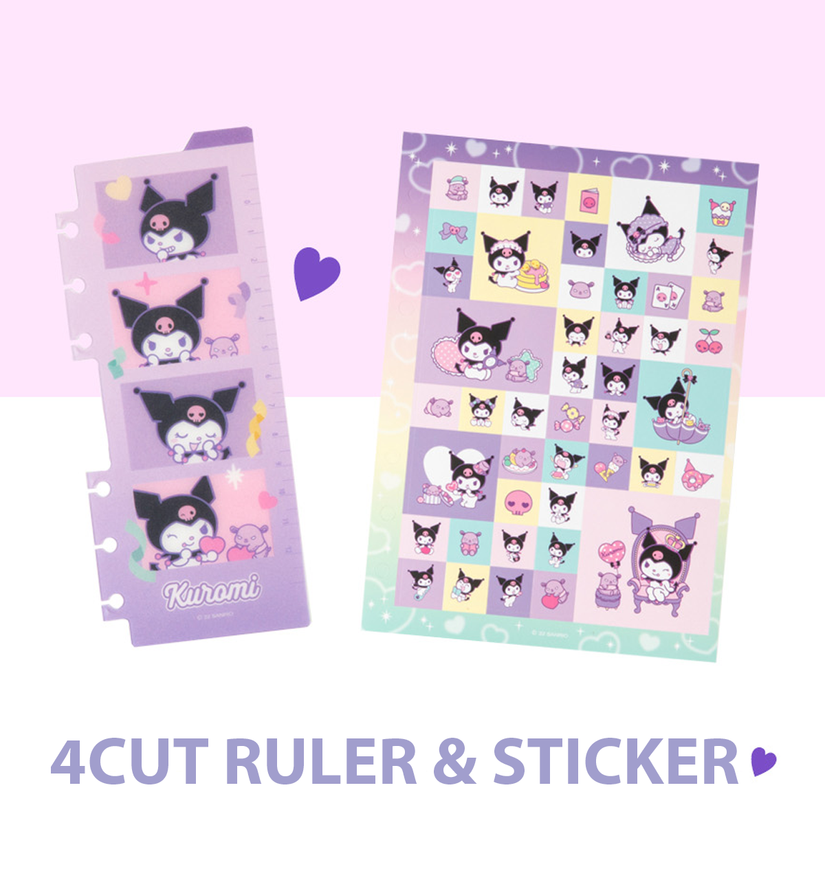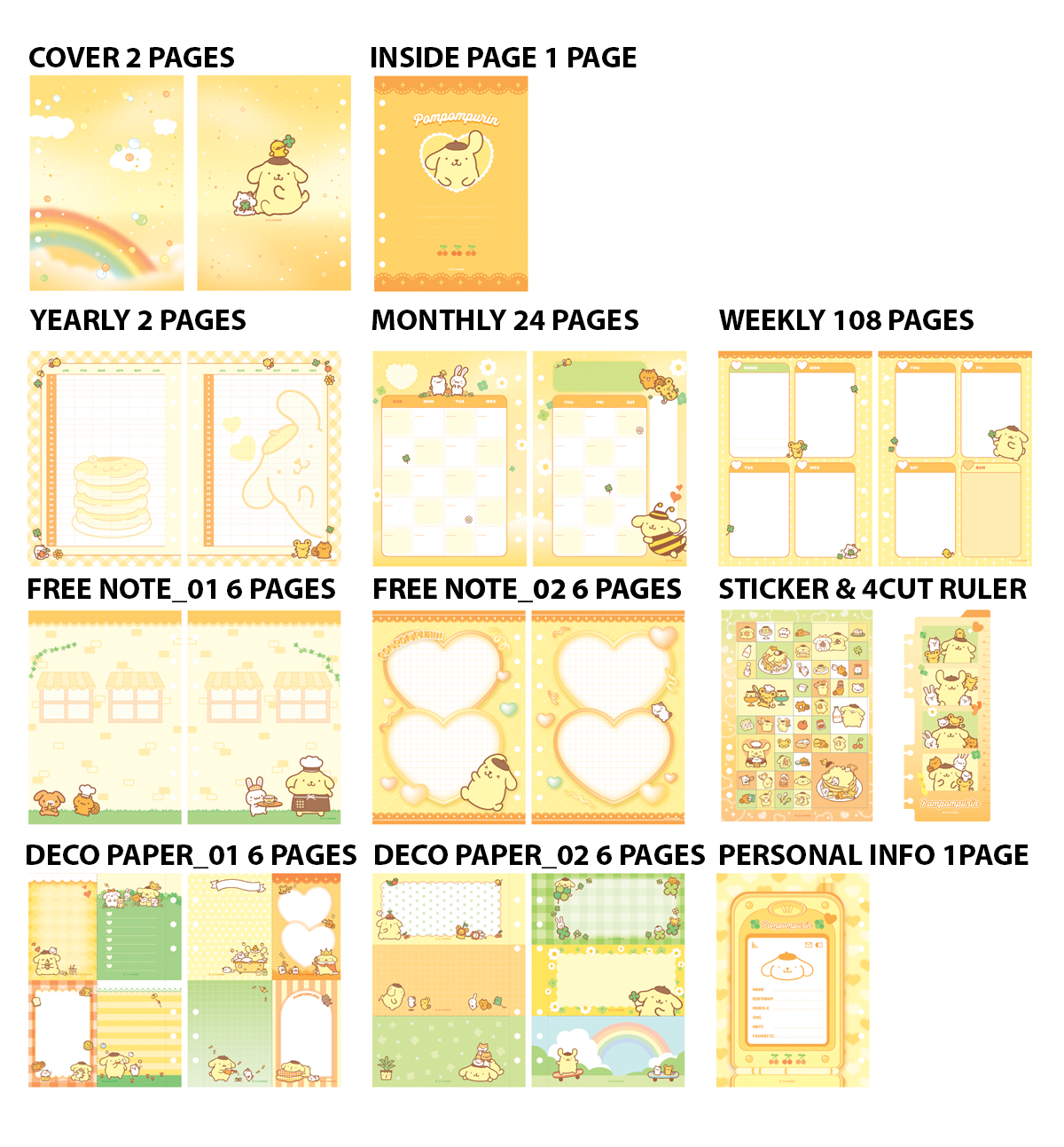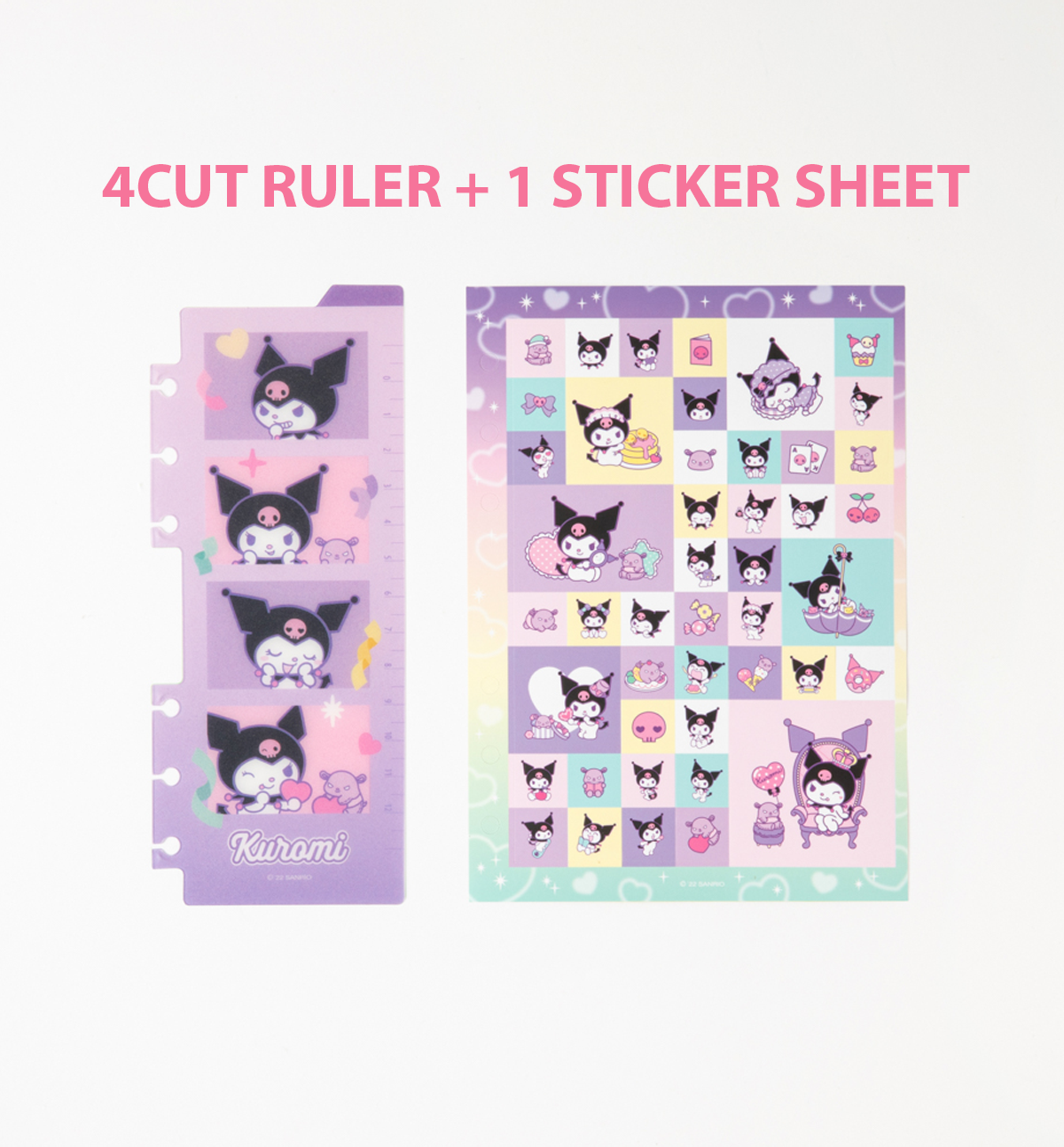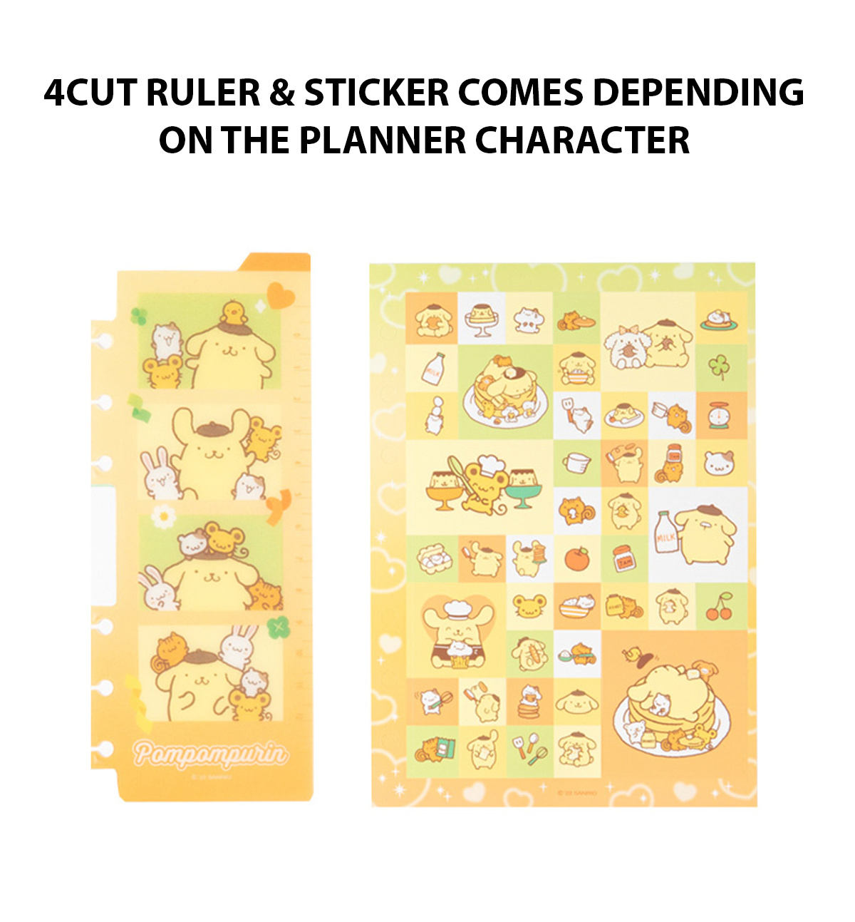Inside pages designs is according to each cover design. For example: Kuromi cover page, inside pages will be all kuromi illustrated pages designs. Comes with a sheet of sticker and 4cut ruler. No other accessories included!