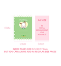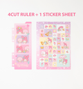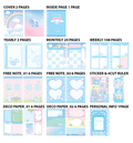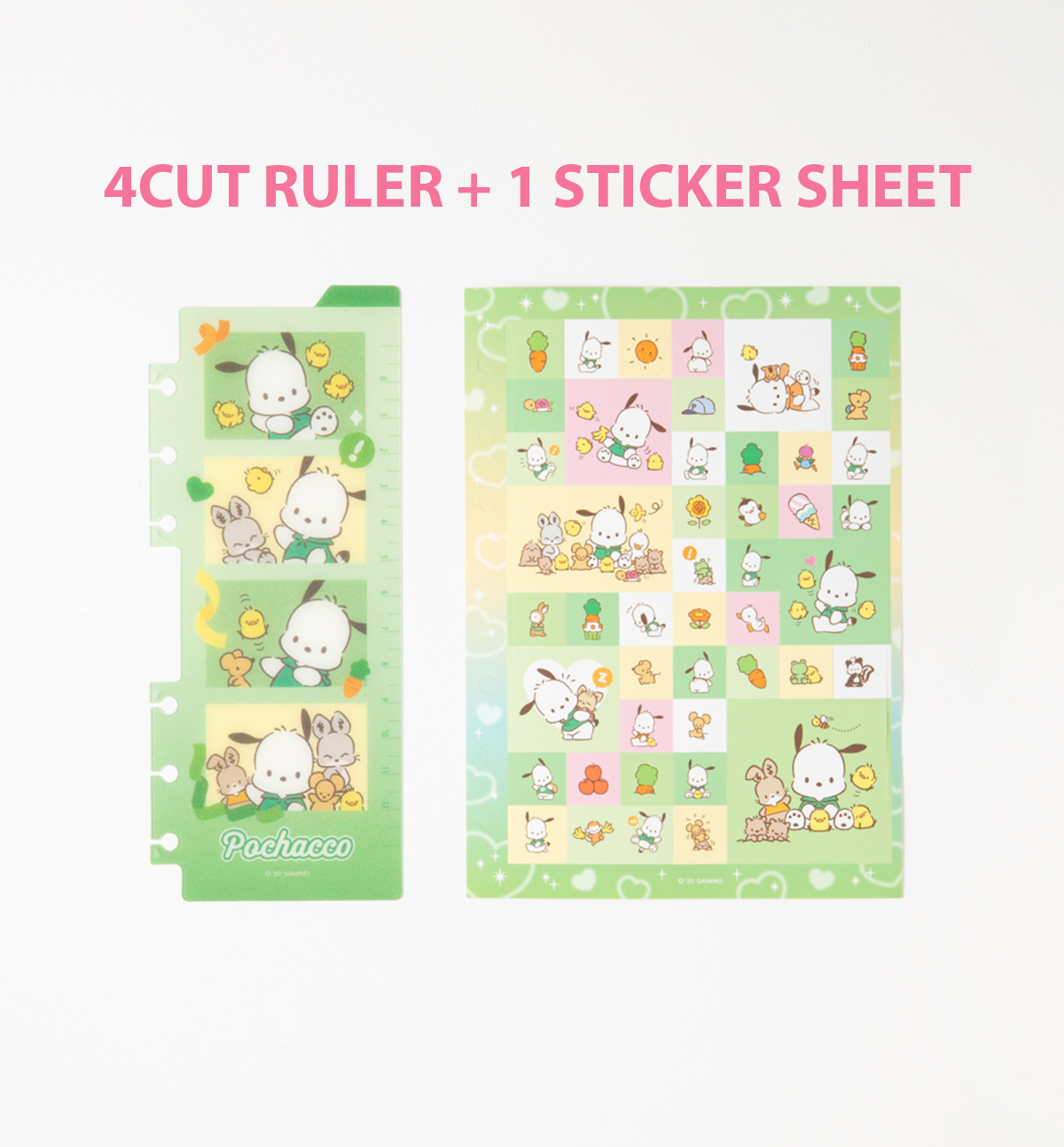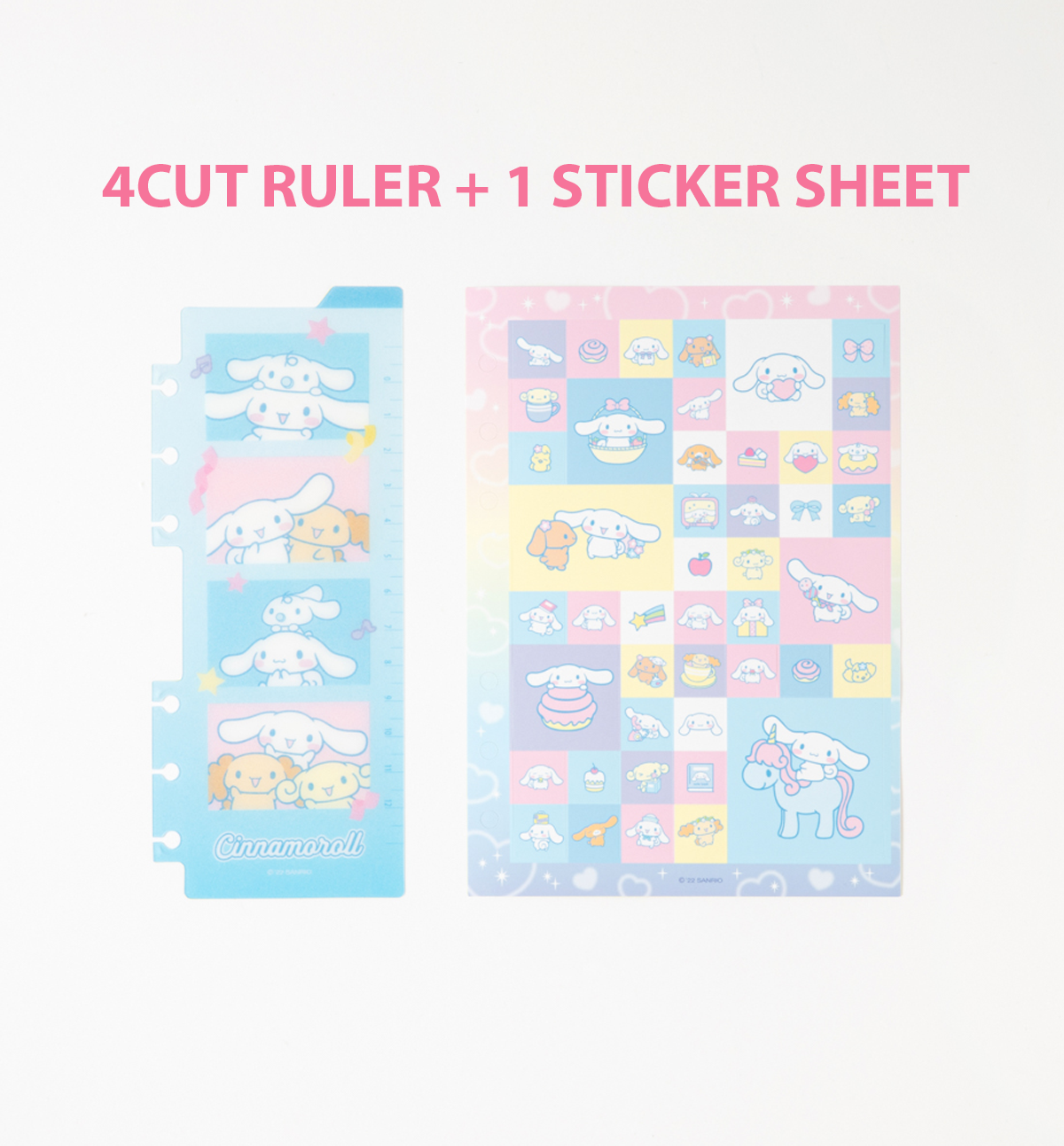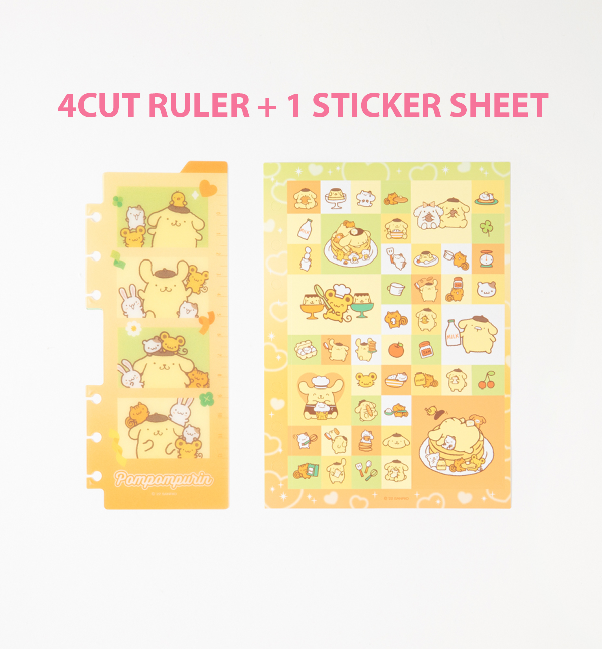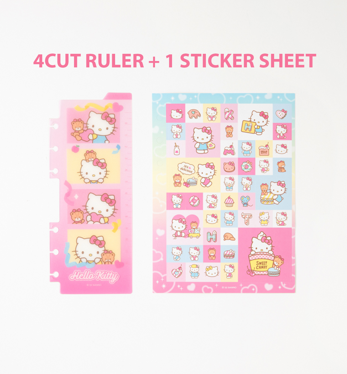 Inside pages designs is according to each cover design. For example: Kuromi cover page, inside pages will be all kuromi illustrated pages designs. Comes with a sheet of sticker and 4cut ruler. No other accessories included!