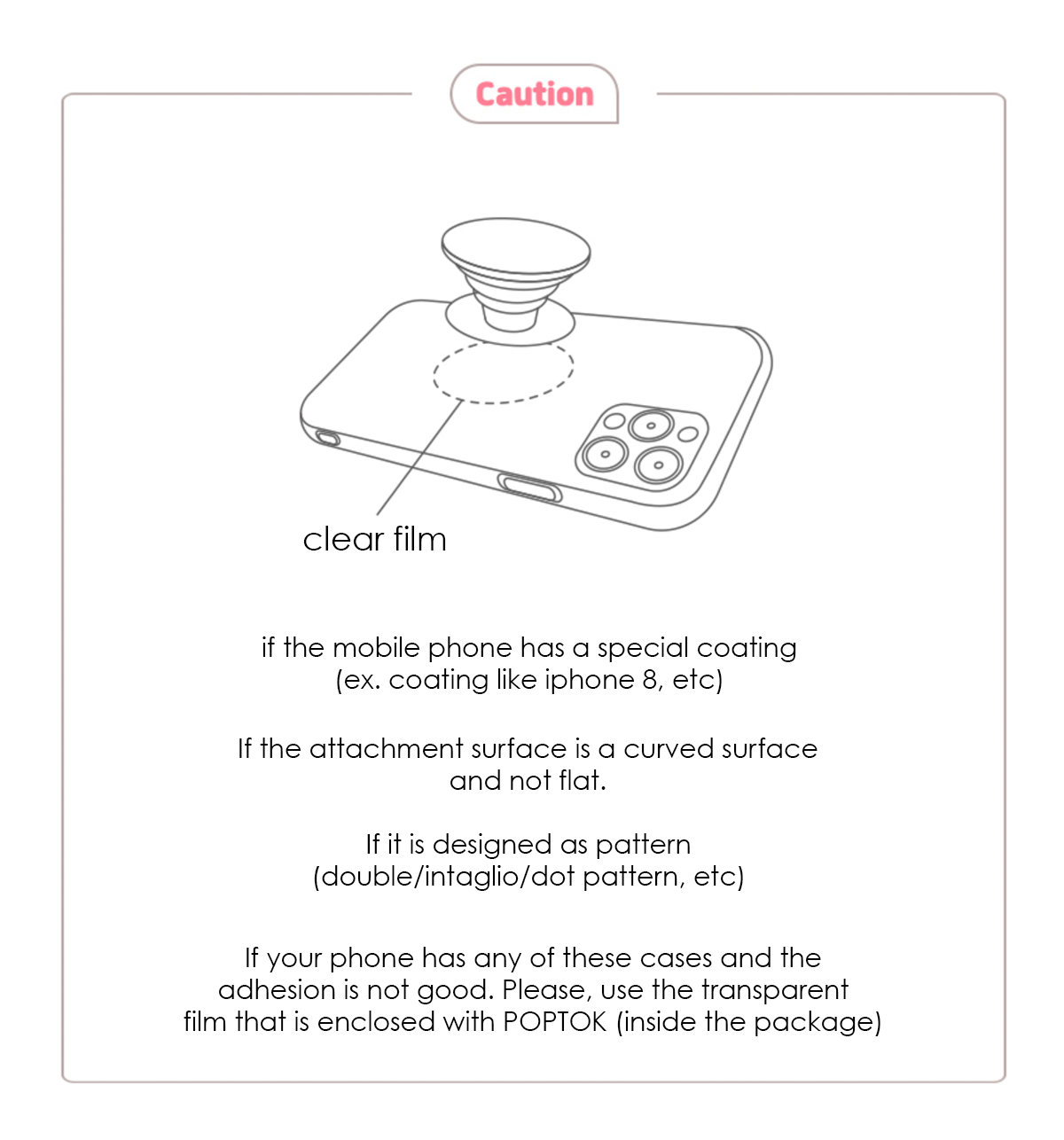 * If the mobile phone has a special coating (ex. coating like iphone 8, etc). If the attachment surface is a curved surface and not flat. If it is designed as pattern (double, intaglio, dot pattern, etc). If this is one of these cases, please use the transparent film that is enclosed with POPTOK (inside the package)