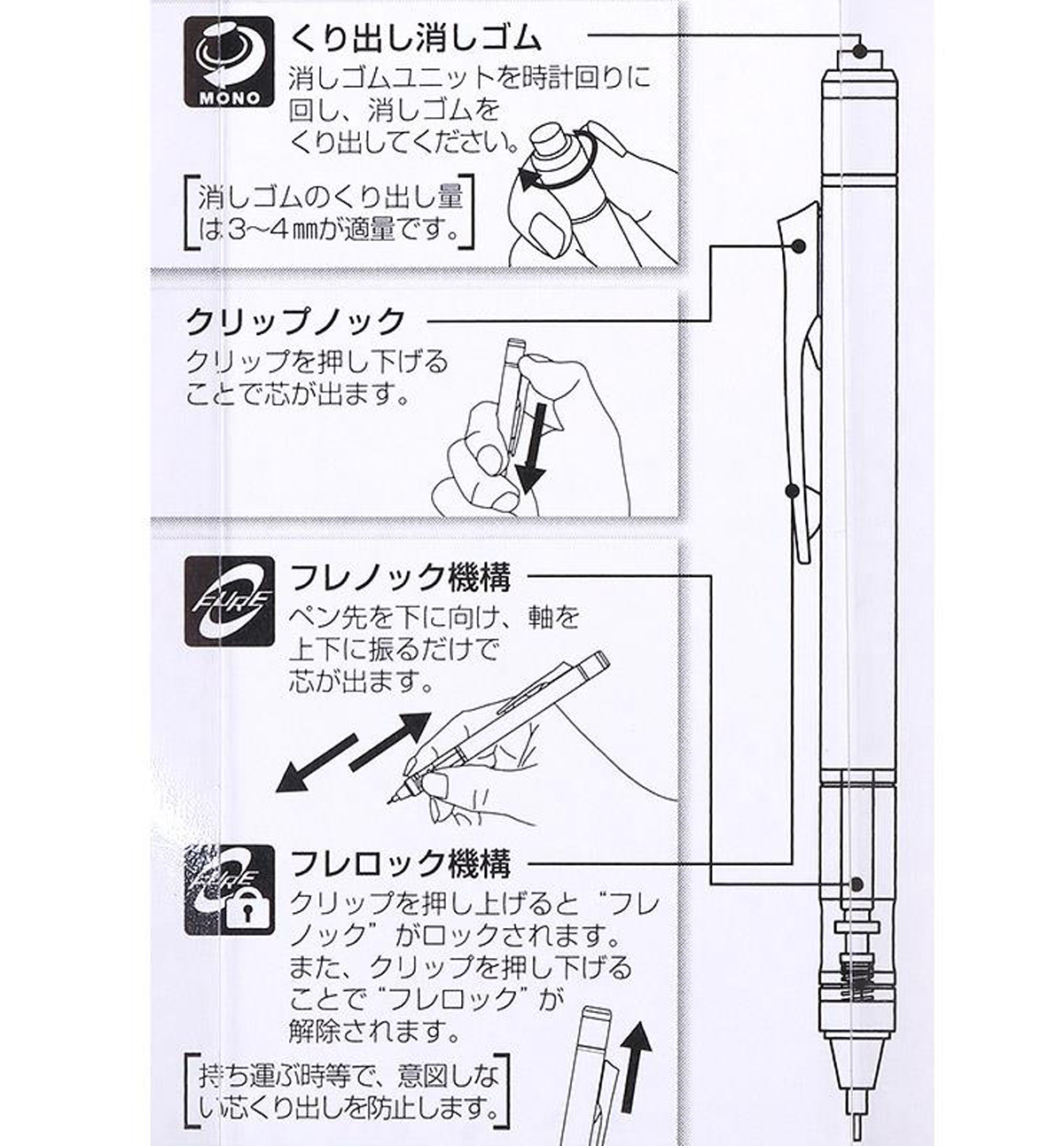 In addition to its exceptional design and lead-handling capabilities, this mechanical pencil includes one of Japan's most popular erasers, the renowned MONO Eraser. This eraser is celebrated for its superior quality and effectiveness in erasing pencil marks cleanly and efficiently.