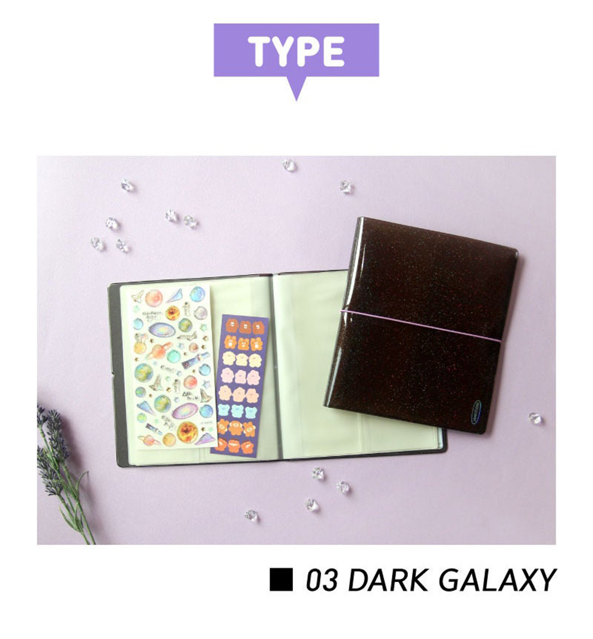This beautiful sticker book comes in 3 different colors: 01. Milky Way, 02. Aurora Purple and 03. Dark Galaxy.