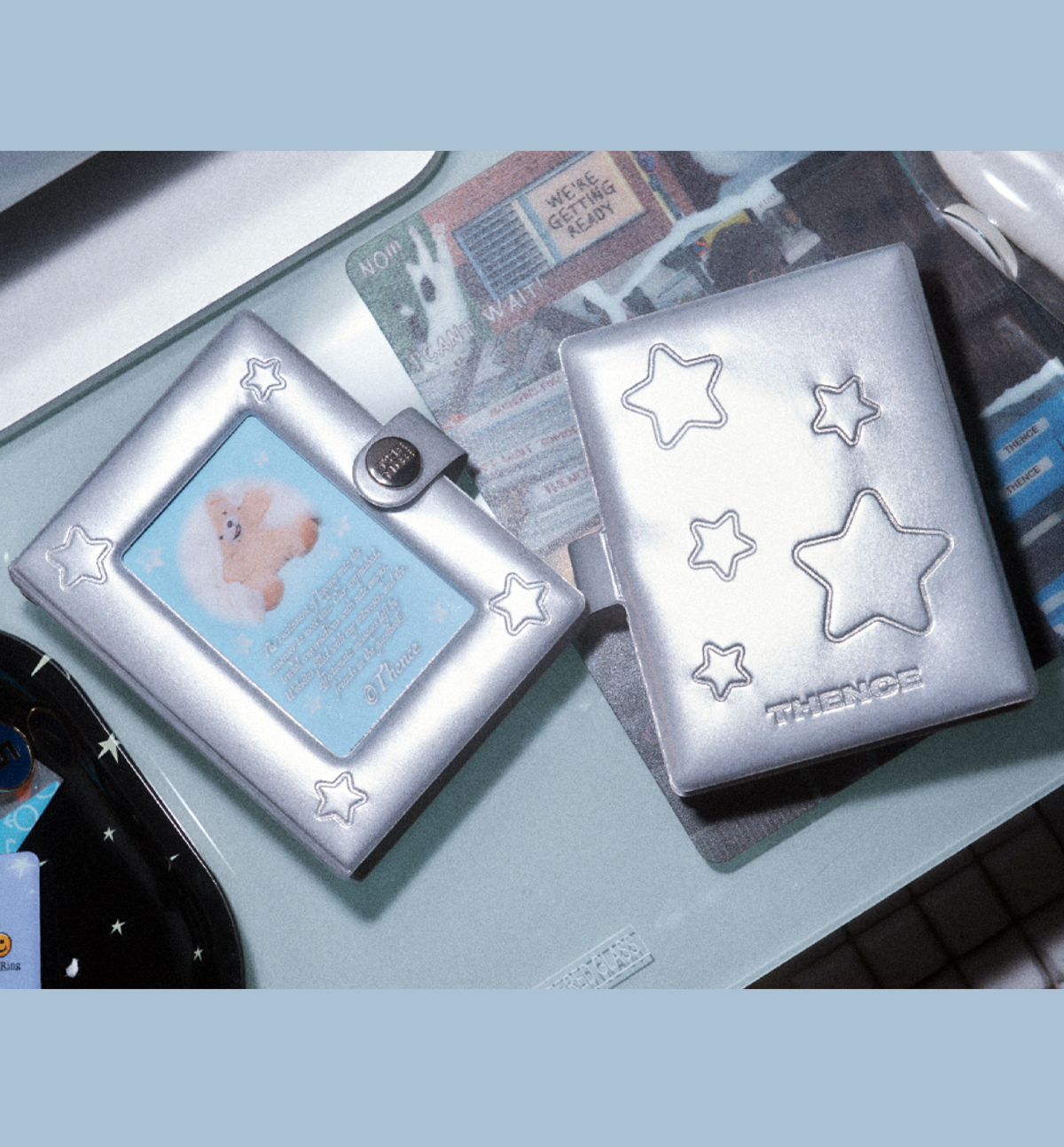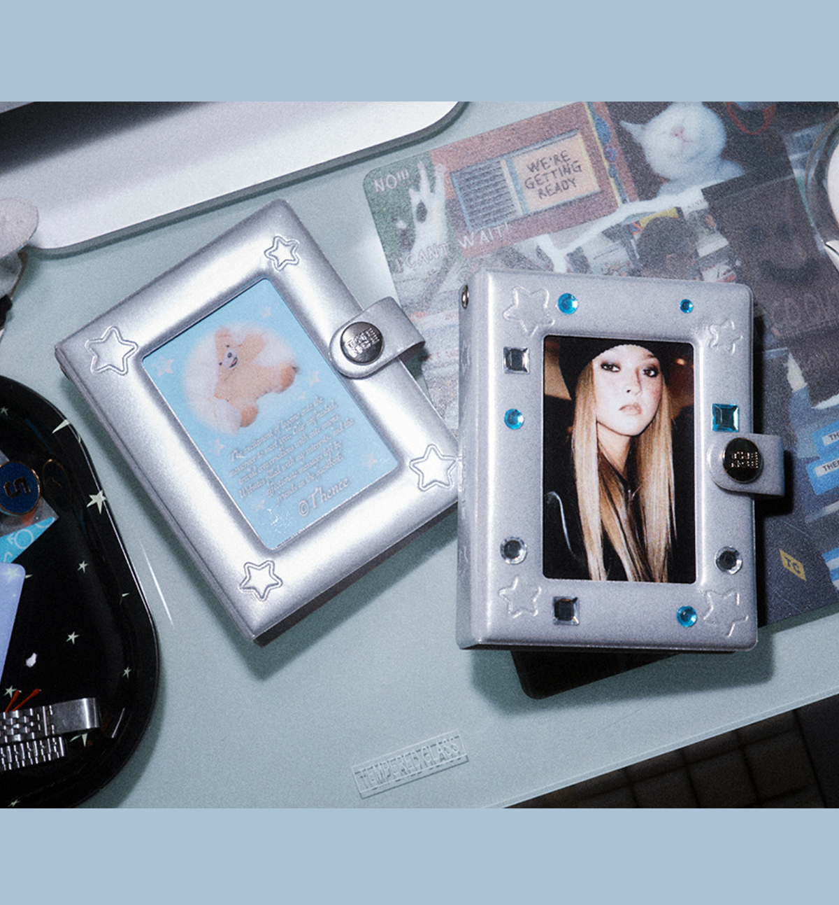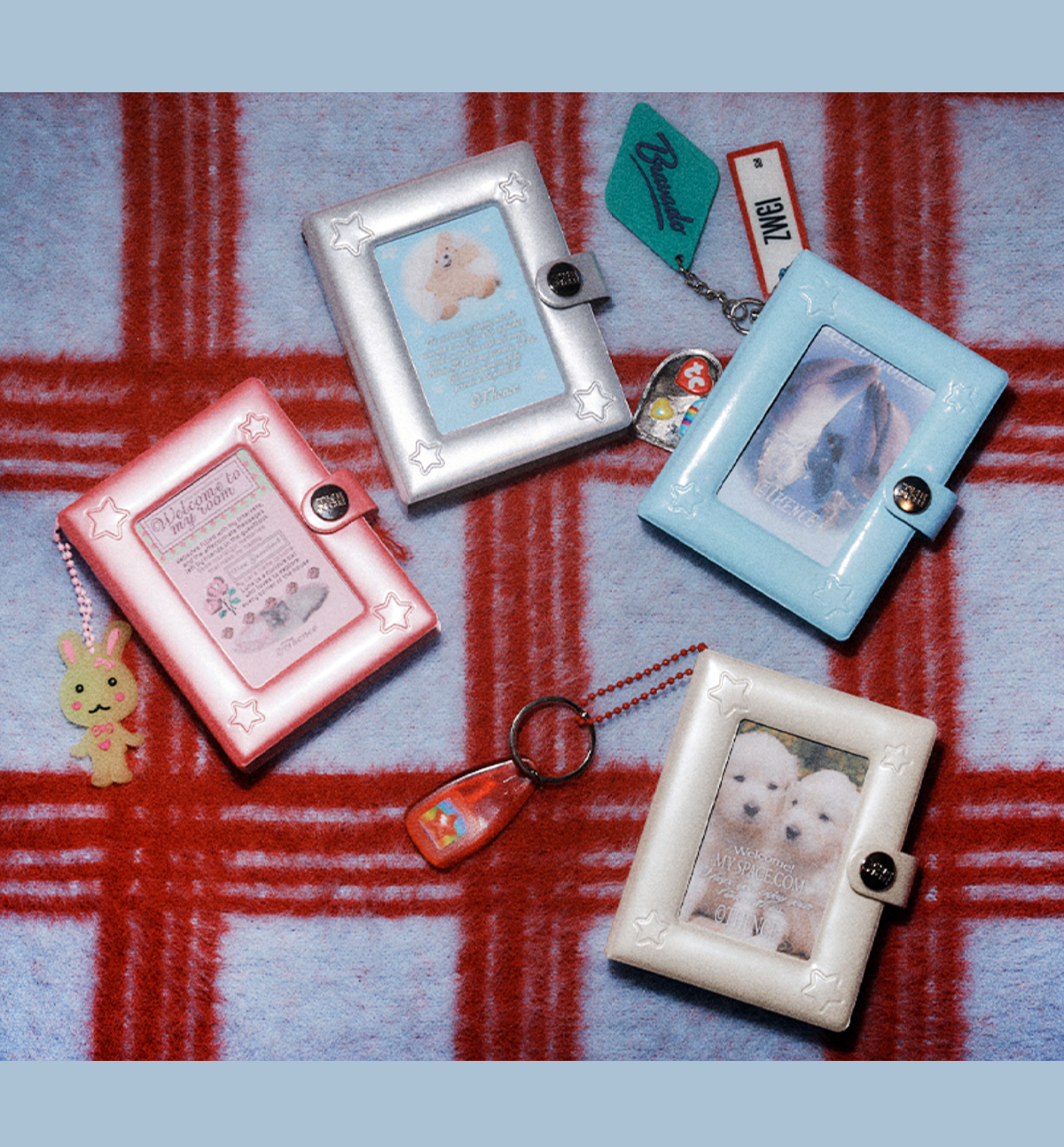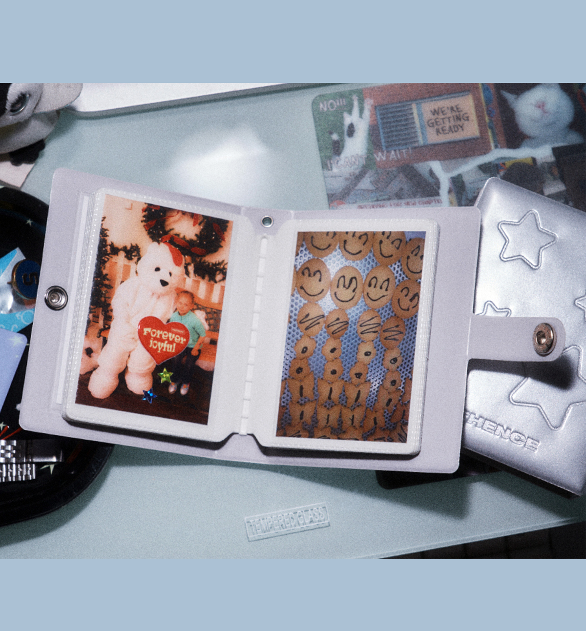 This is a collectible book where you can collect whatever you want, such as photo, postcards and recipes in the size of 5.5 x 8.5cm. Unlike conventional PVC material, it is a made of enamel material with small pearl particles. The front and back have a star-shaped pattern embossed on them.