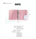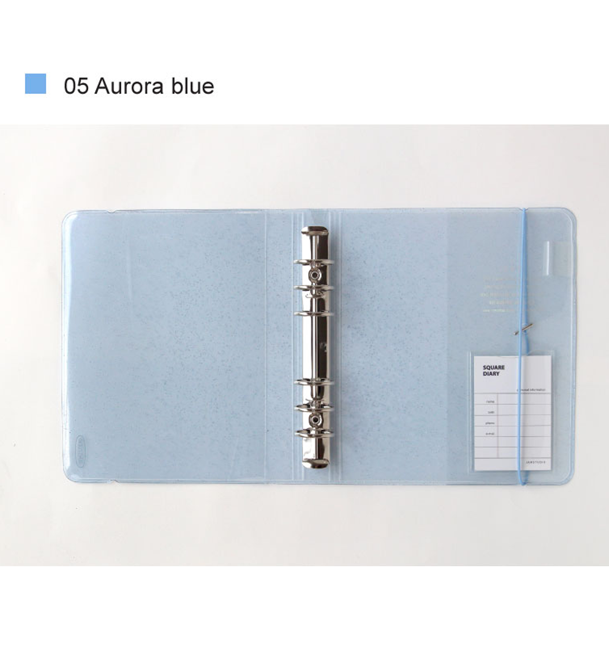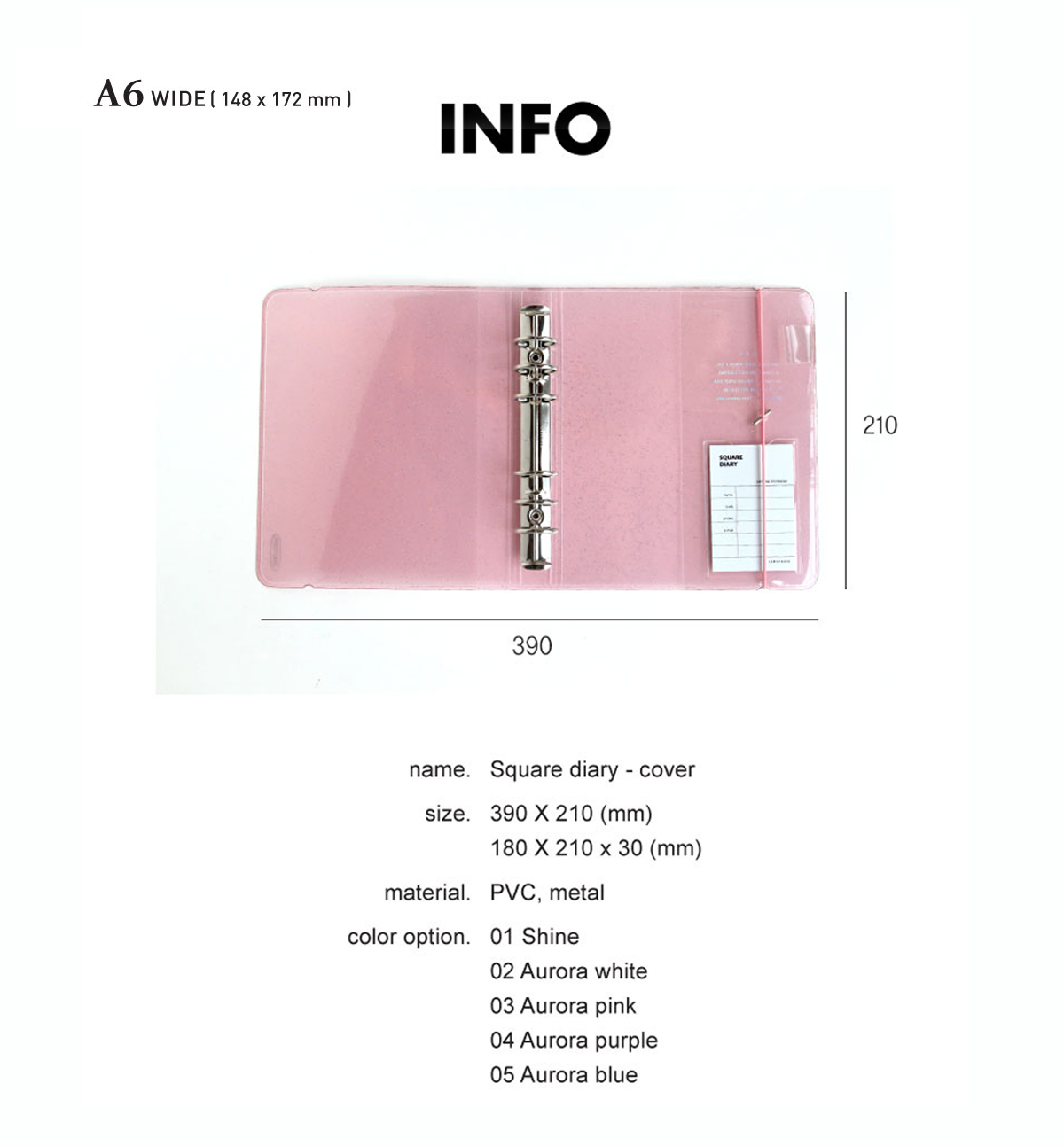 This beautiful Square Diary Binder [A6 Wide] comes in 5 different colors: 01. Shine, 02. Aurora White, 03. Aurora Pink, 04. Aurora Purple and 05. Aurora Blue.