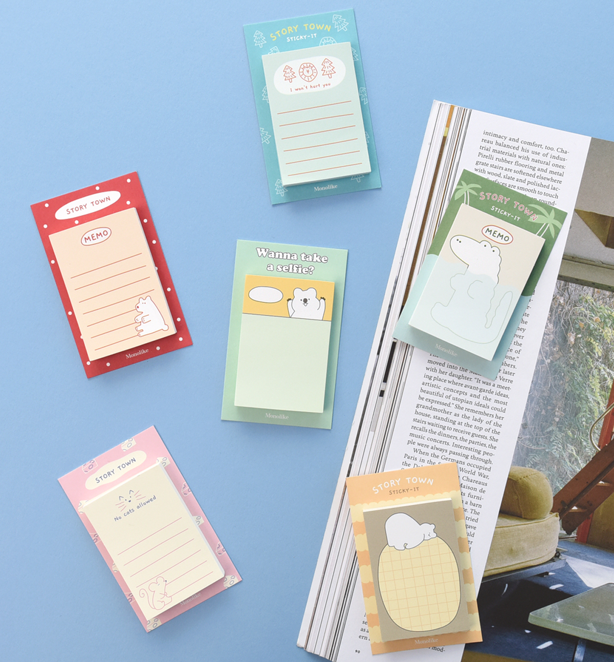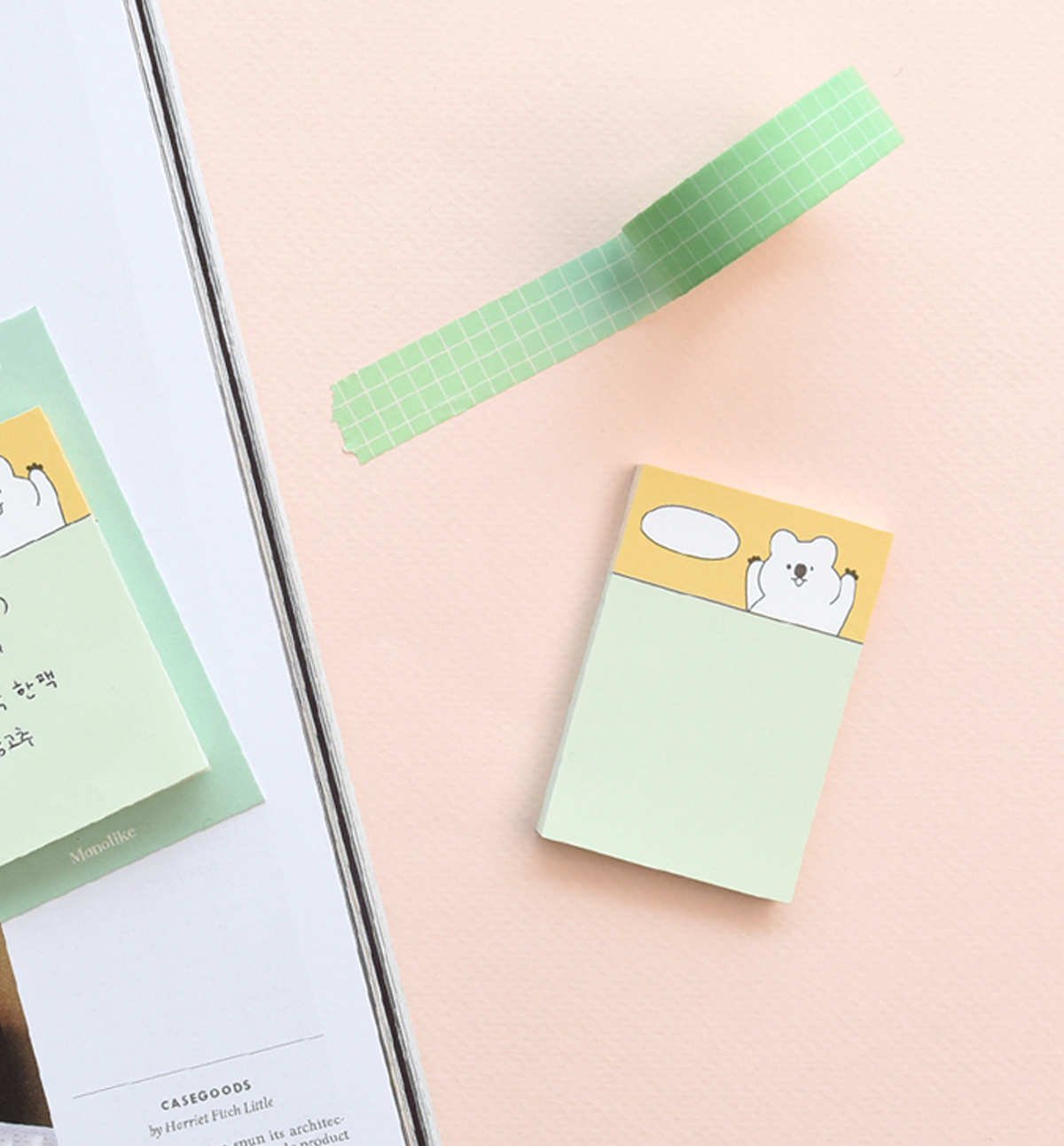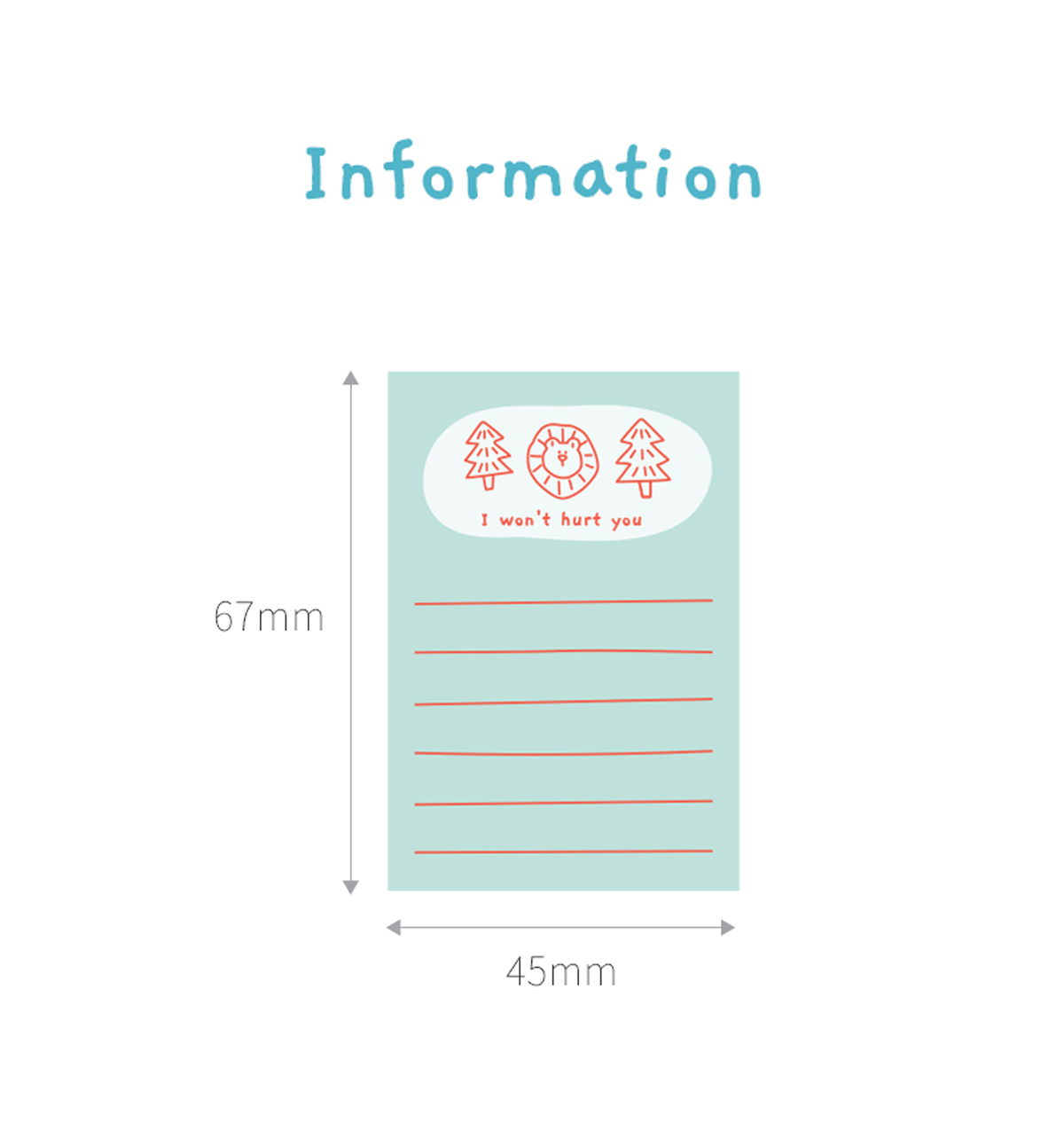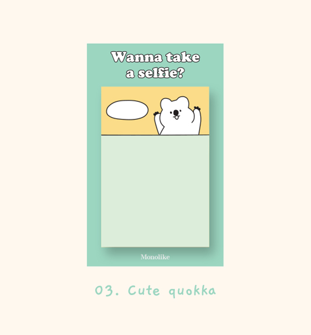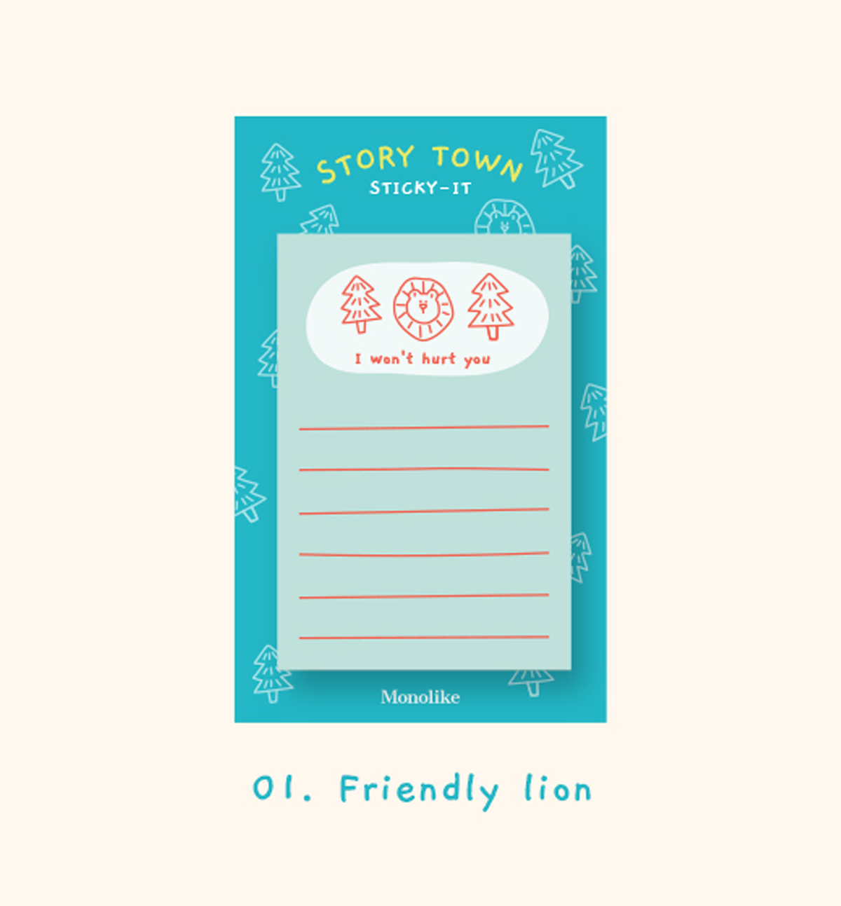 This beautiful sticky notes comes in 6 different colors: 01. Friendly Lion, 02 Cat n Mouse, 03. Cute Quokka, 04. Lazy Bear, 05. Toy Bear and 06. Crocodile. Please, see pictures for reference.