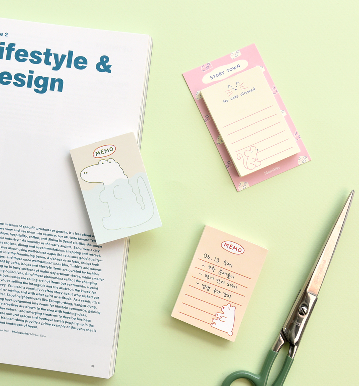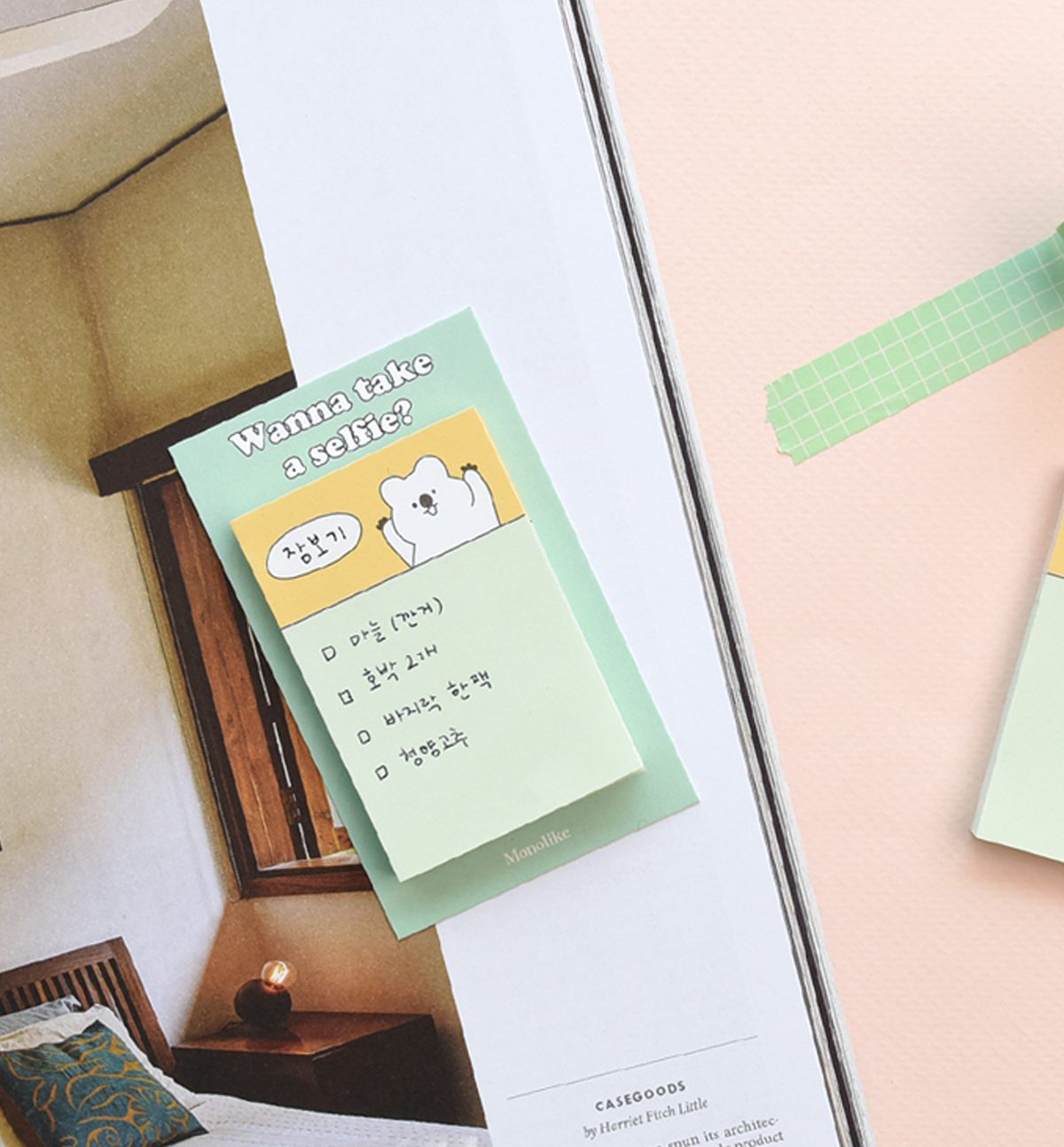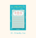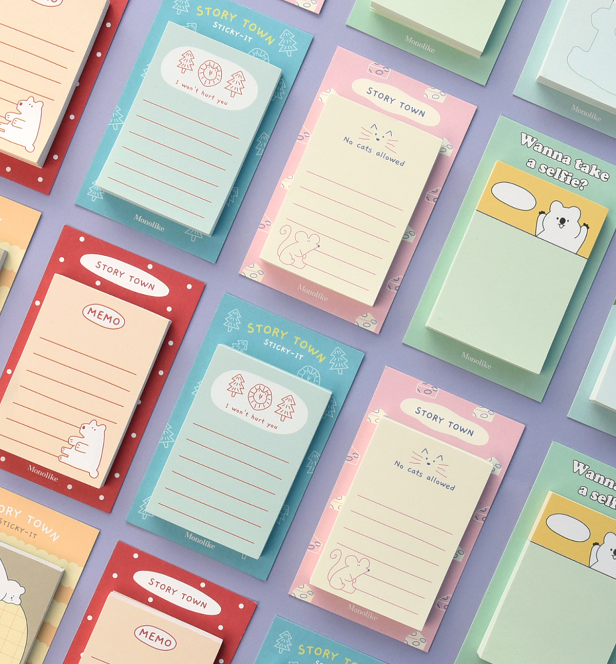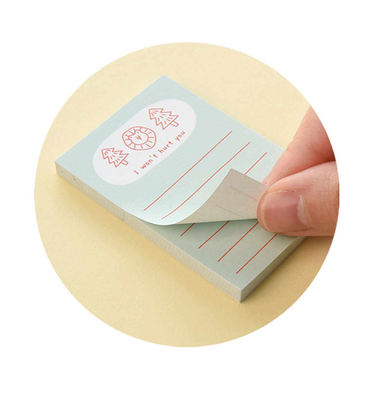This beautiful sticky notes comes in 6 different colors: 01. Friendly Lion, 02 Cat n Mouse, 03. Cute Quokka, 04. Lazy Bear, 05. Toy Bear and 06. Crocodile. Please, see pictures for reference.