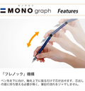 The pen tip is a fixed pipe type designed for drafting, which provides a wide field of view at the hand and allows for stable and precise writing. Shake to advance the lead (Fre-knock mechanism). Prevent accidental knocking (Fre-lock mechanism). Twist to advance the "Mono eraser".