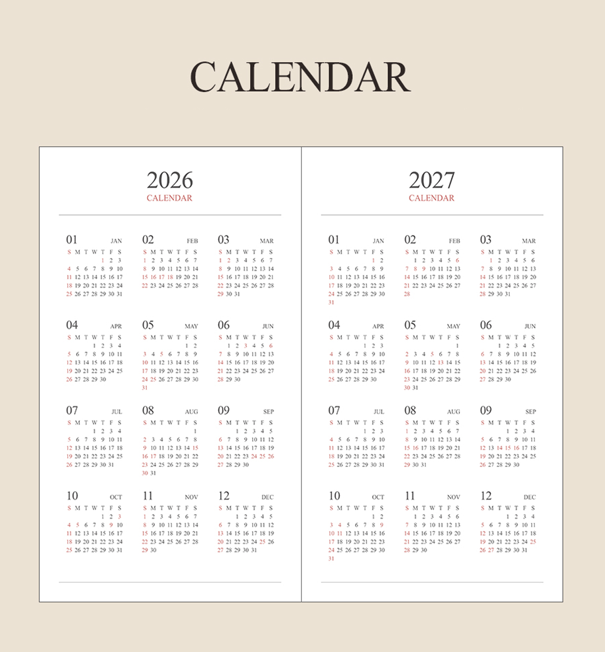 • 2026 & 2027 Year Calendar: 2 pages